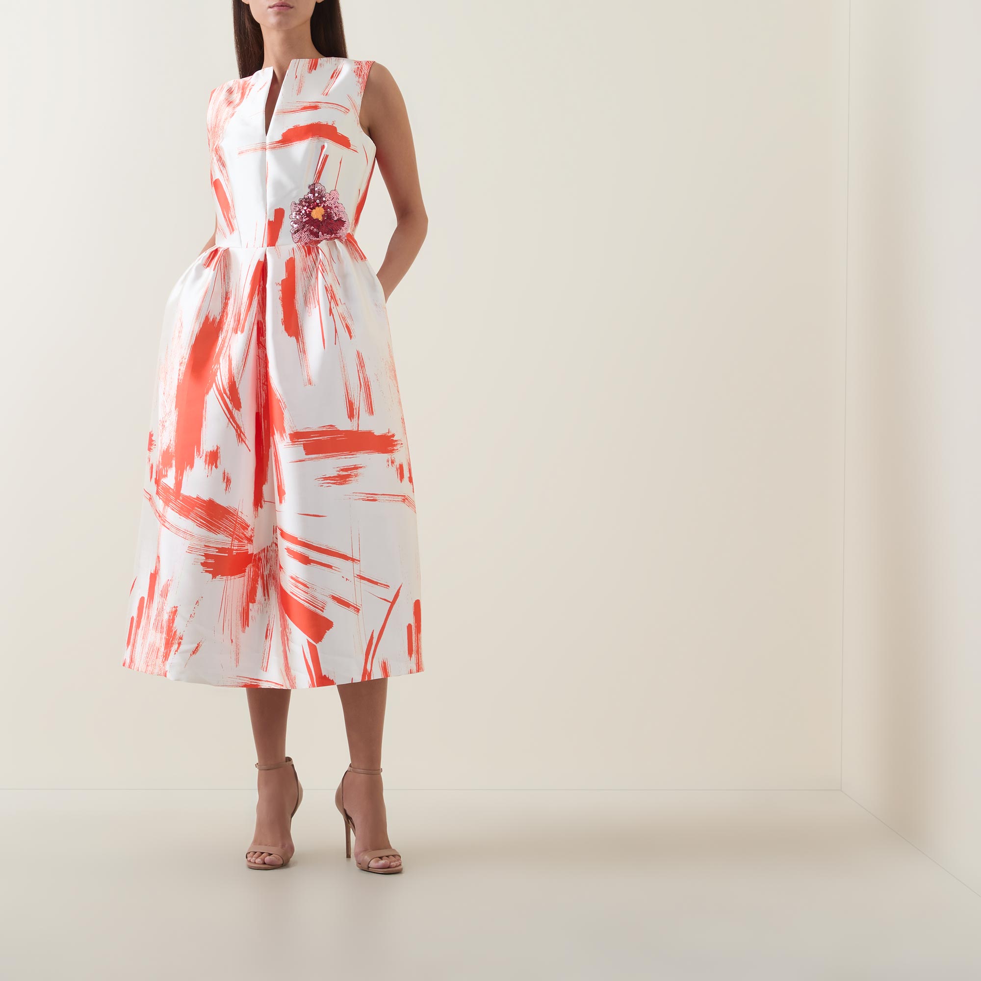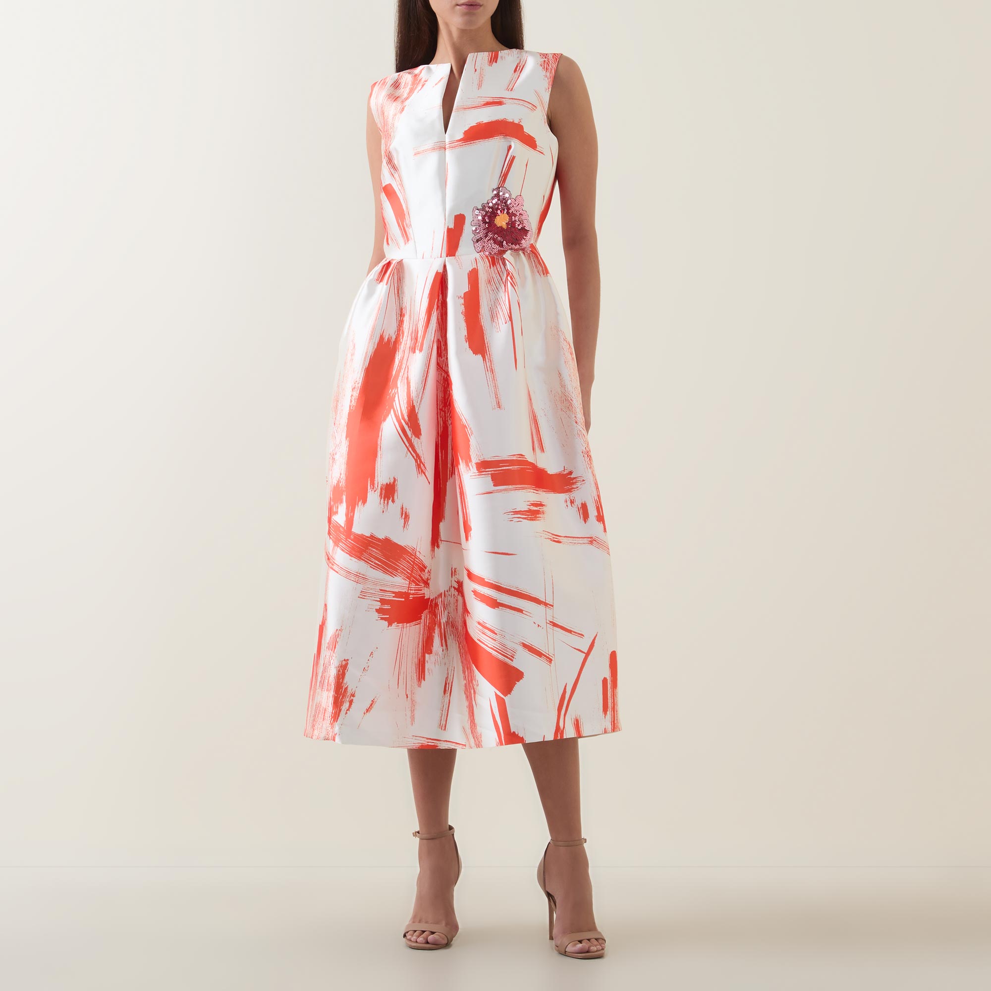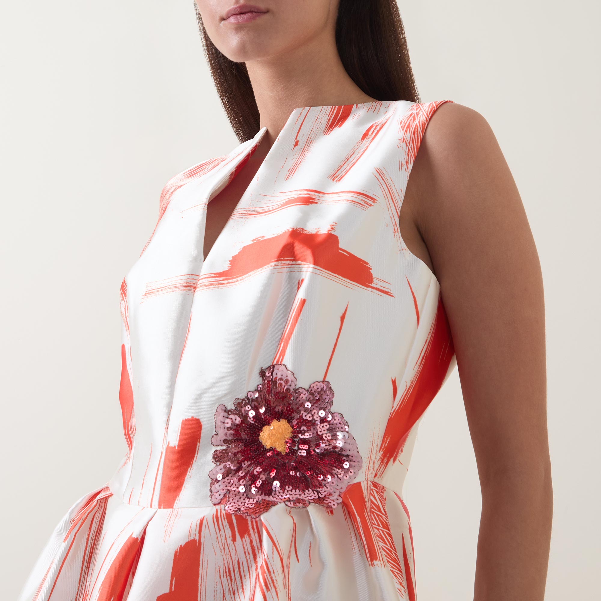 • Split V-neckline, sleeveless design, fitted through the waist, concealed rear zip fastening, sequin flower appliqué, pleated detailing, flared skirt, straight hem, abstract pattern, metallic finish, midi length