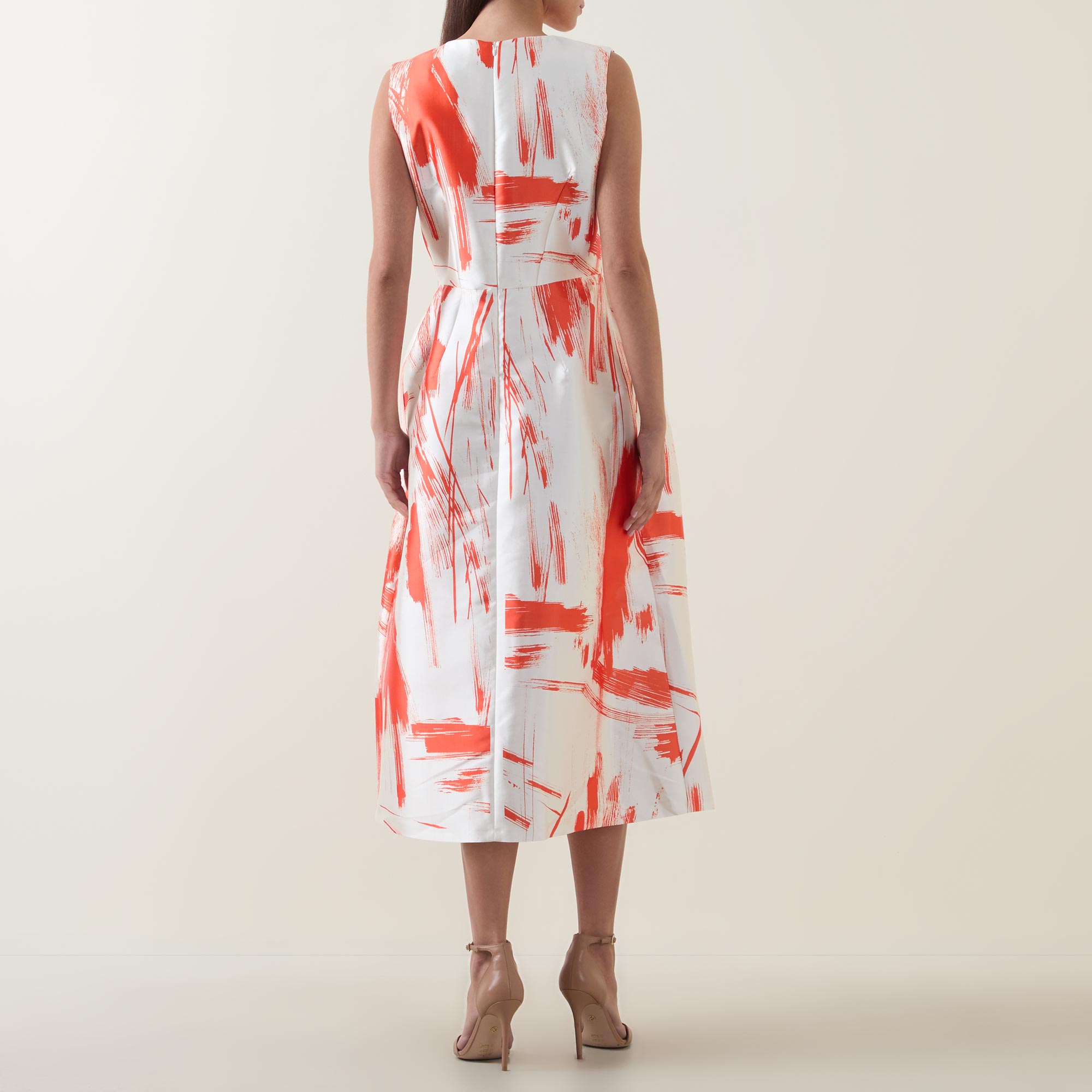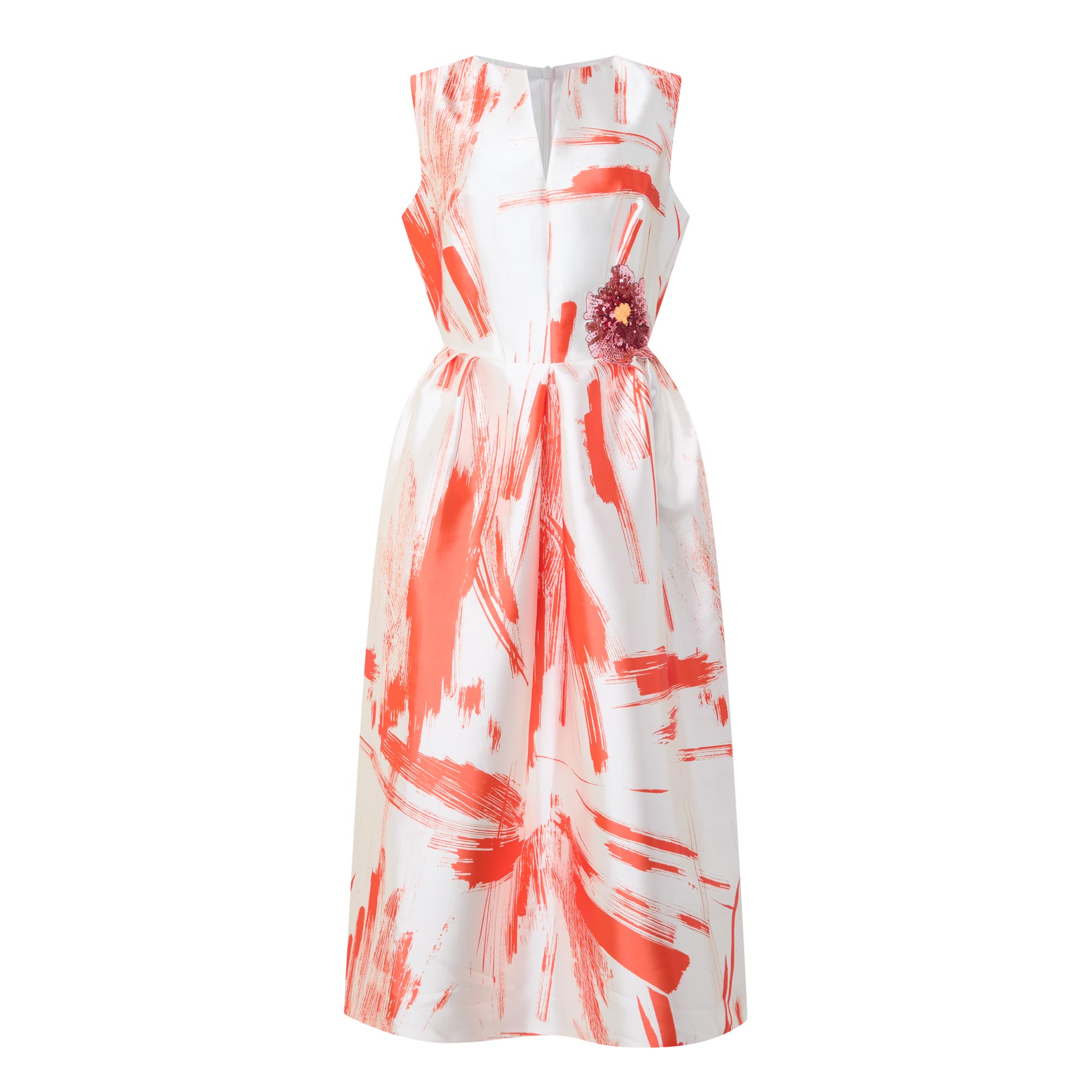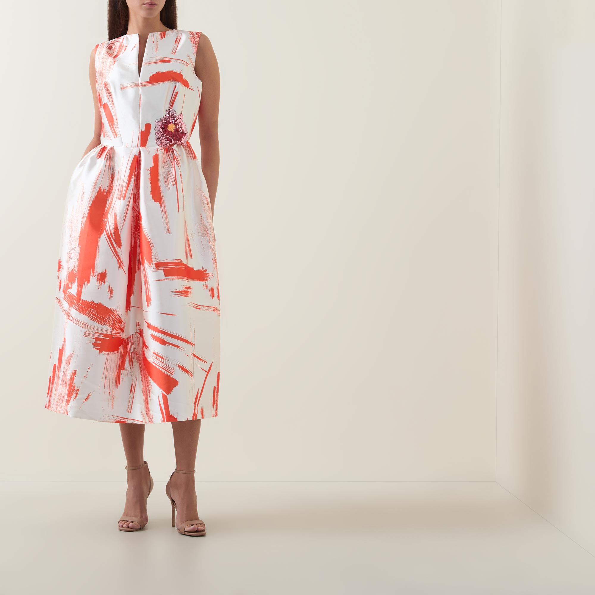 • Split V-neckline, sleeveless design, fitted through the waist, concealed rear zip fastening, sequin flower appliqué, pleated detailing, flared skirt, straight hem, abstract pattern, metallic finish, midi length
