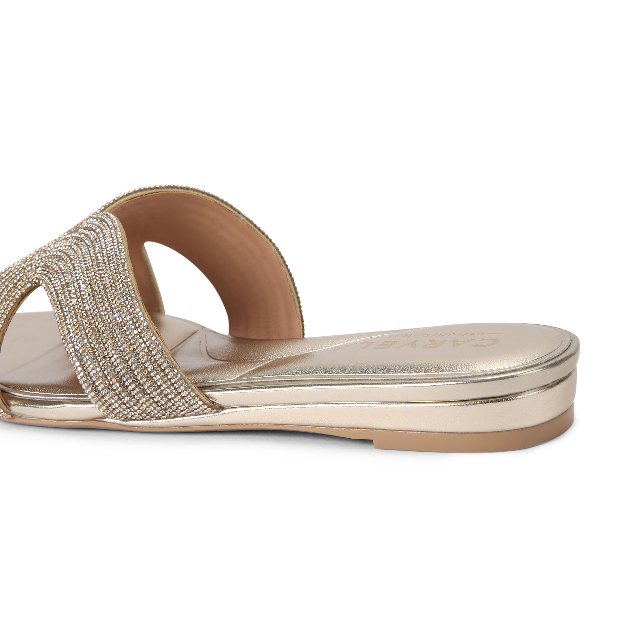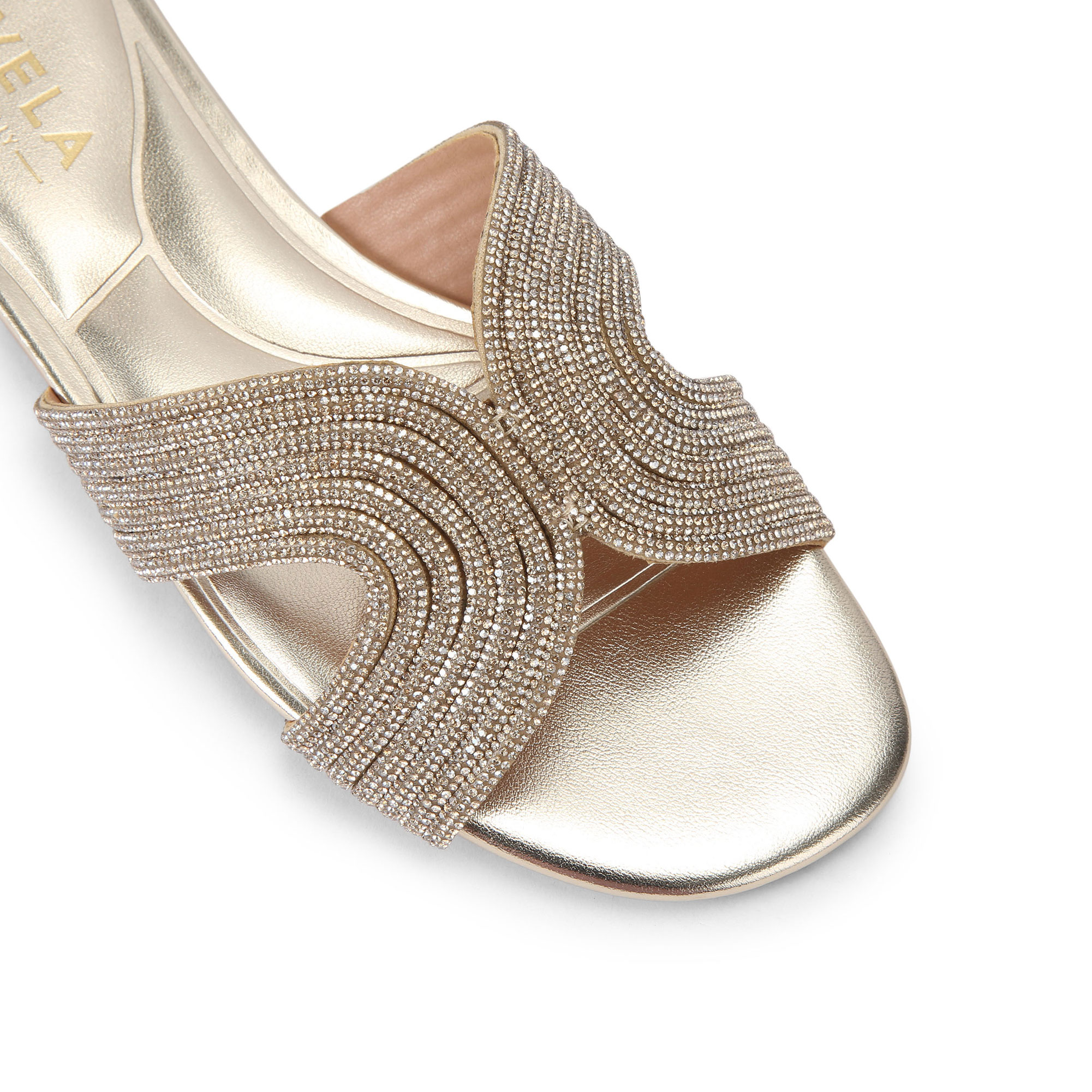 - Mule style, gold-tone crystal upper, cut-out details, lifted heel