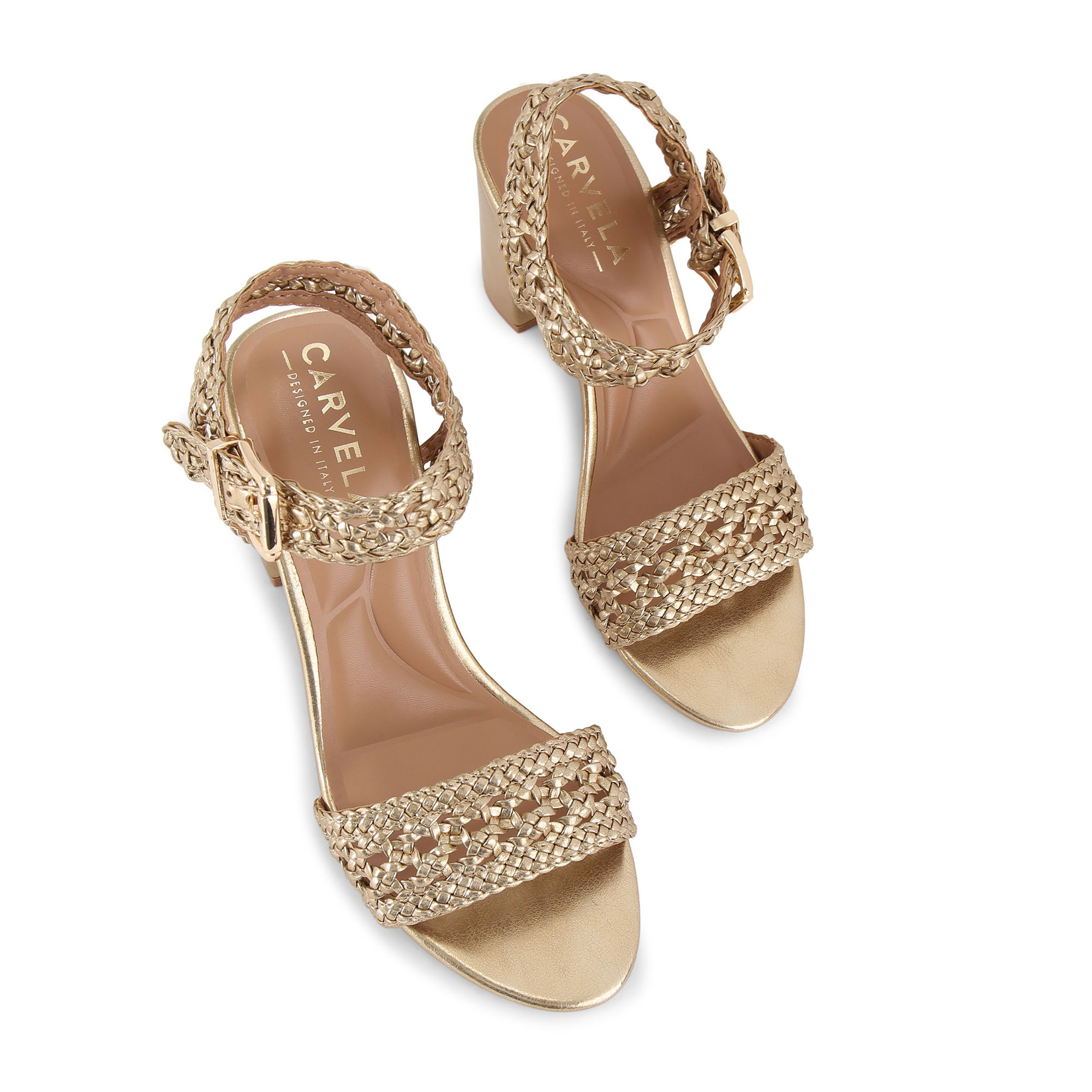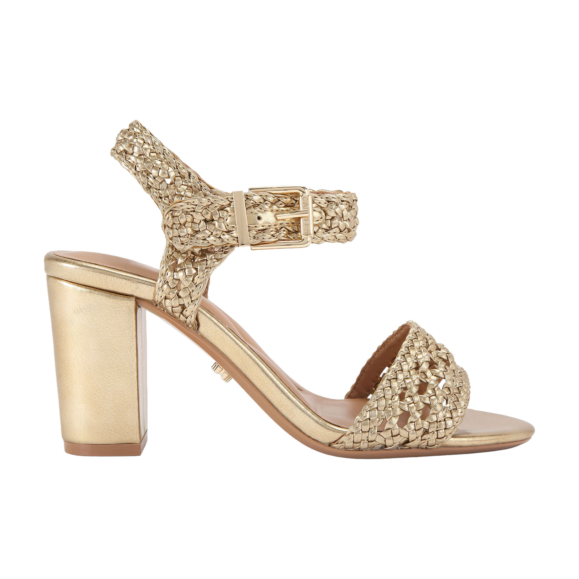 - Braided metallic straps, buckle fastening, block heel