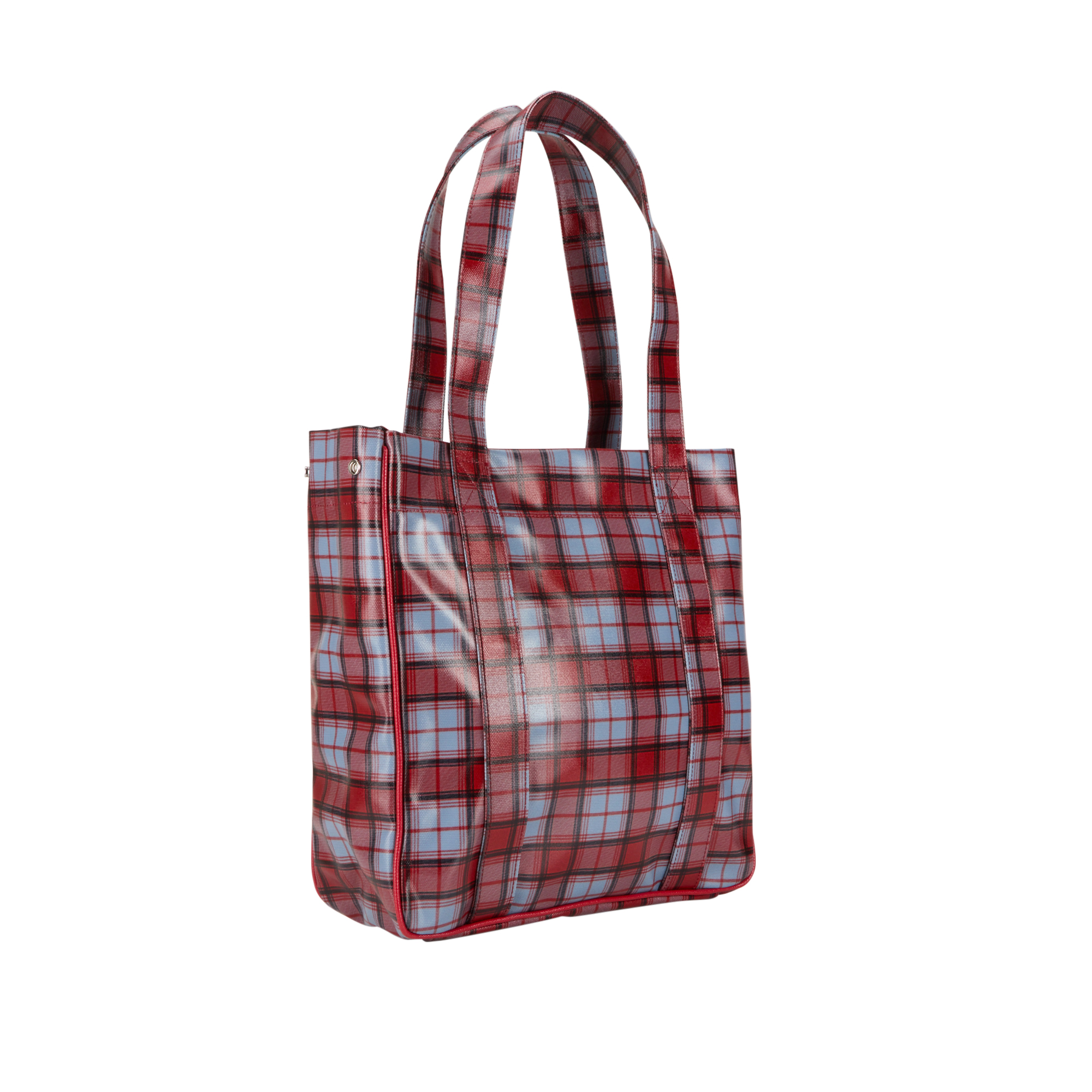 - Carry handles, top zip closure, tonal piped trim, side popper fastenings, logo badge, multi-check print, coated finish