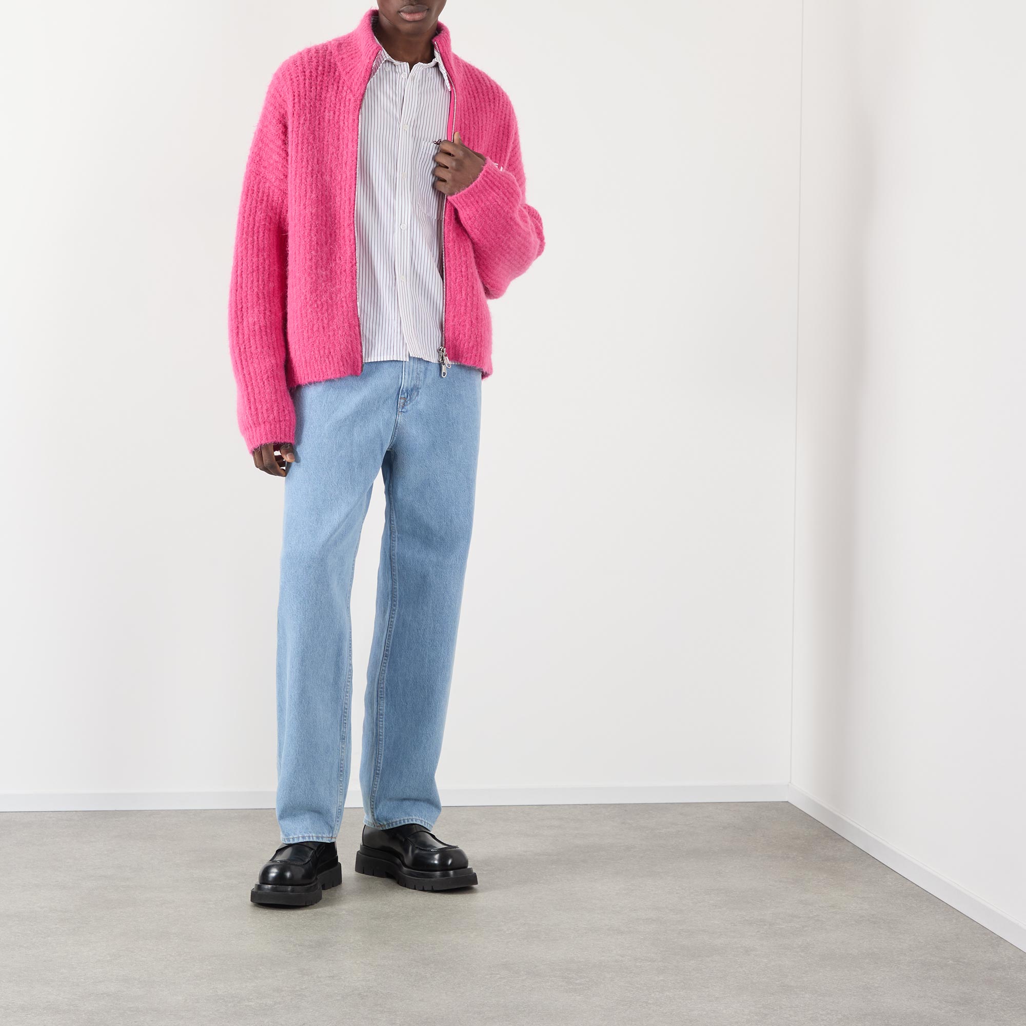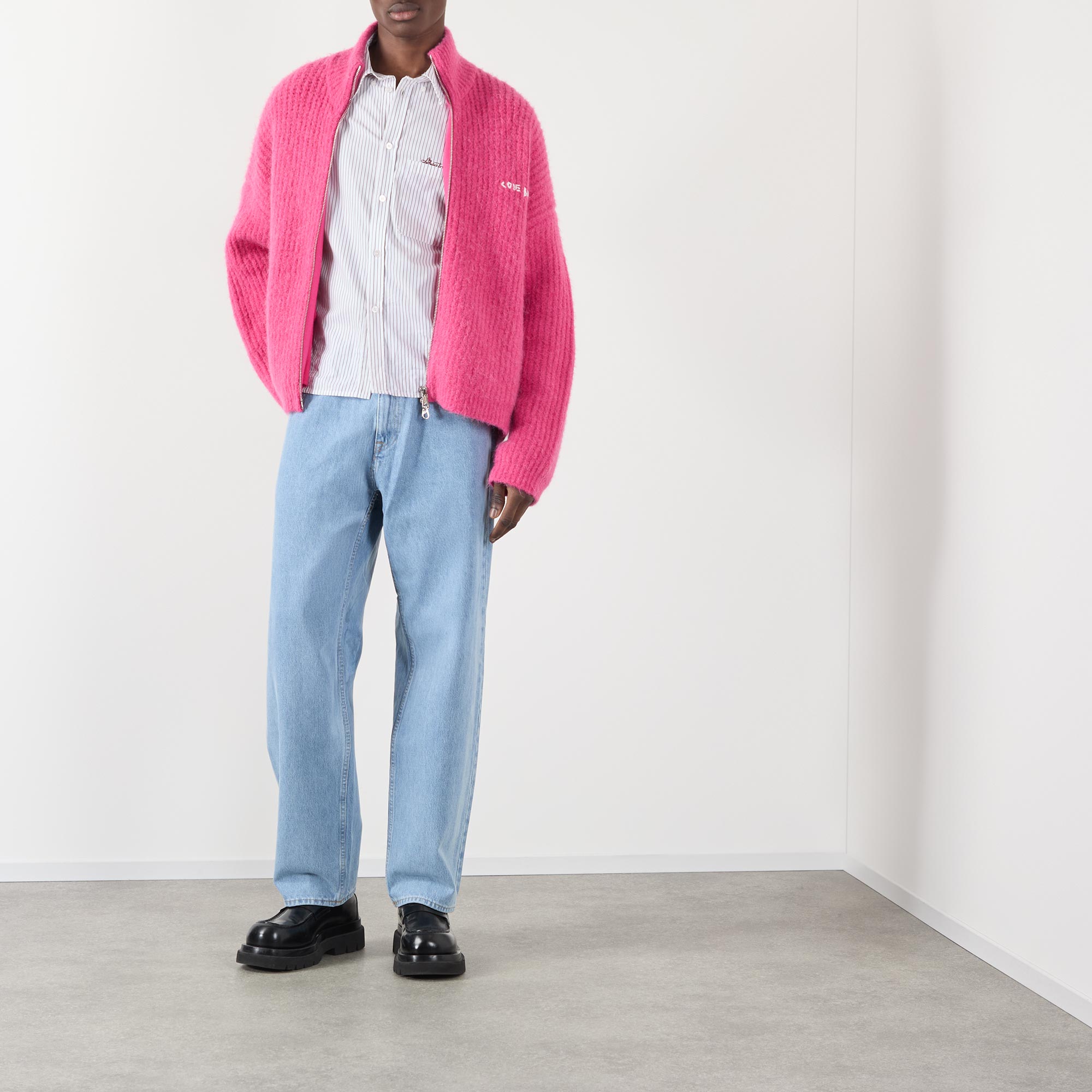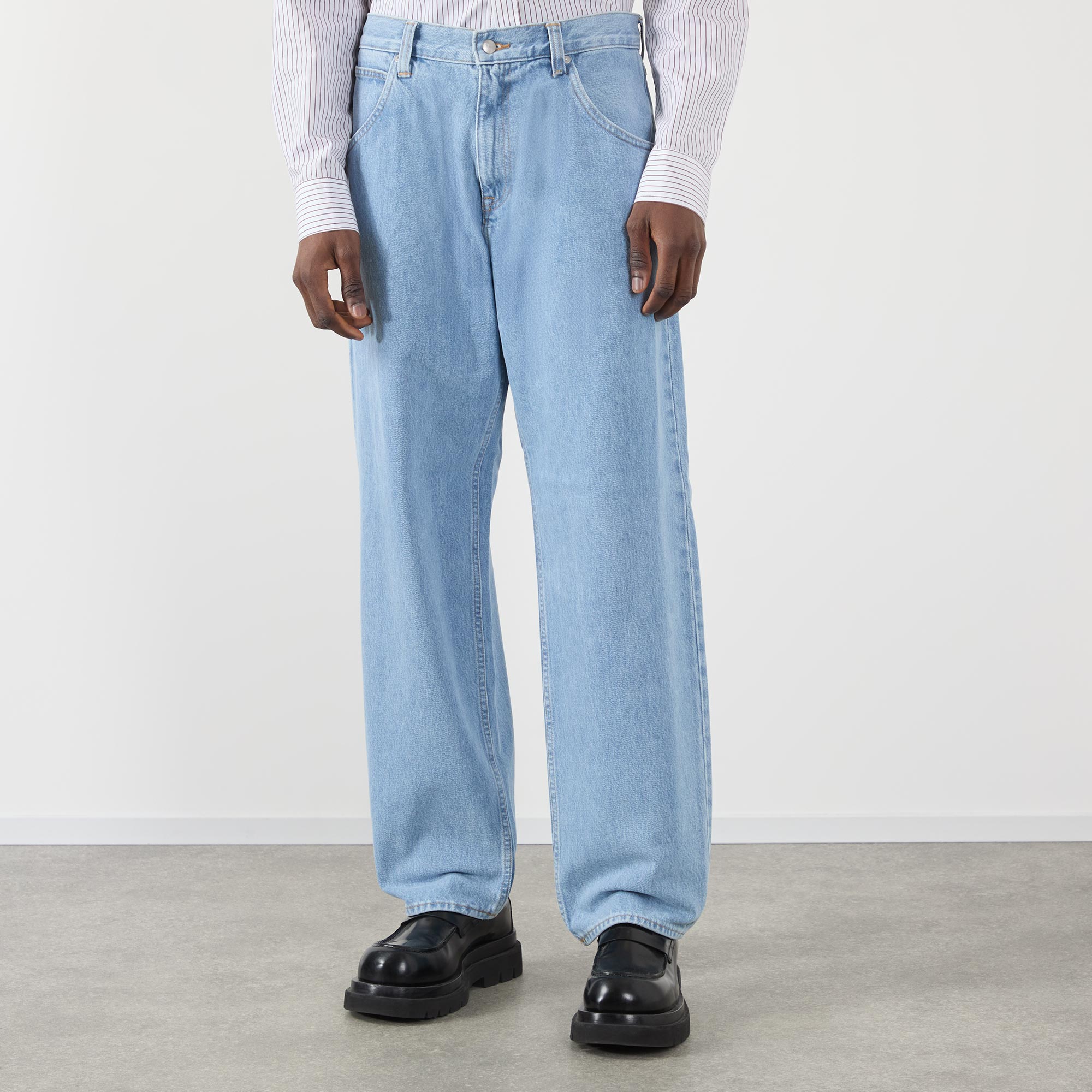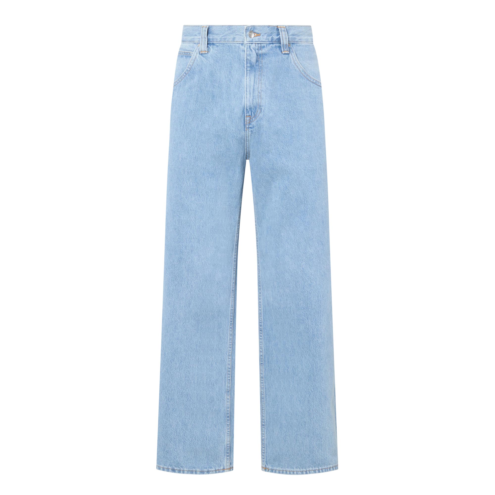 - Denim fabric, tapered-leg silhouette, five-pocket style, brand logo patch, silver-tone metal trims pack, contrast stitching, button and zip fly fastening, five rivets, beetle tab at back pocket, light bleach wash, soft feel