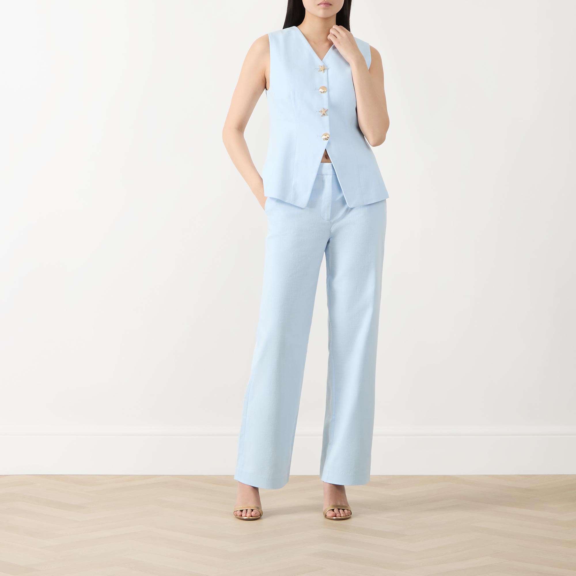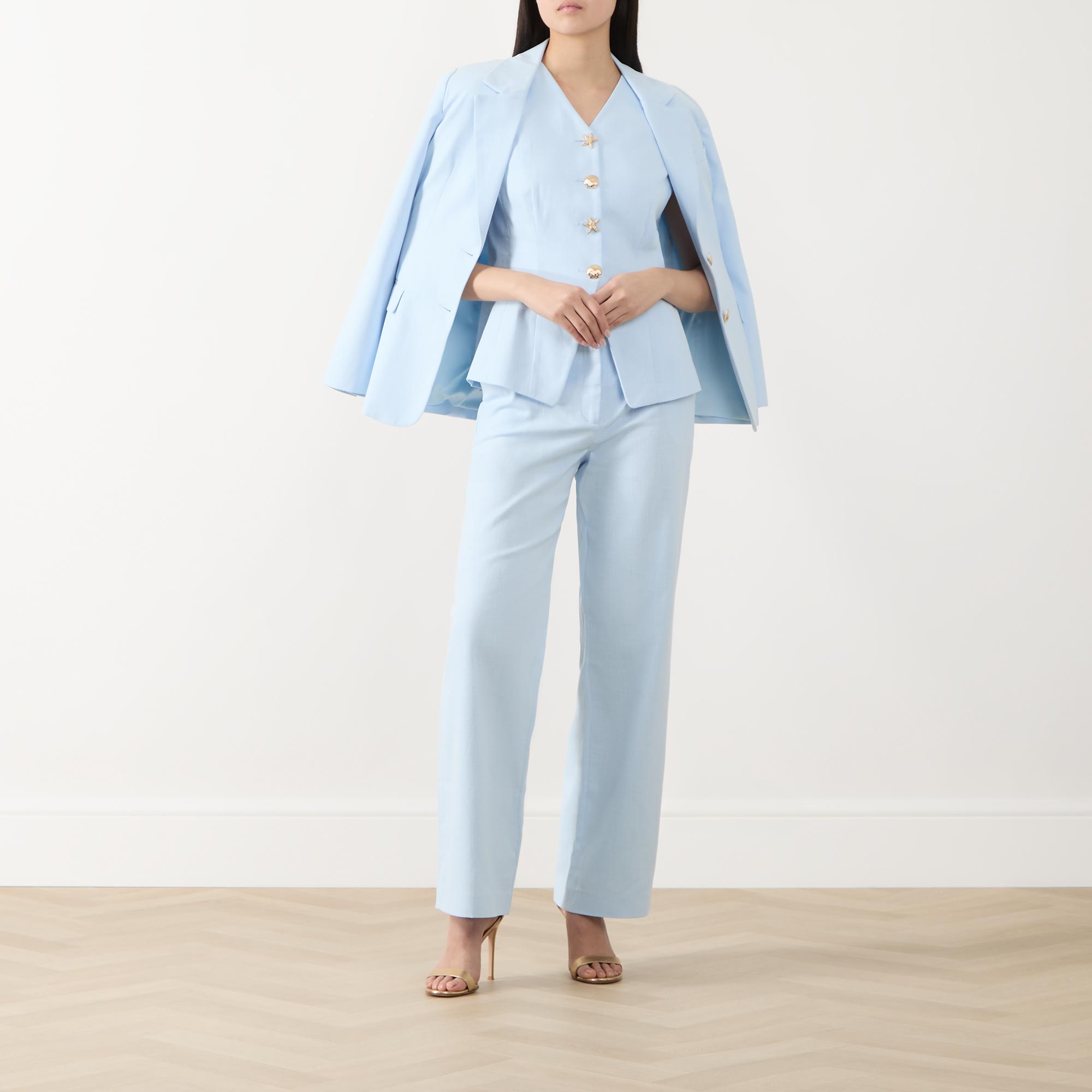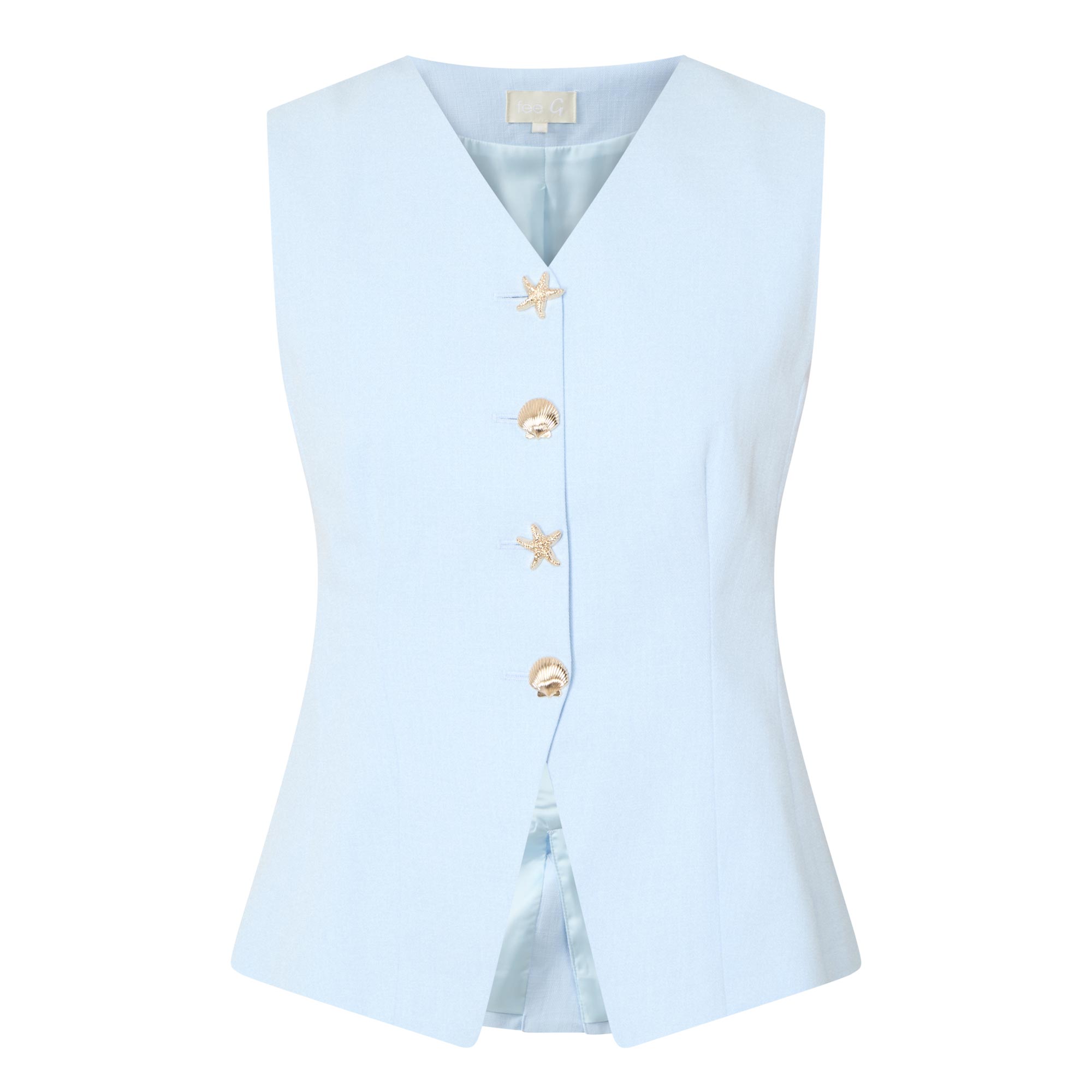 - Single-breasted, V-neckline, sleeveless, metal hardware, button fastenings