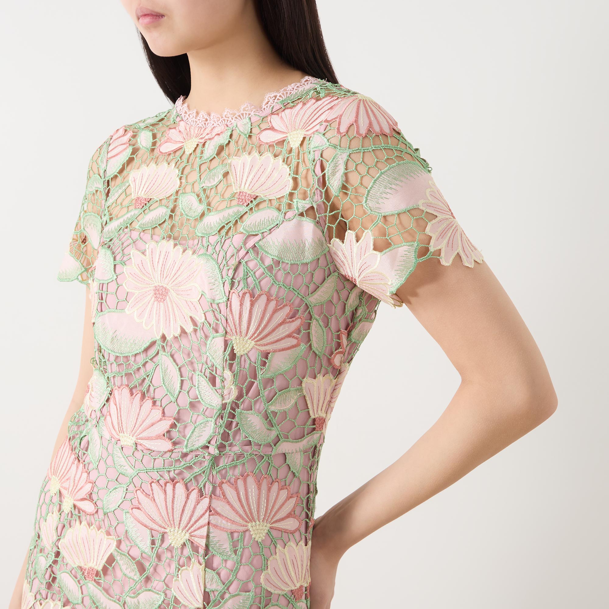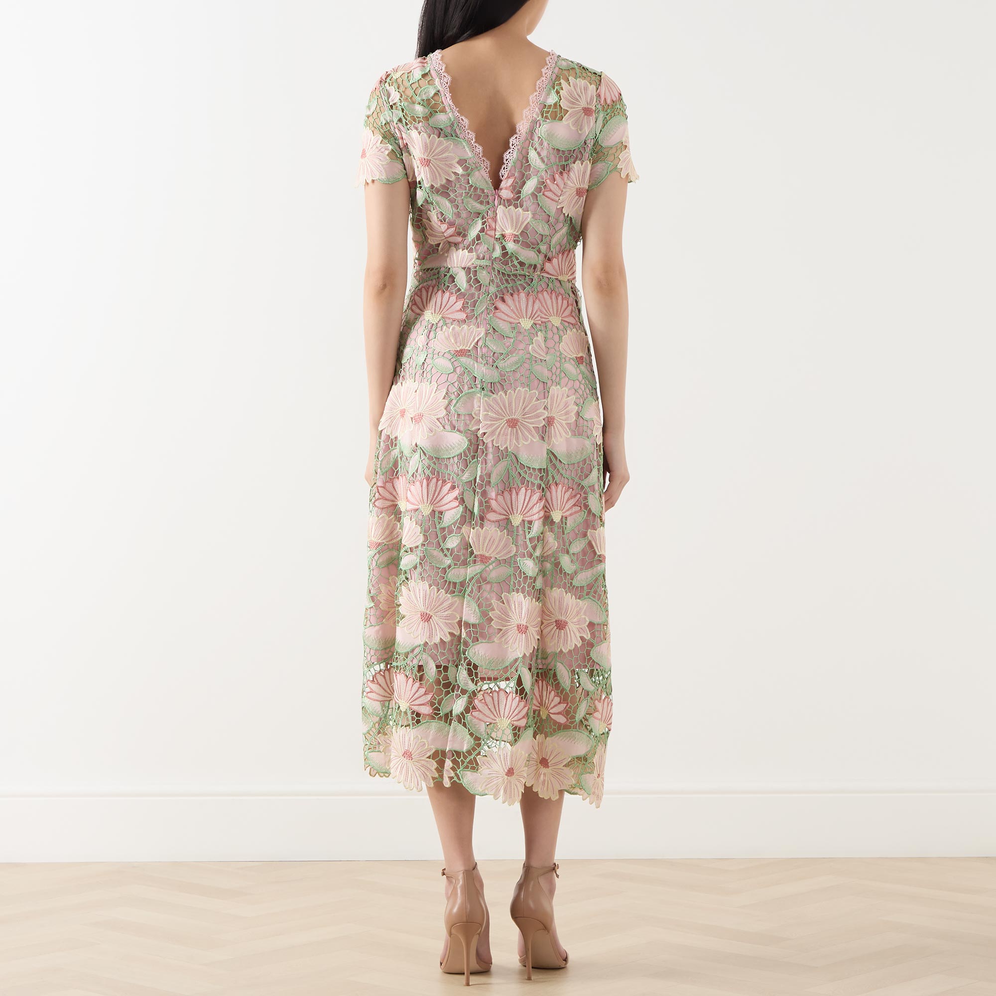 - Round neckline, V-shape back, zip fastening, midi length, short sleeves, floral lace upper, scalloped hemline, part lined