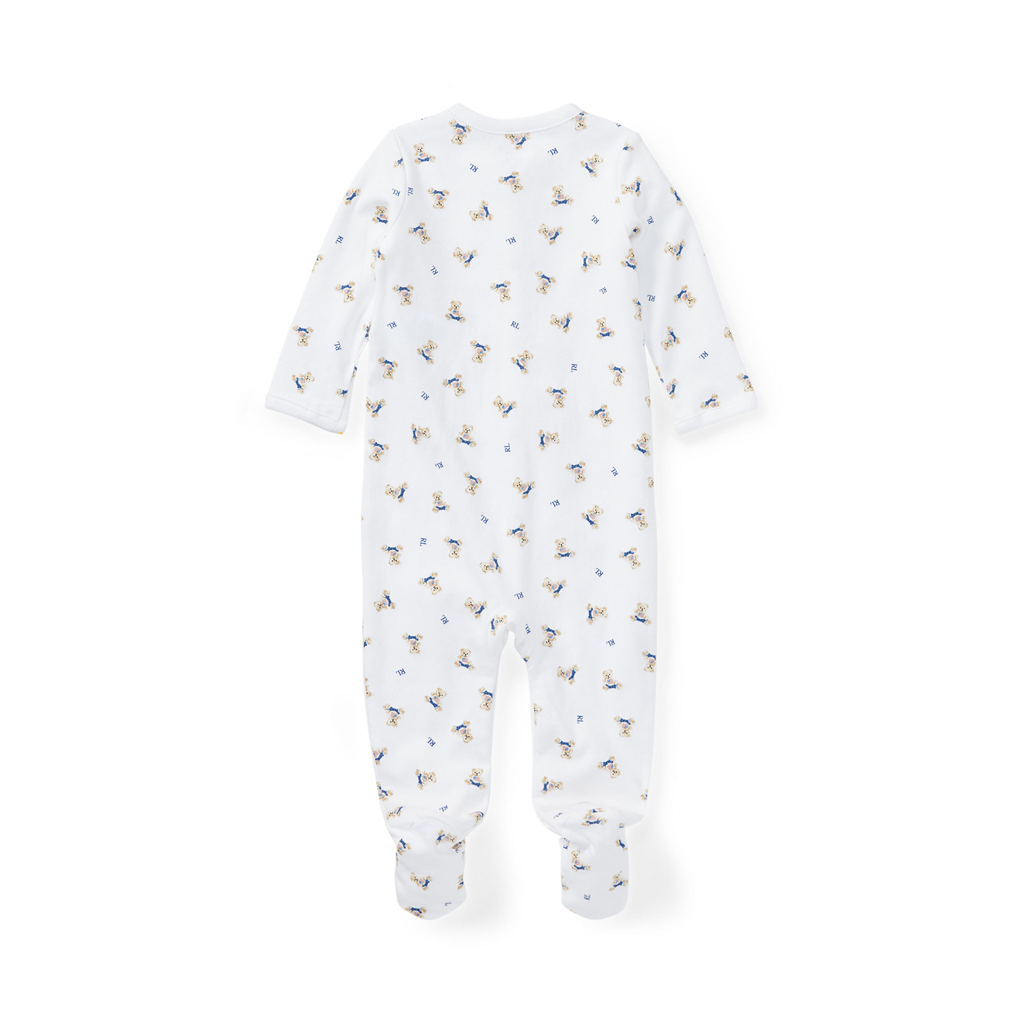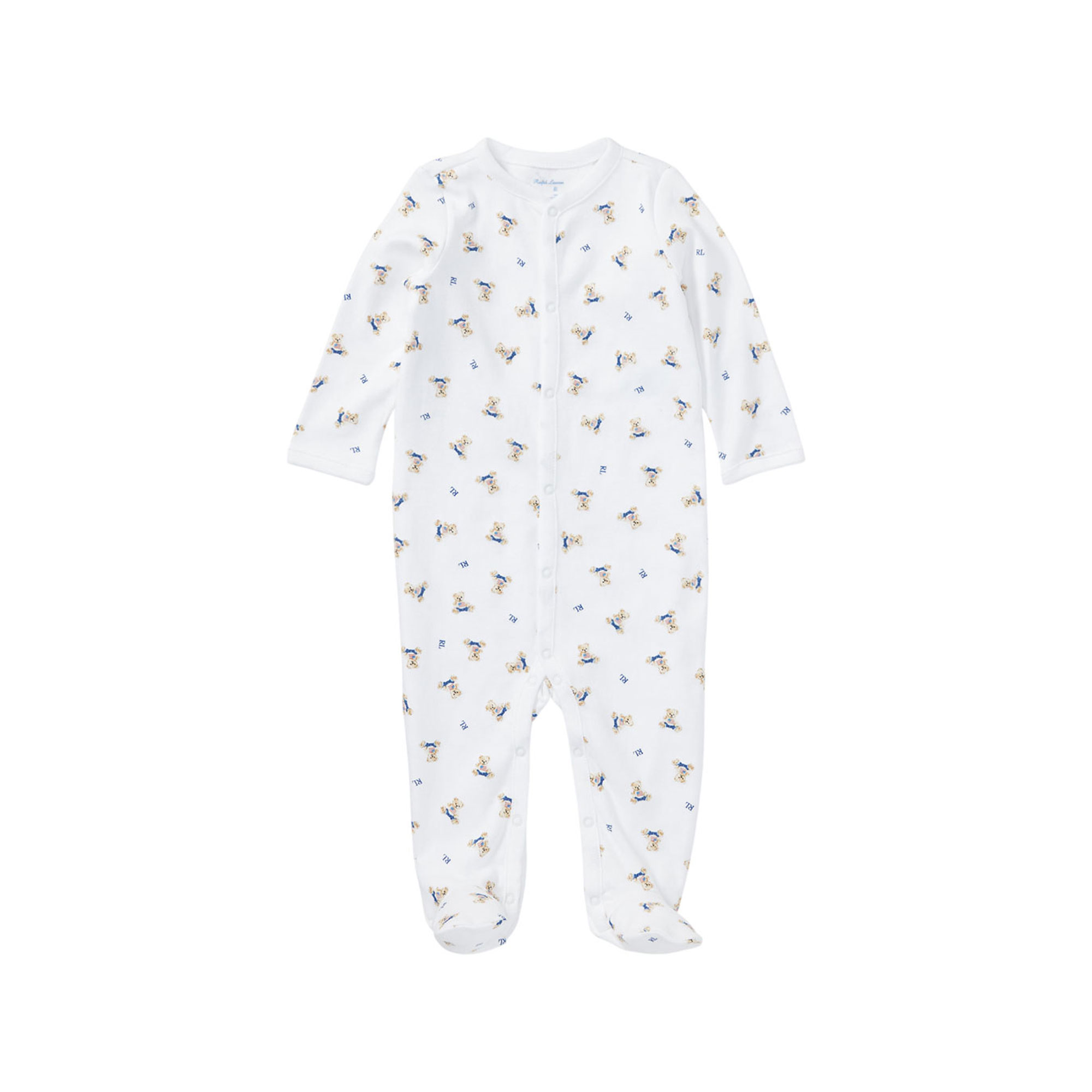 • All-over Polo Bear print, ring snap fastenings, crew neckline, snapped front, long sleeves, ring snaps at the hem, footed silhouette