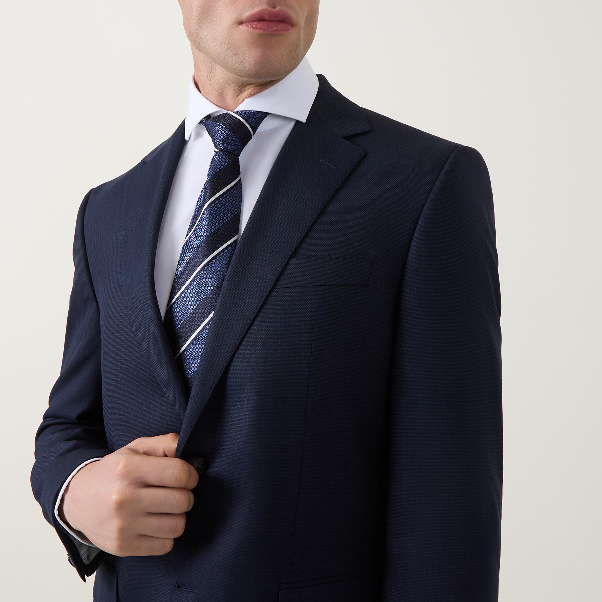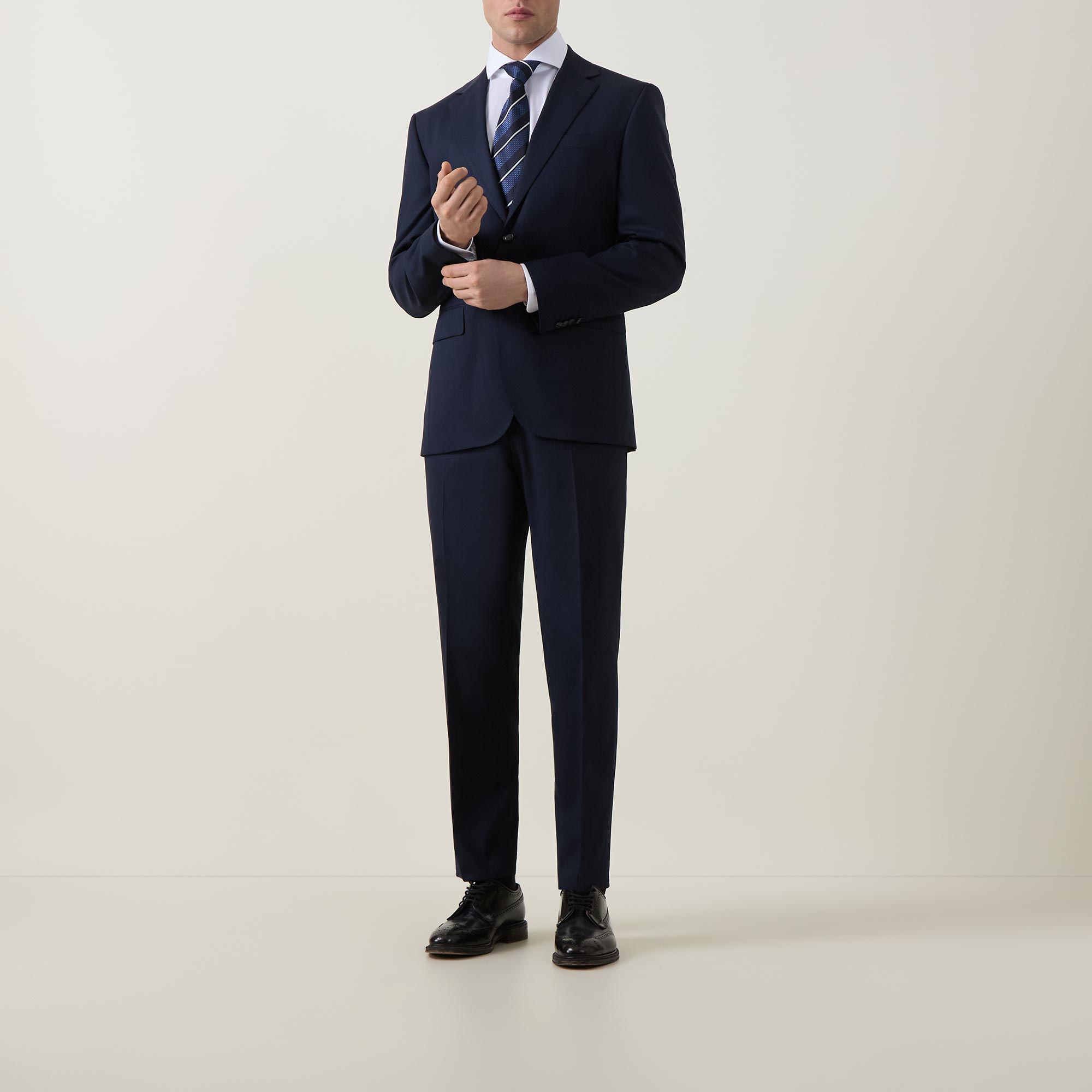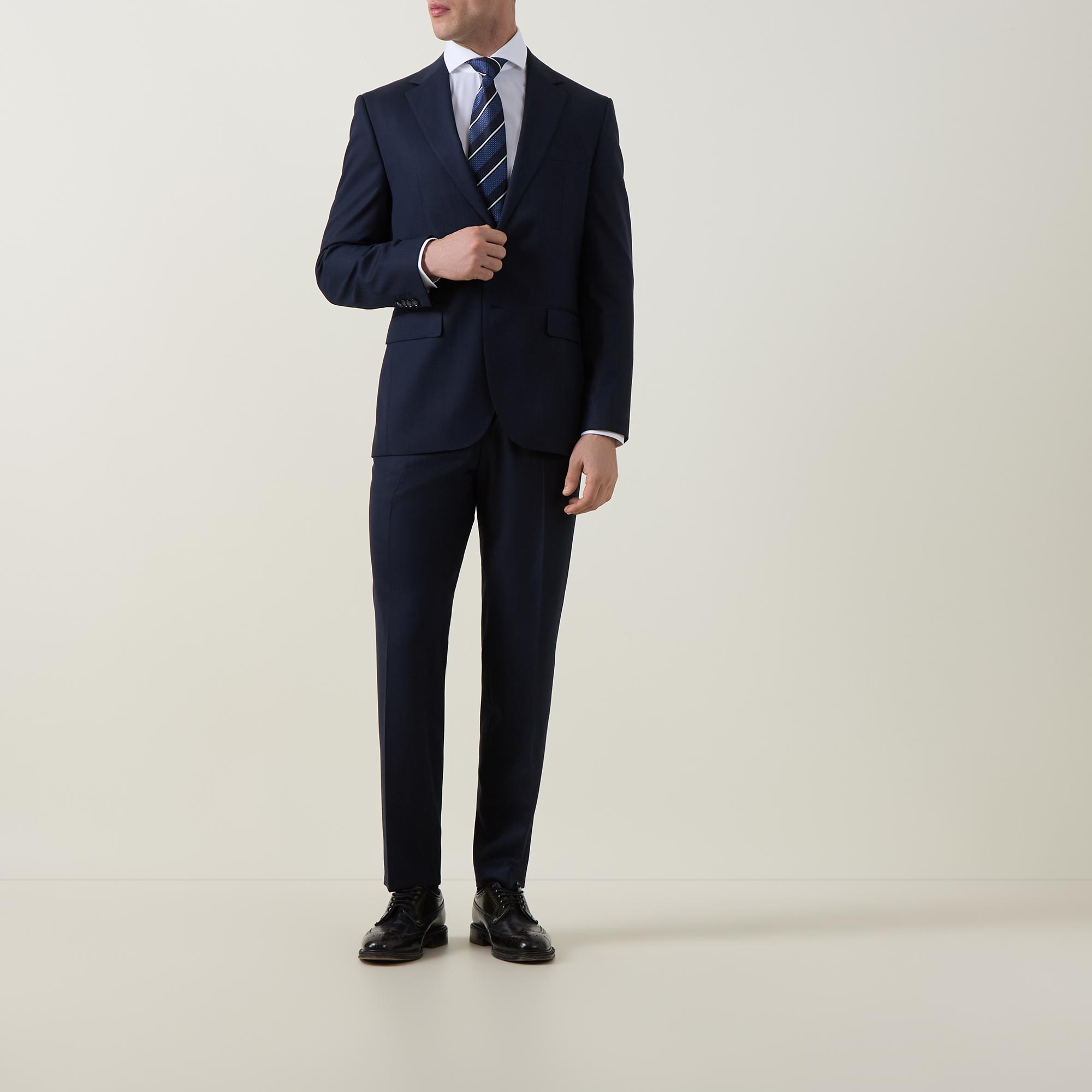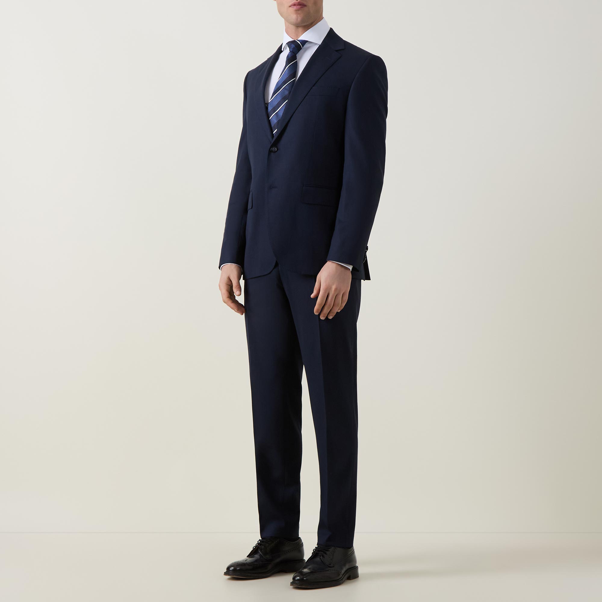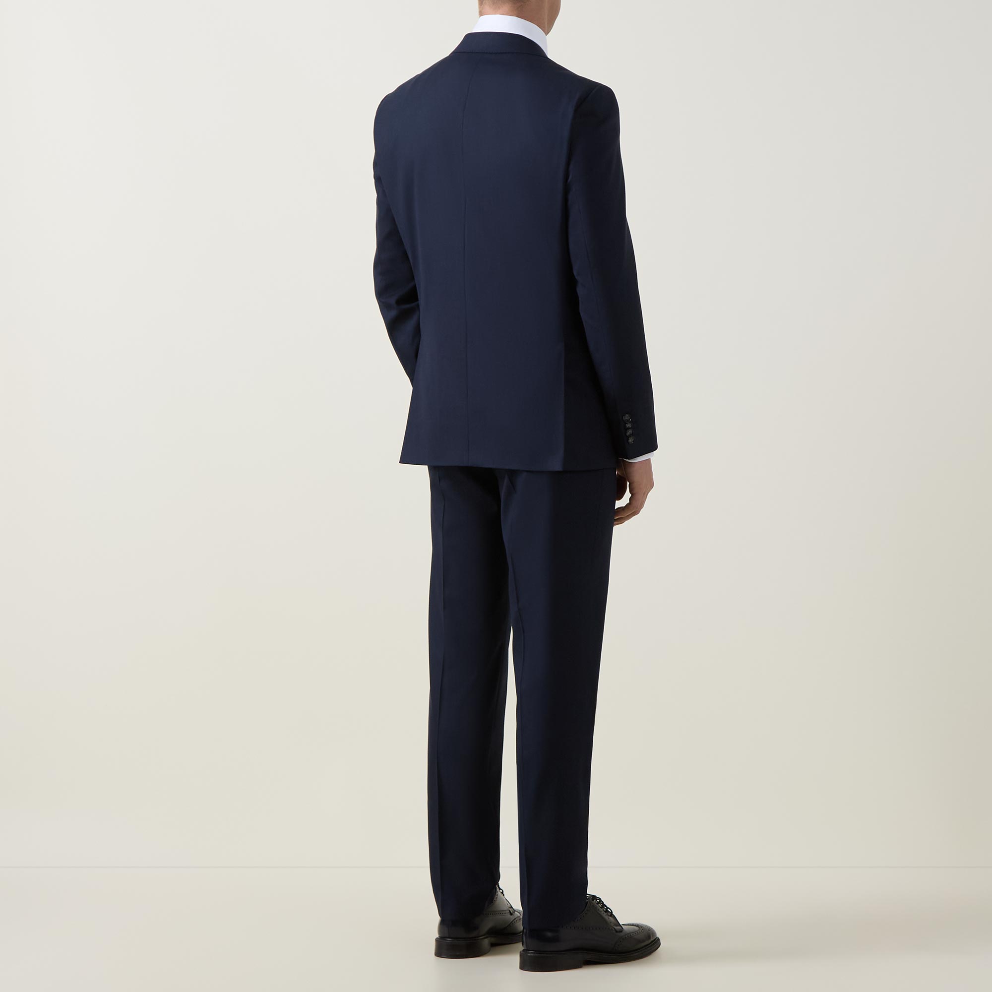 • Jacket: Single-breasted front, long sleeves, notched-lapel collar, button fastening, chest welt pocket, two side flap pockets, buttoned cuffs, side hem vents, smooth fabric. Trousers: Concealed zip-fly and hook-and-bar fastening, belt loops, four-pocket design, pressed creases, smooth fabric