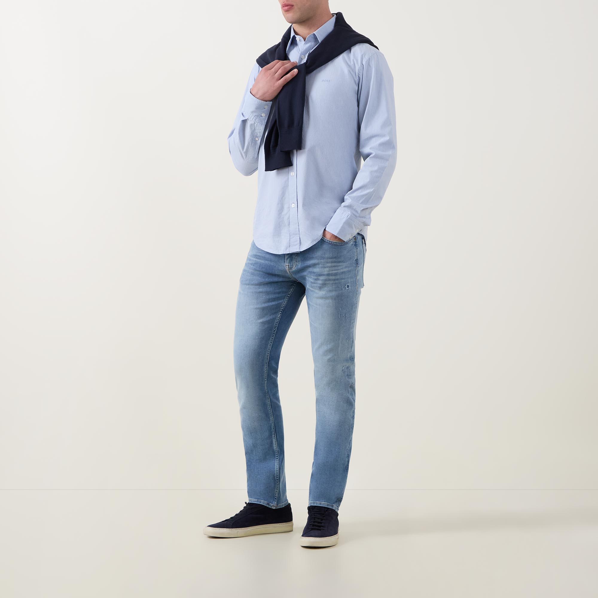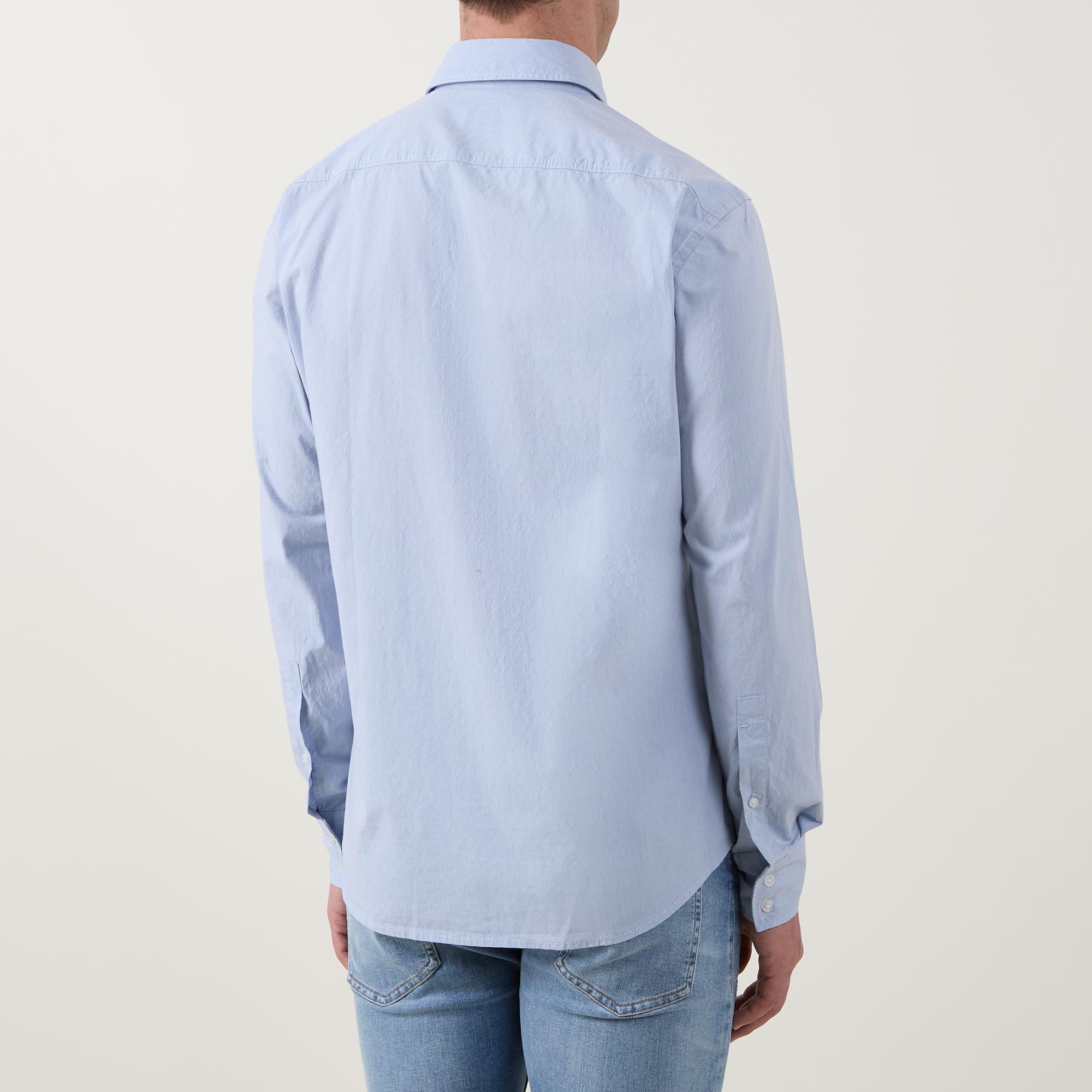 - Pointed collar, long sleeves, logo detail, curved hemline, button fastenings