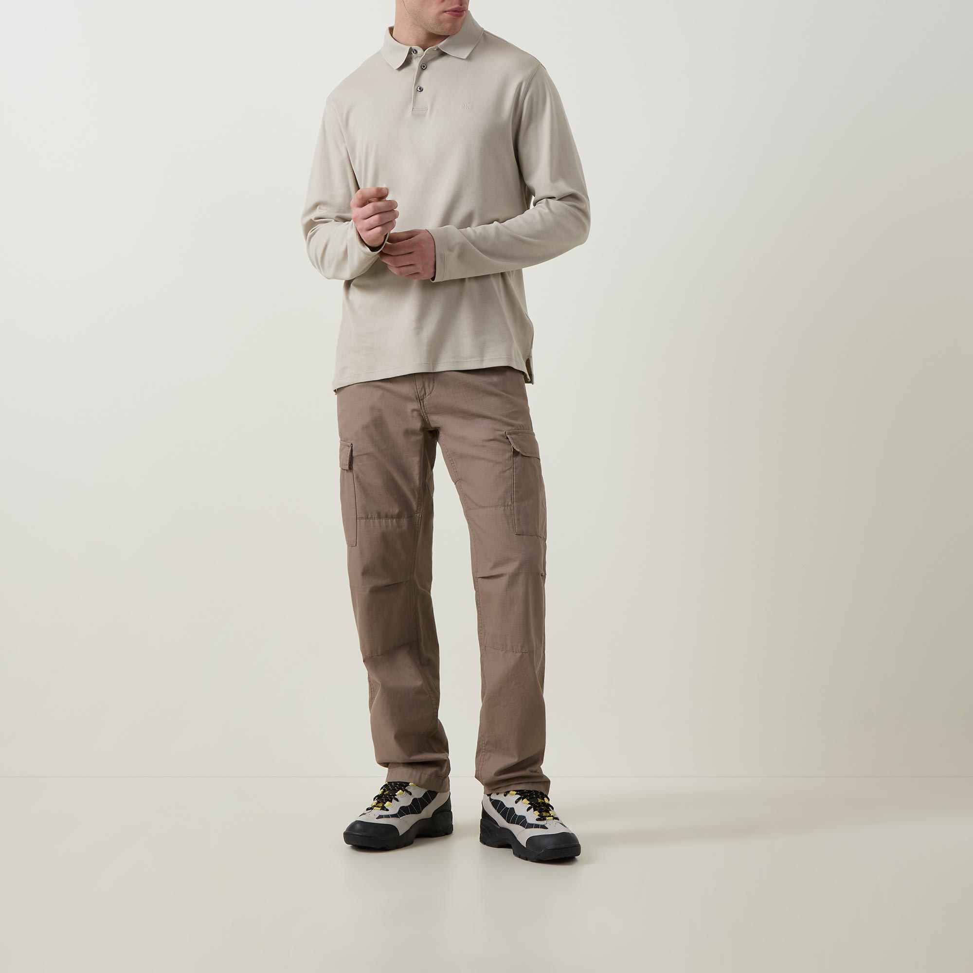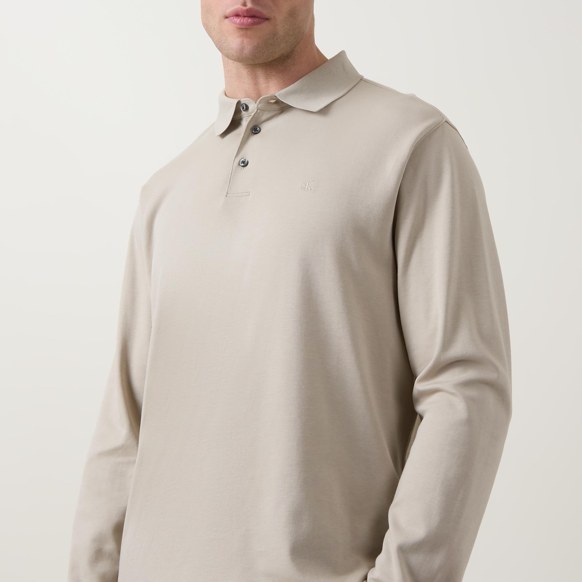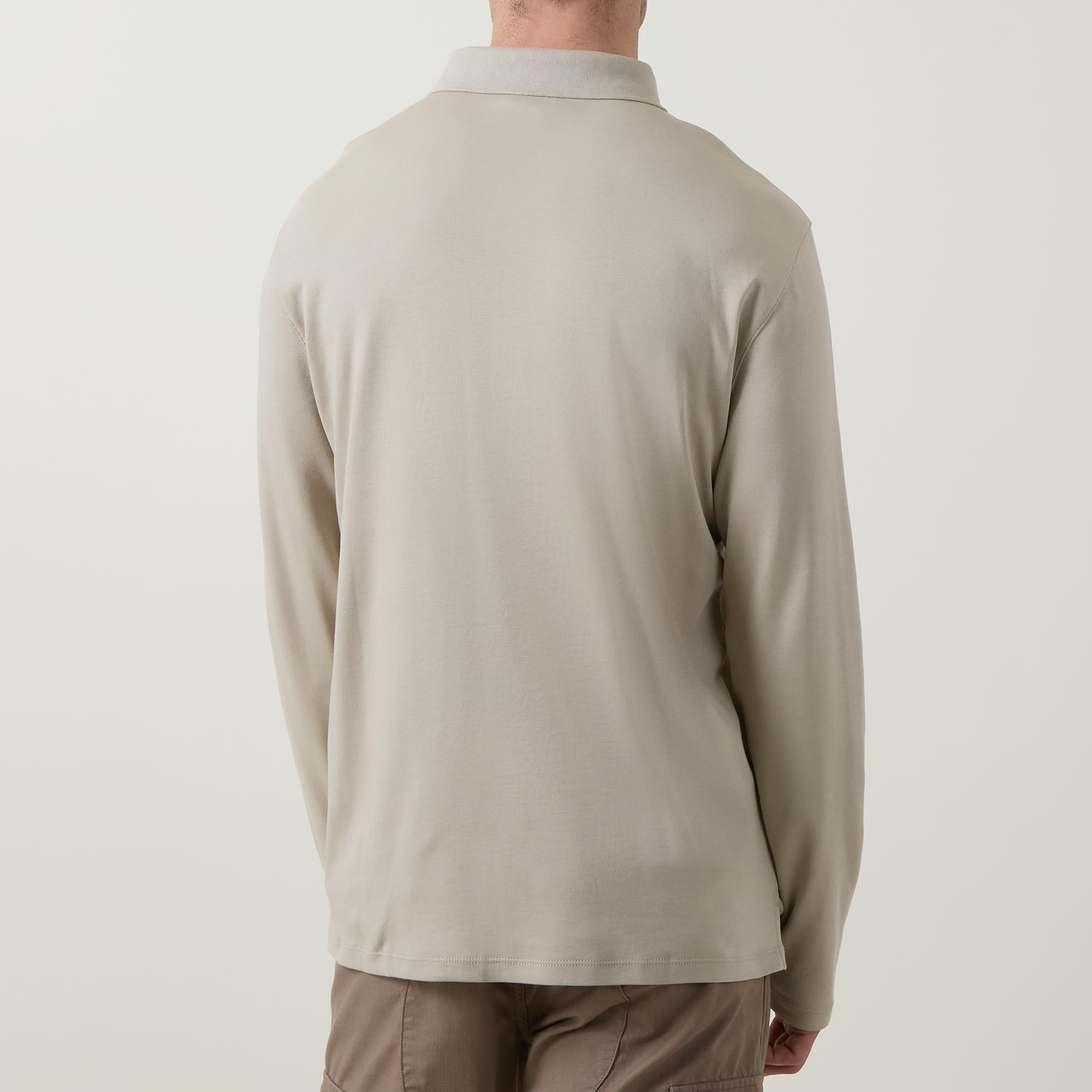 • Polo collar, three button placket, long sleeves, straight hem, tonal stitching, smooth finish