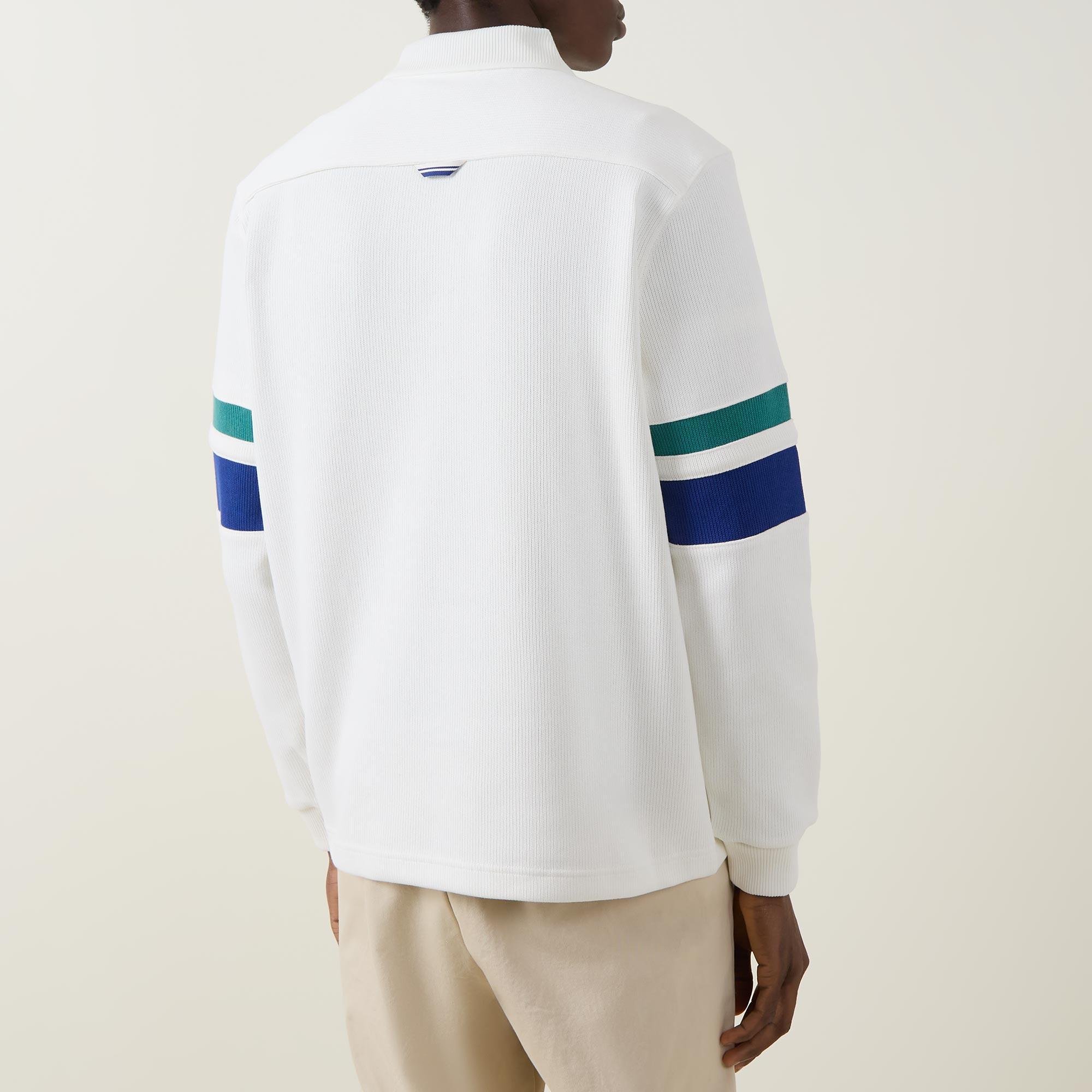 - Striped sleeve, long sleeves, polo collar, button fastenings, logo detail, straight hemline