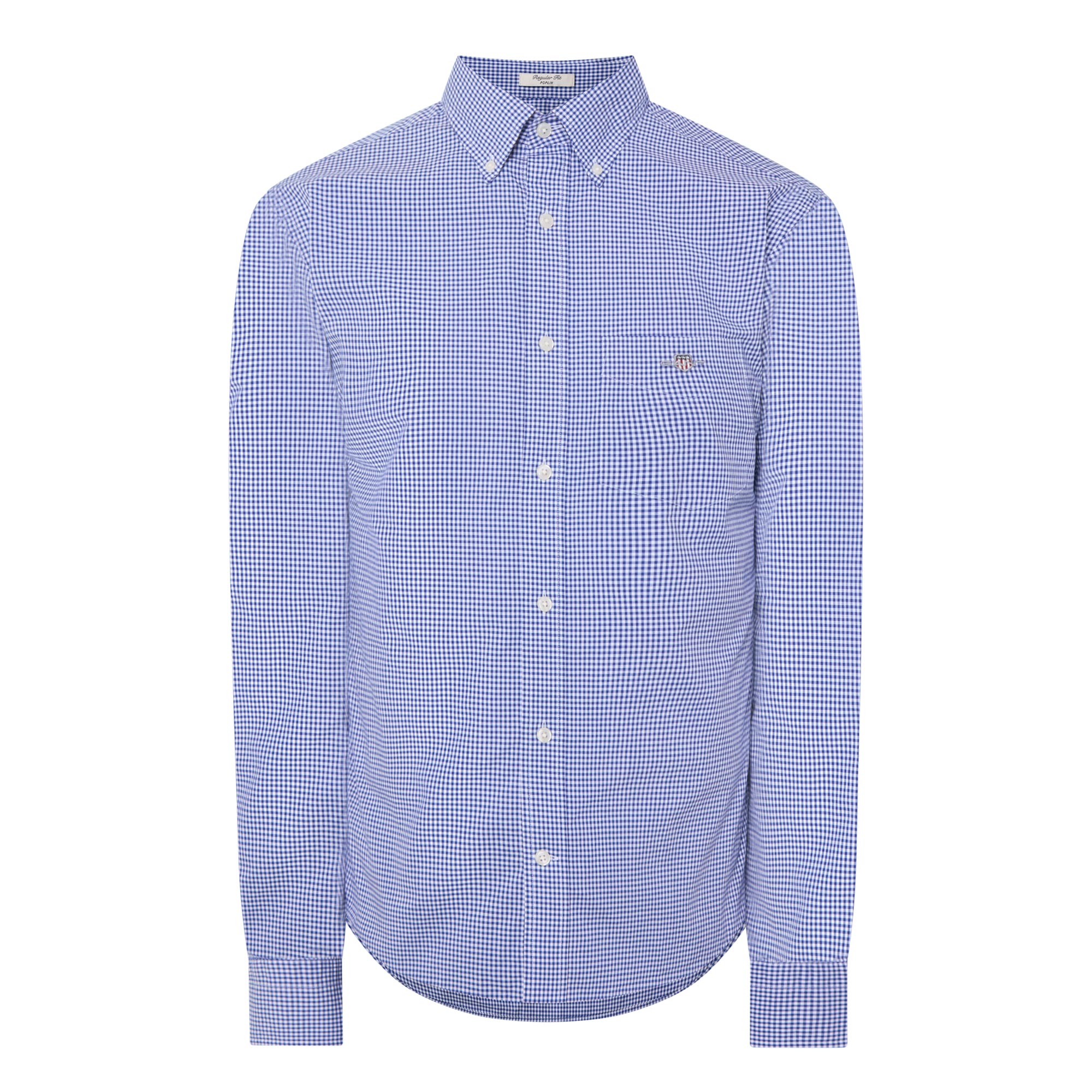 • Button-down collar, long sleeves, front button placket, one chest patch pocket, shield logo embroidery, single-button cuffs, tonal stitching, gingham pattern, back box pleat, curved hemline, smooth fabric