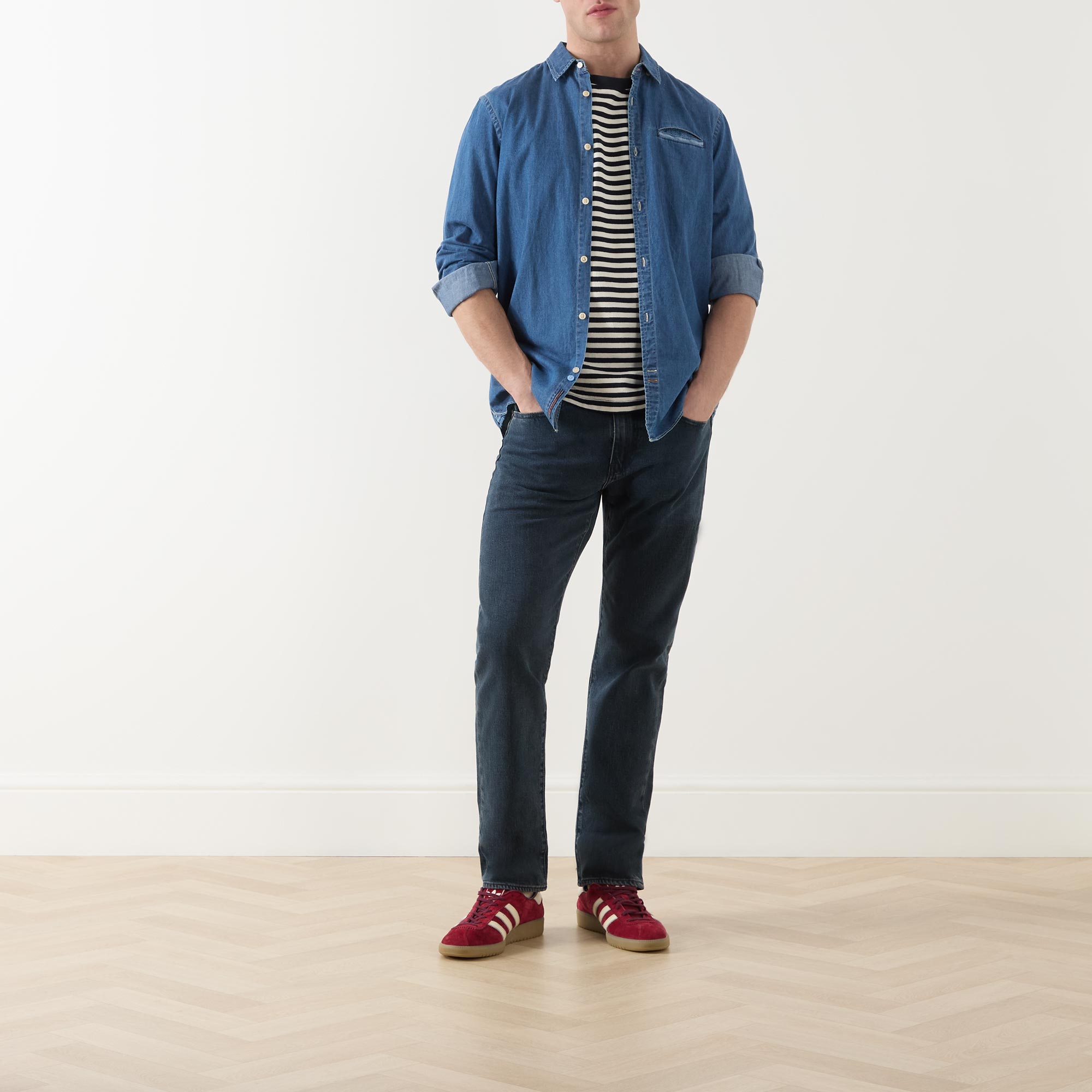 - Mid-rise, tapered-cut leg, belt loops, concealed zip-fly and button fastening, five-pocket styling, tonal stitching, rear logo patch, signature red logo tag, clean hems, stretch denim