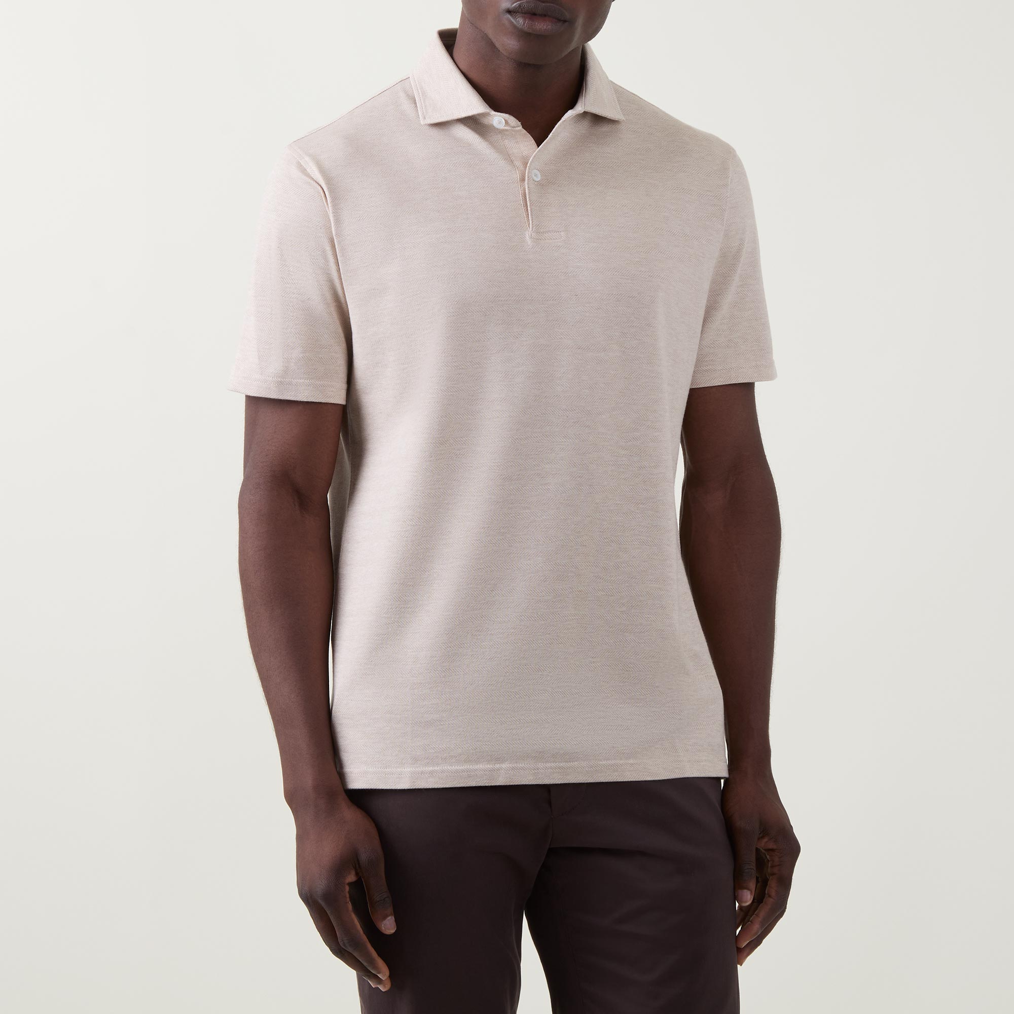 - Polo collar, two button placket, short sleeves, straight hem, side split detailing, Herringbone knit construction