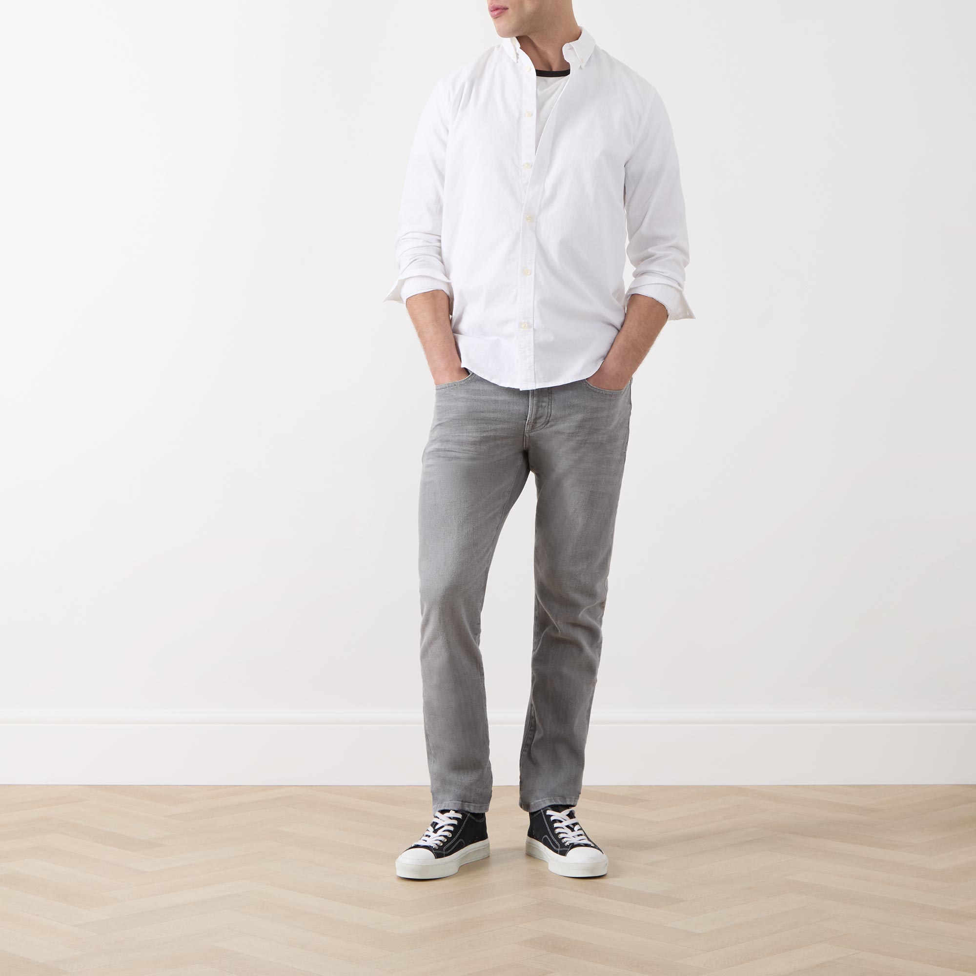 - Zip-fly and button fastening, belt loops, five-pocket design, tonal stitching, rear logo patch, whiskering, mid-rise, slim-cut leg, smooth denim finish