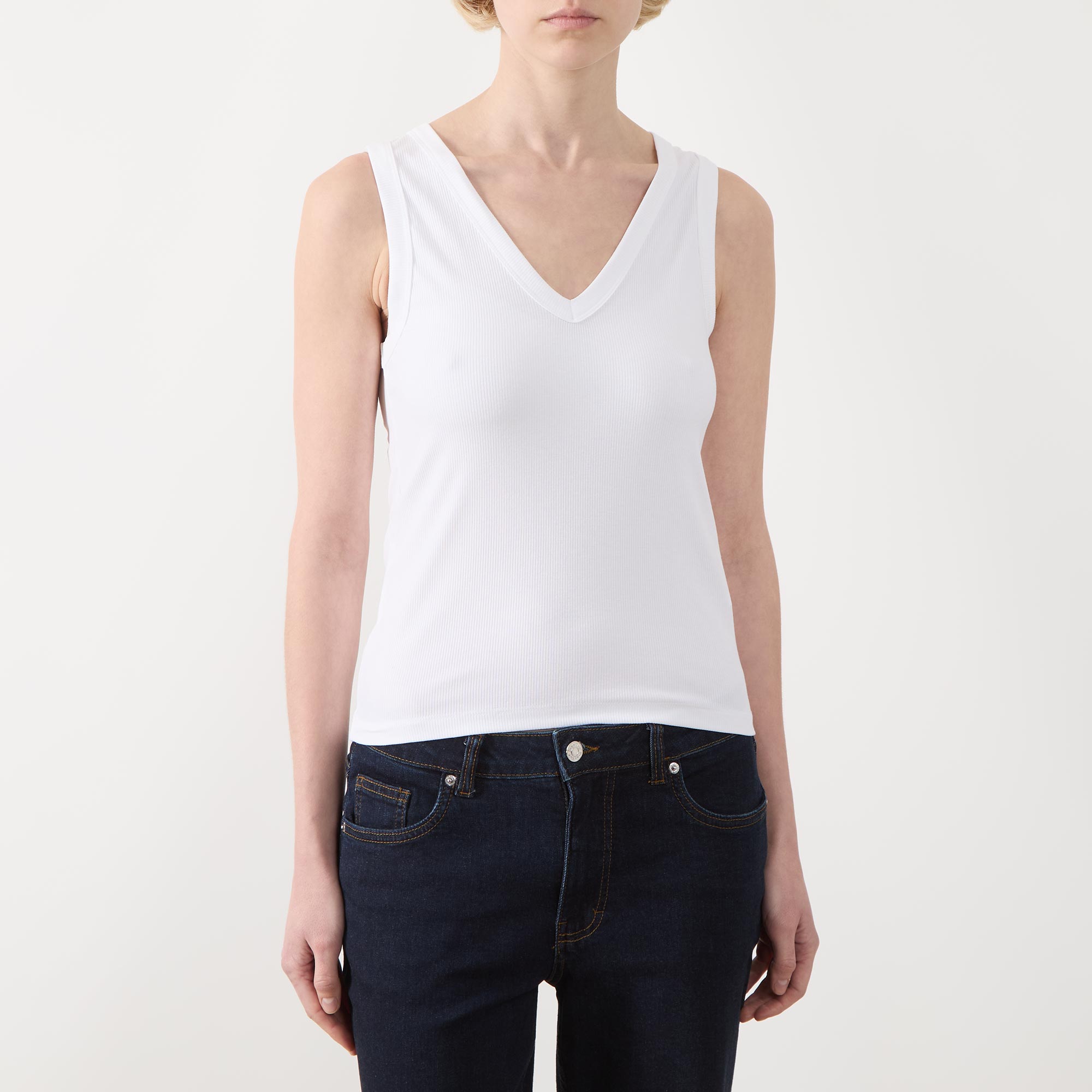 - V-neckline, ribbed finish, sleeveless, straight hem