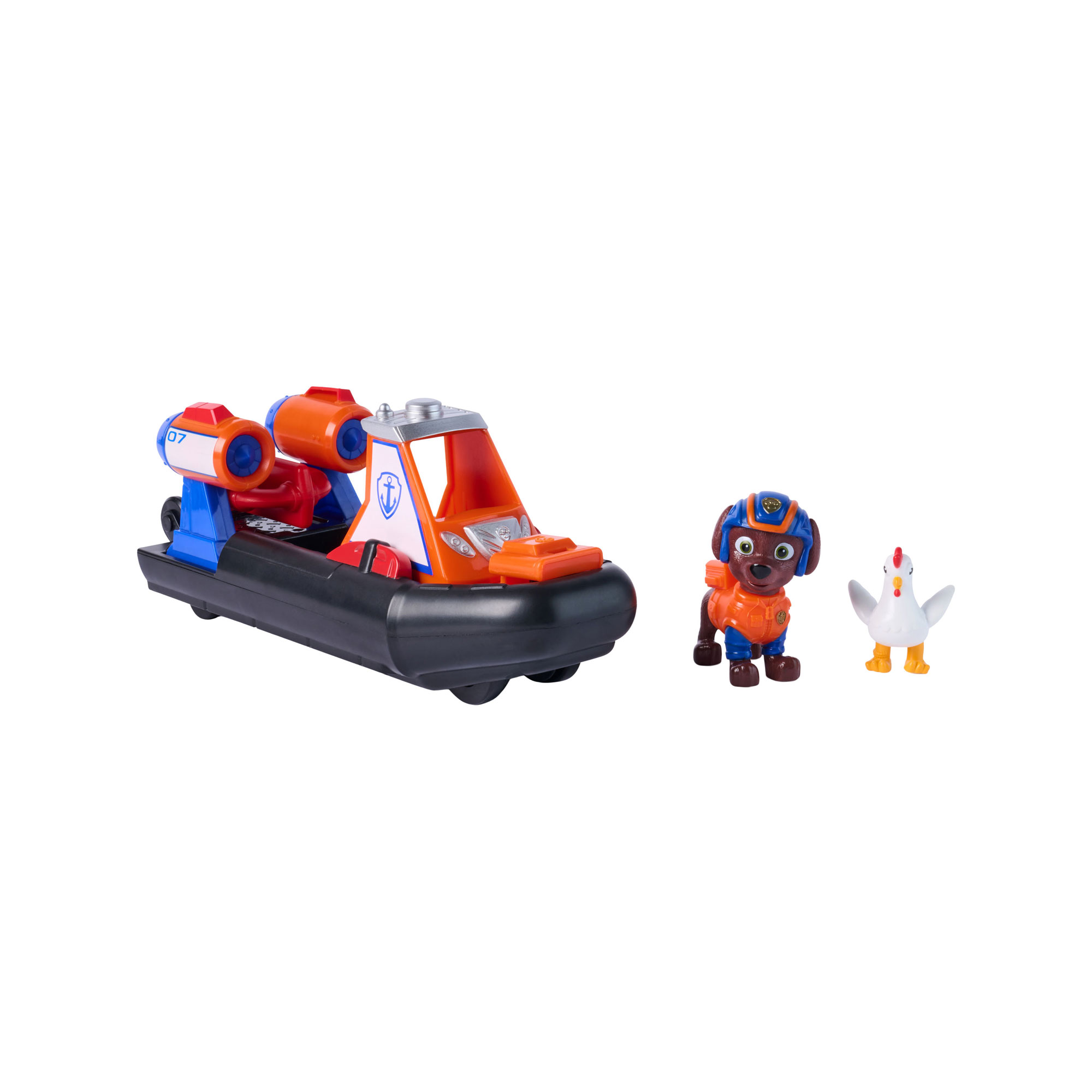 - One vehicle, one Zuma figure, one Chickaletta figure, water vehicle style, pull-back action