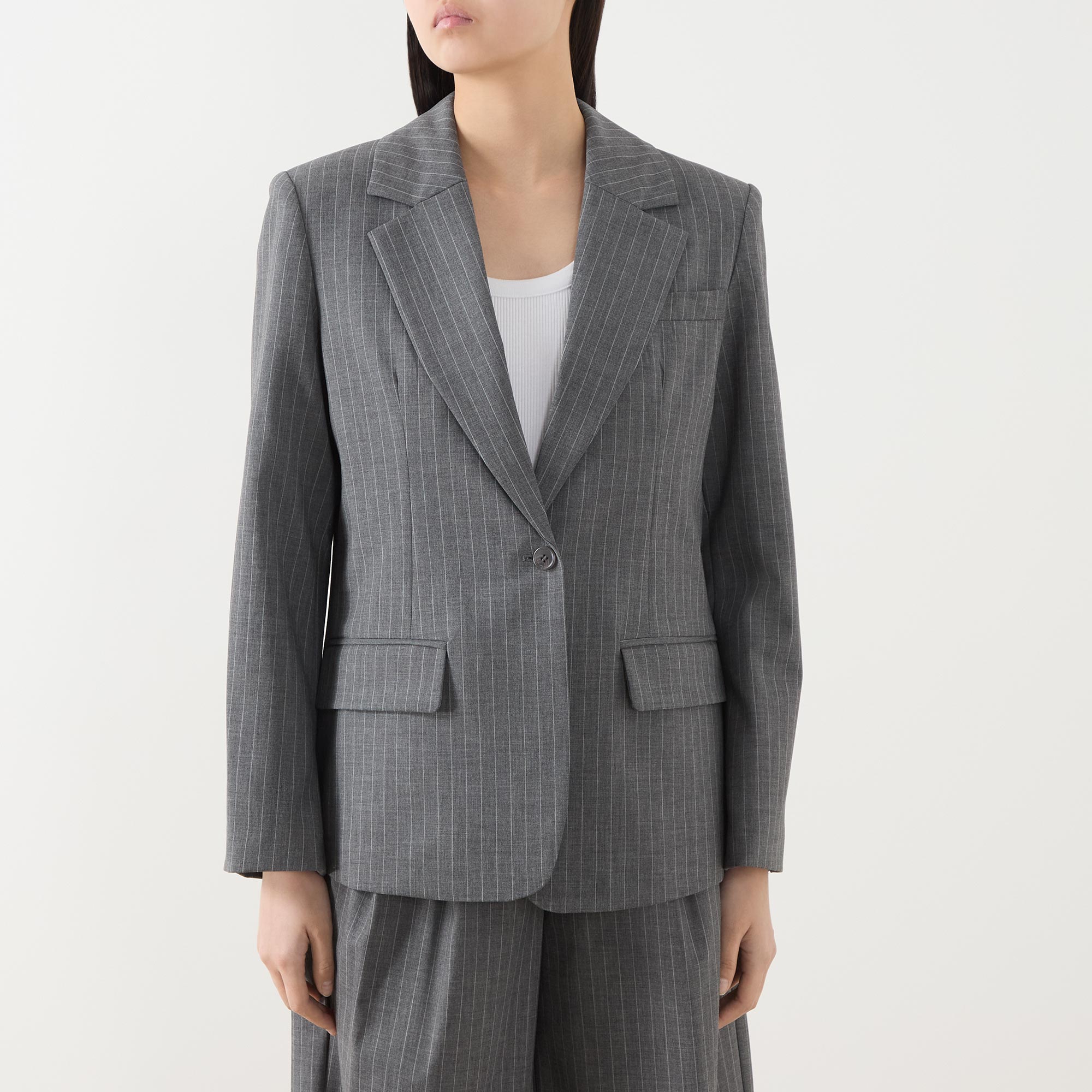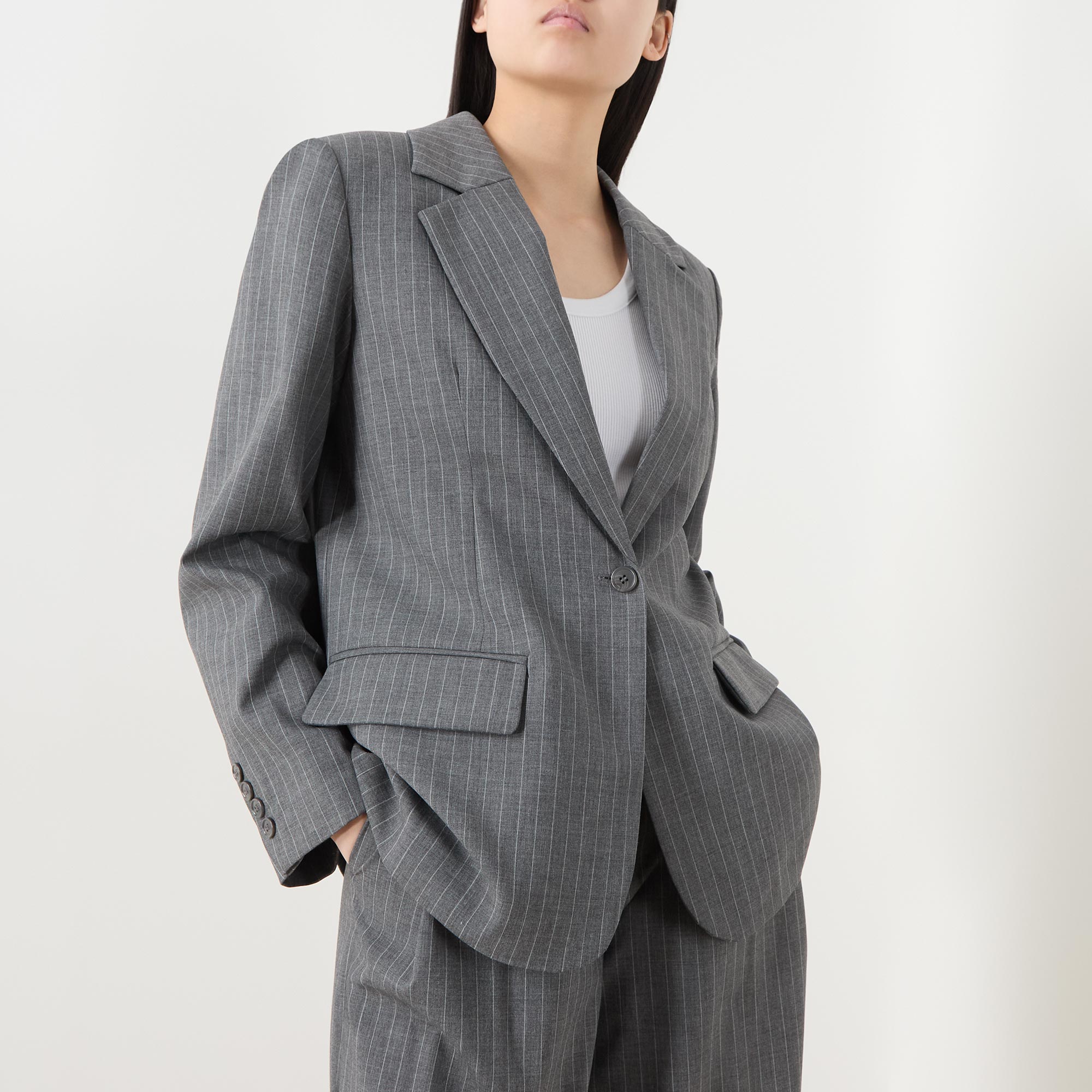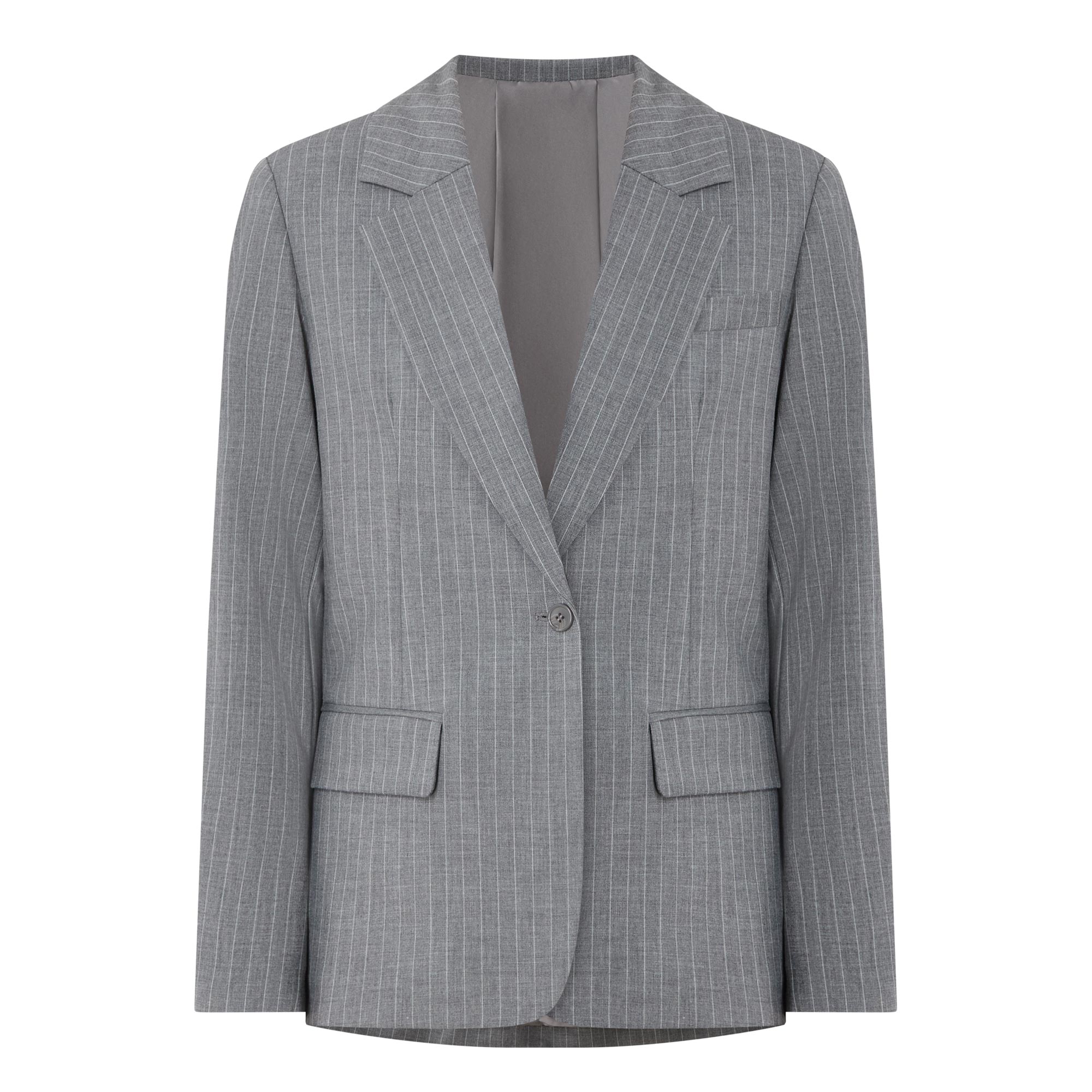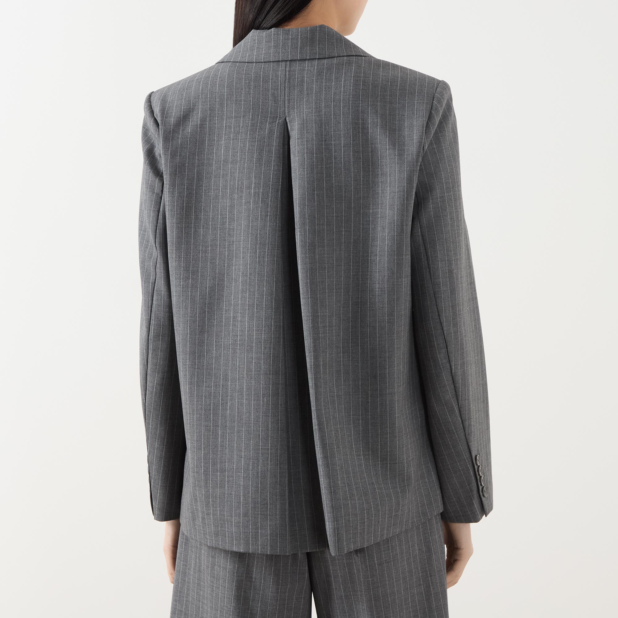 - Single-breasted, button fastening, long sleeves, notched lapels, flap pockets, chest pocket, pinstripe pattern, inverted pleat to the back
