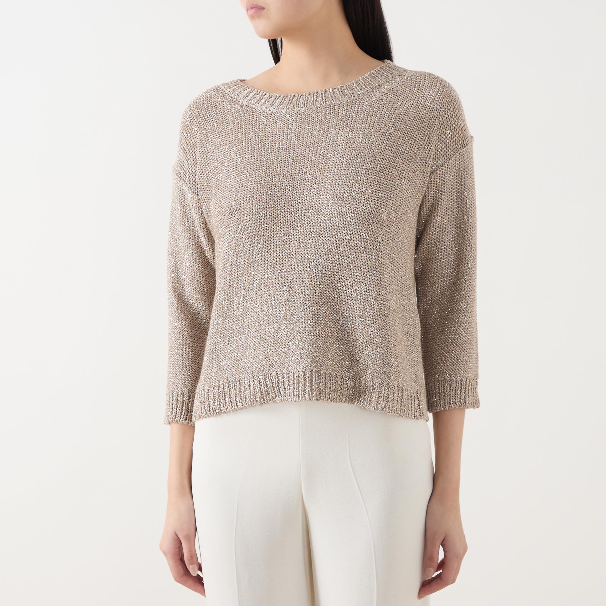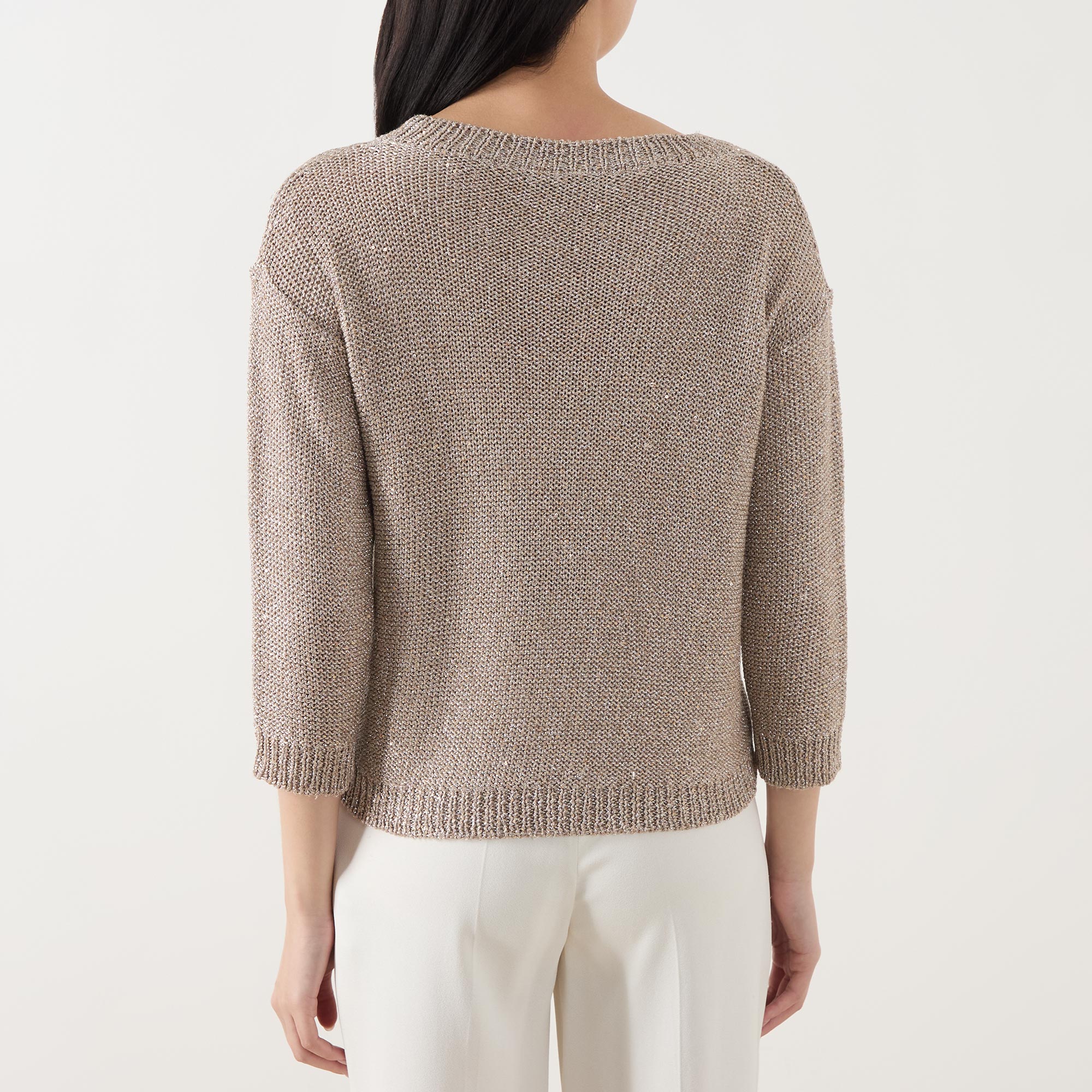 - Boat neckline, three-quarter-length sleeves, dropped shoulders, ribbed trims, knit structure