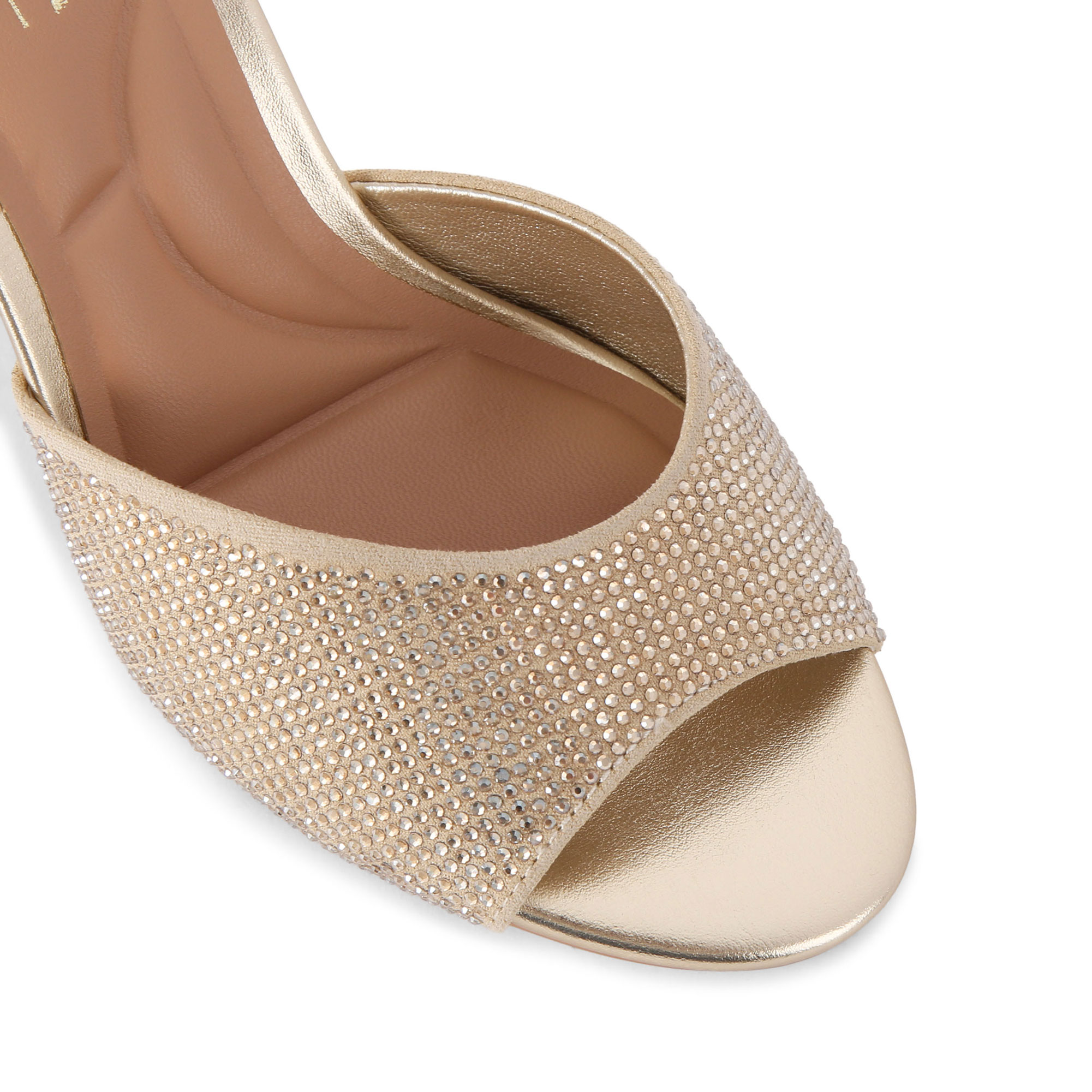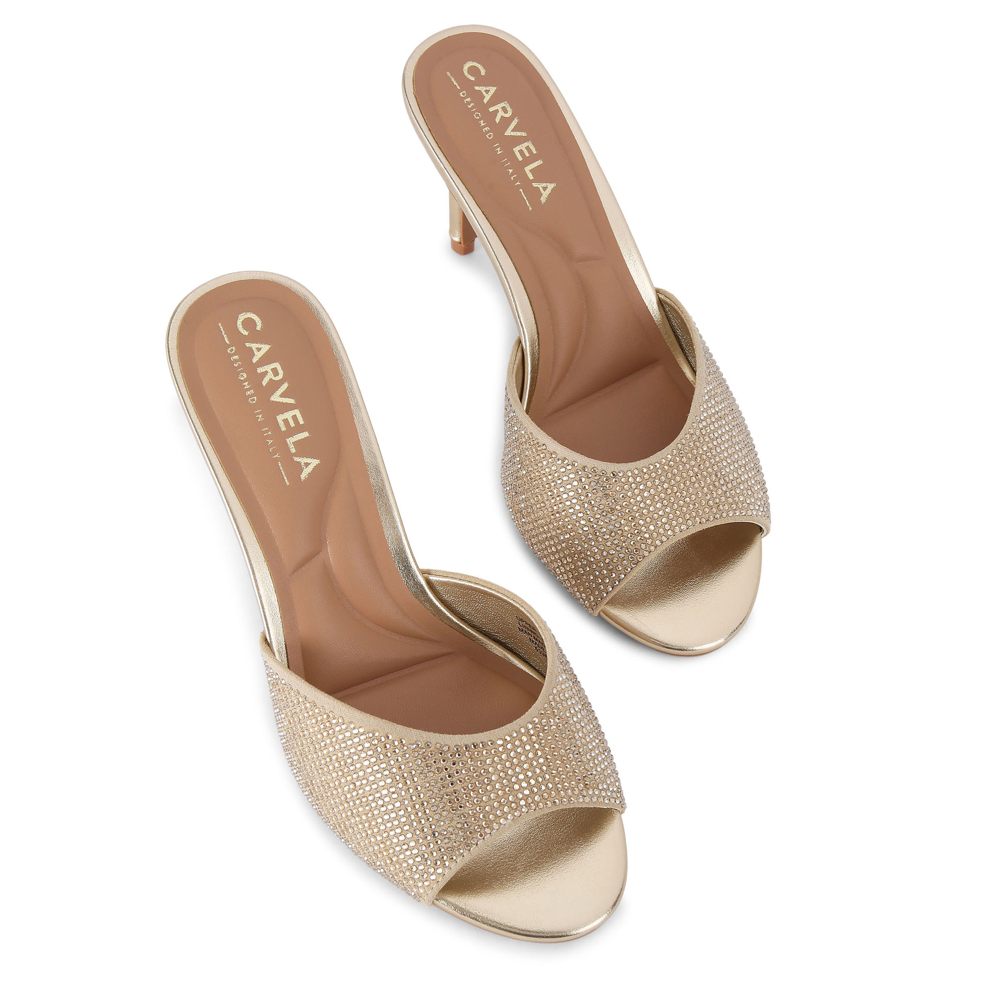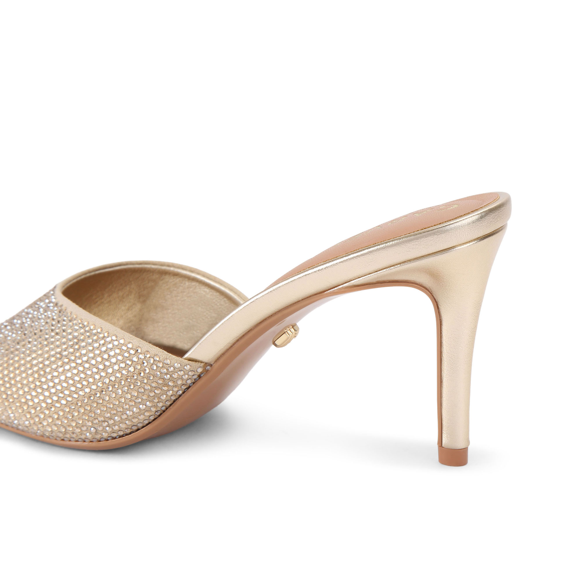 - Mule style, fabric upper, gold-tone crystal embellishment, open toe, stiletto heel