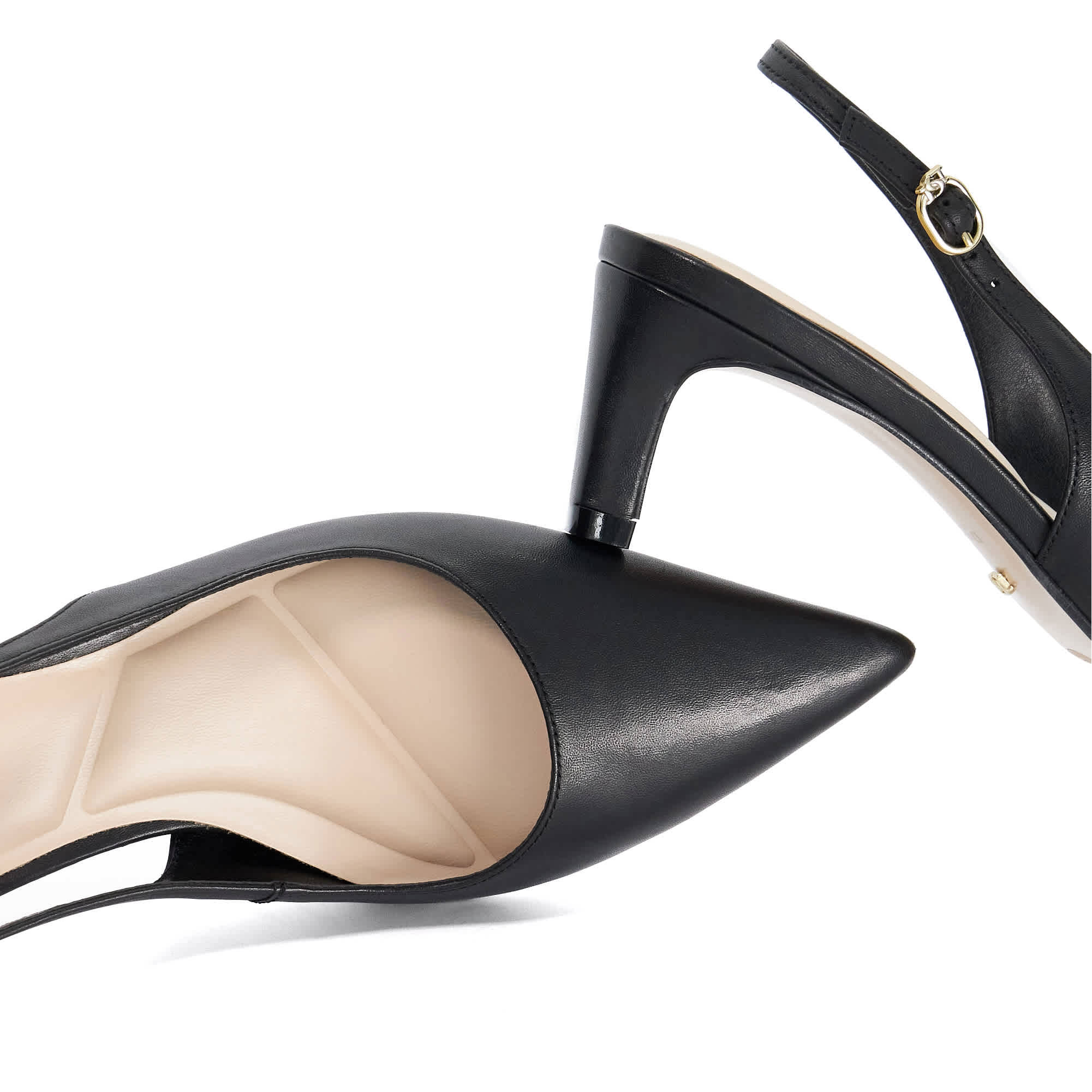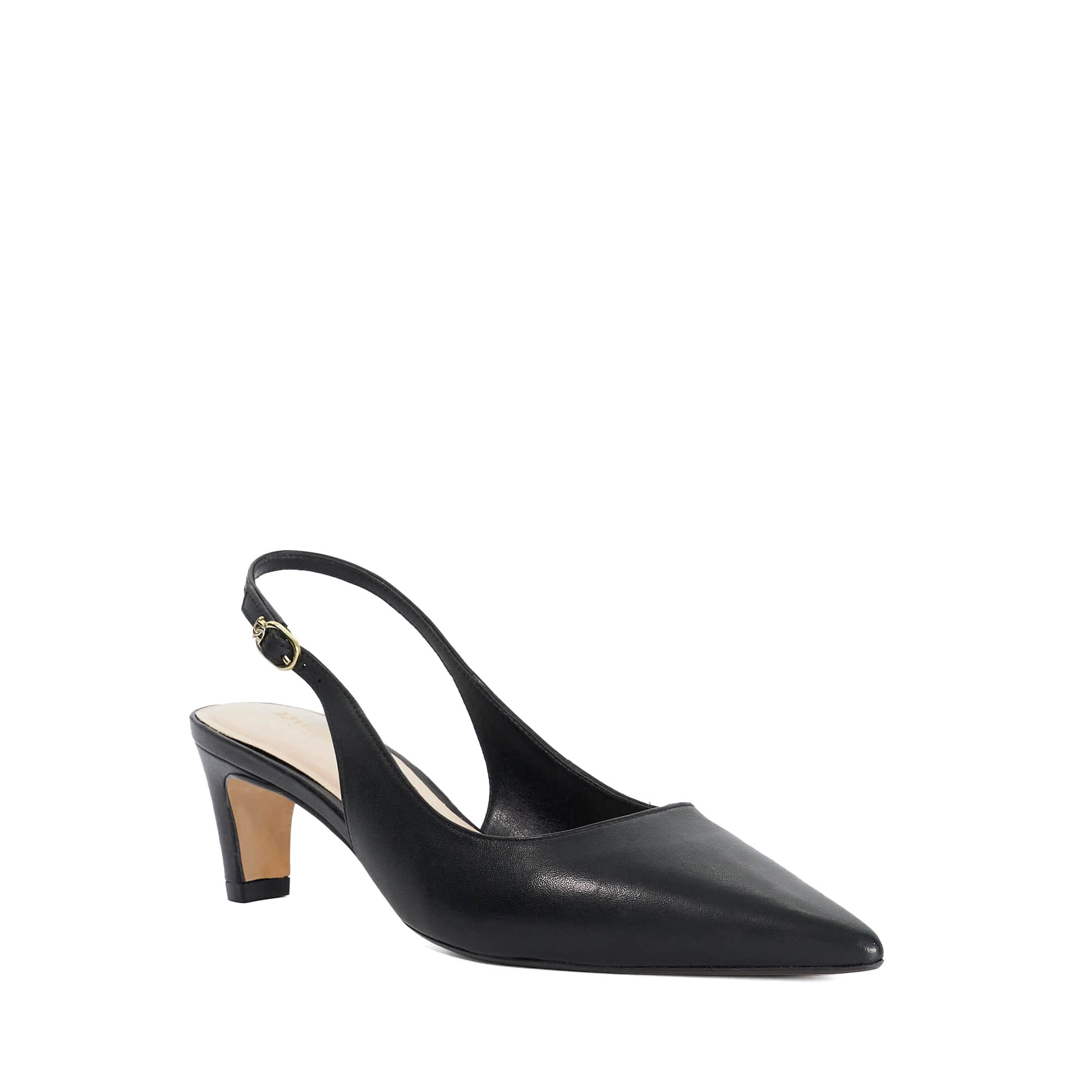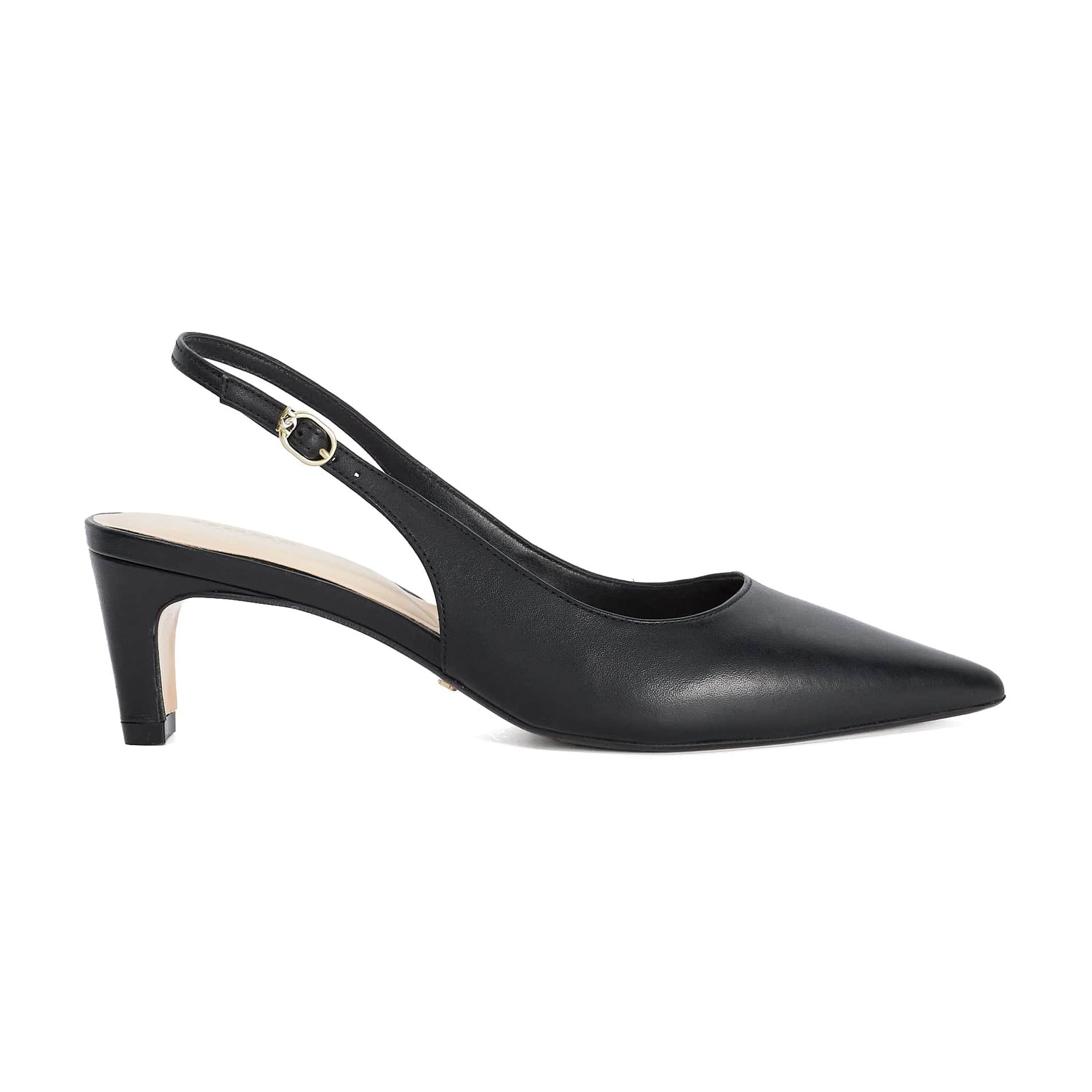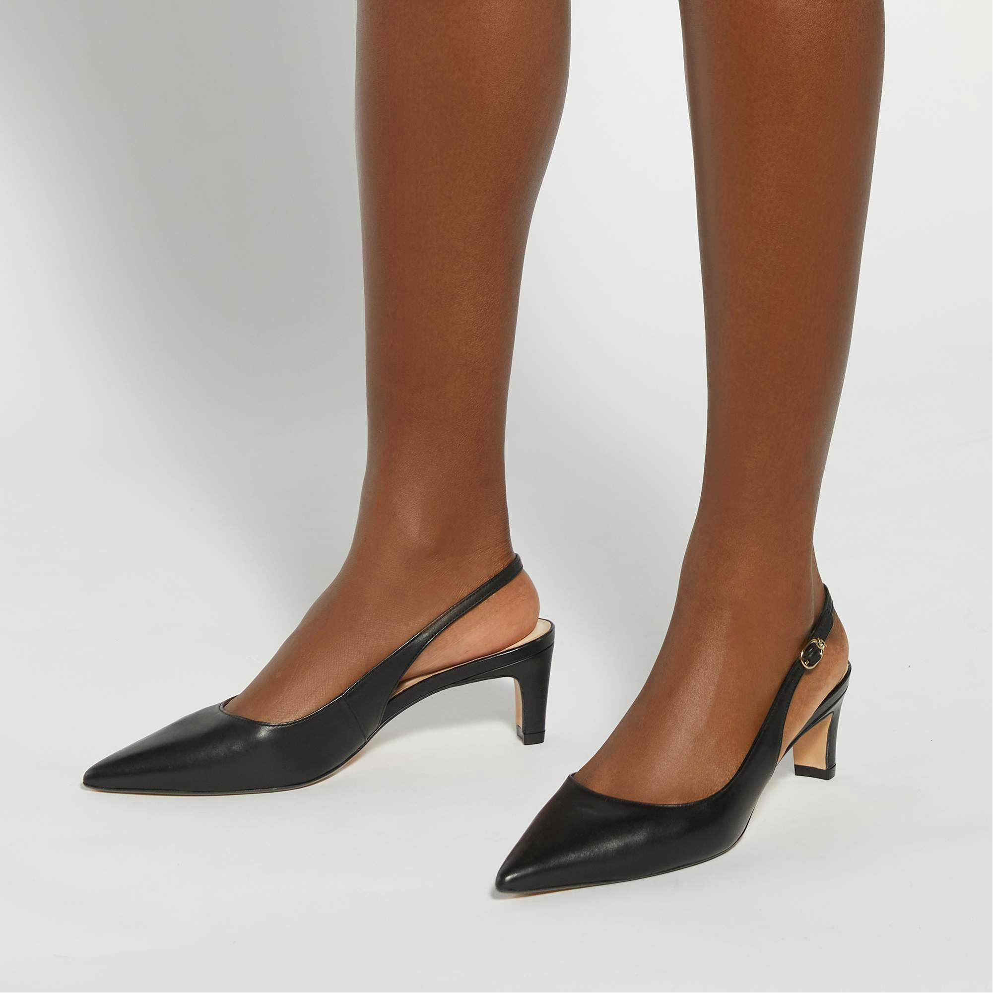 - Slingback style, pointed toe, adjustable ankle strap, mid-height kitten heel, buckle fastening