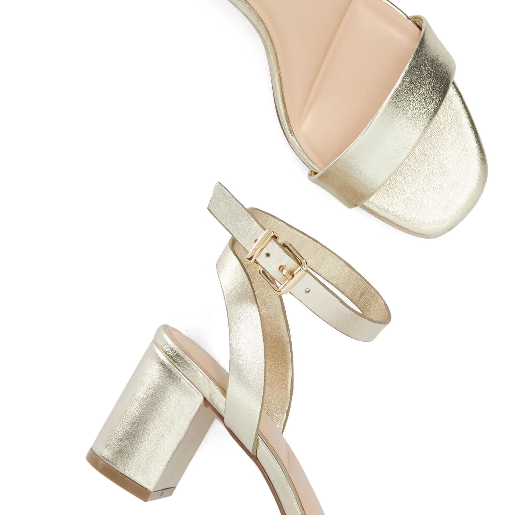- Suede upper, adjustable ankle strap, mid-height block heel