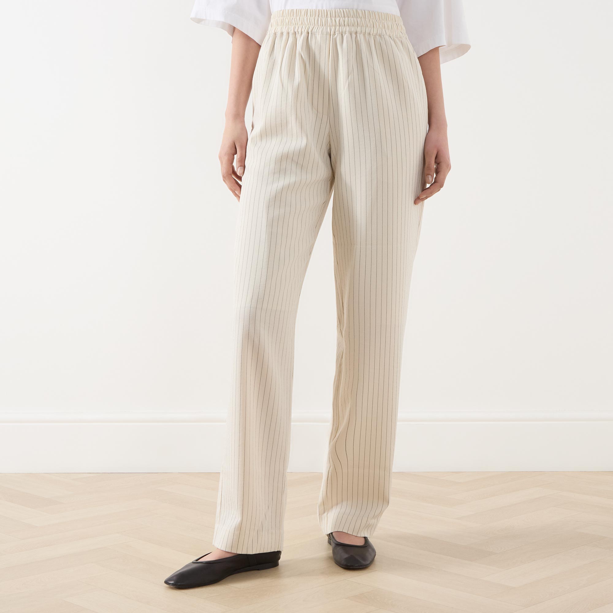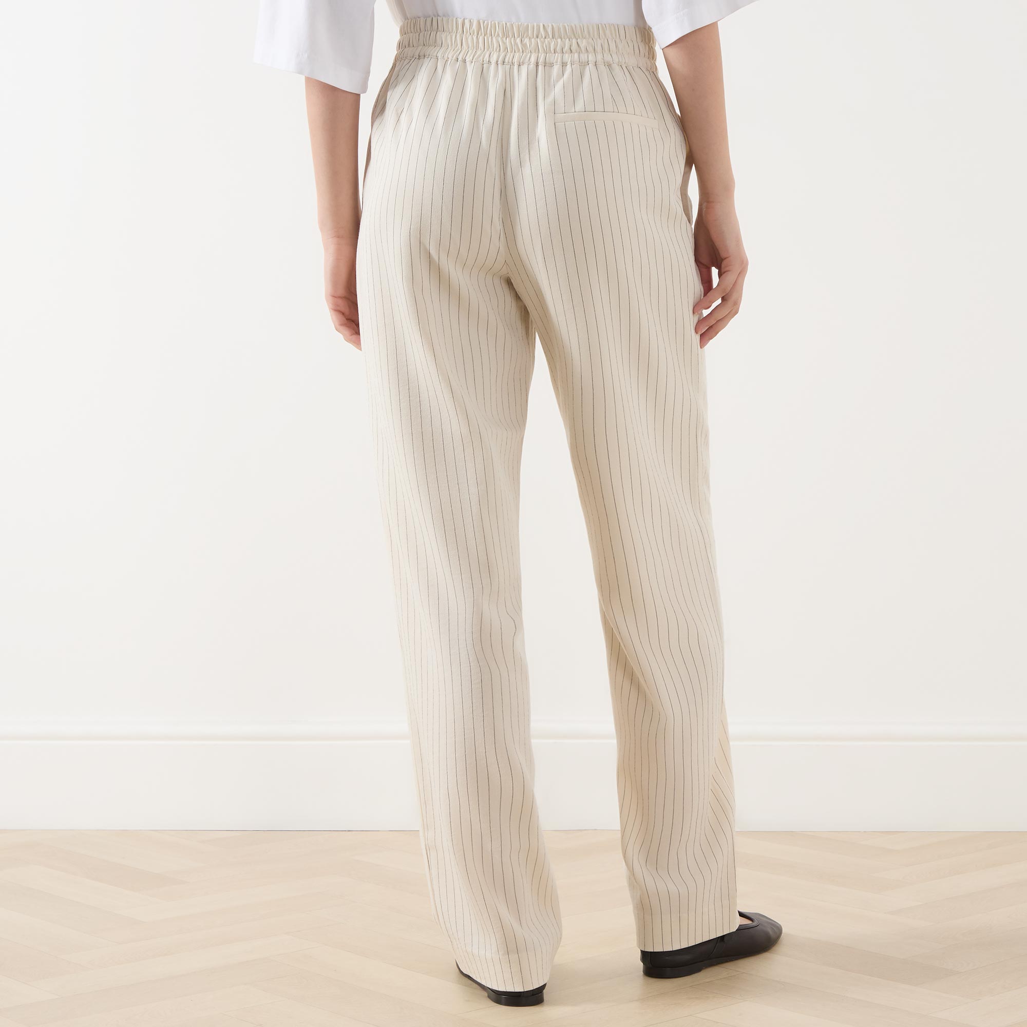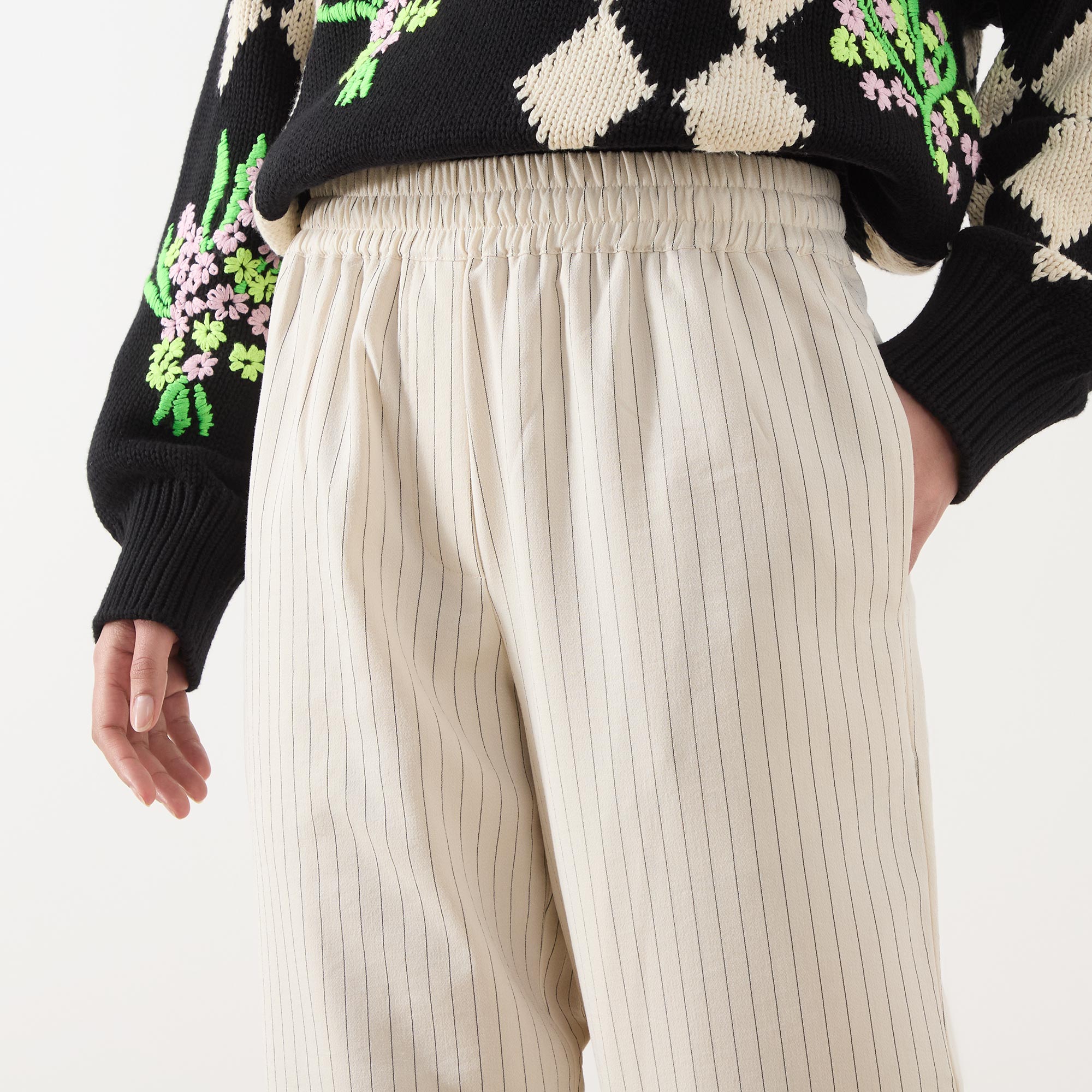 • Tapered leg, striped, elasticated waist