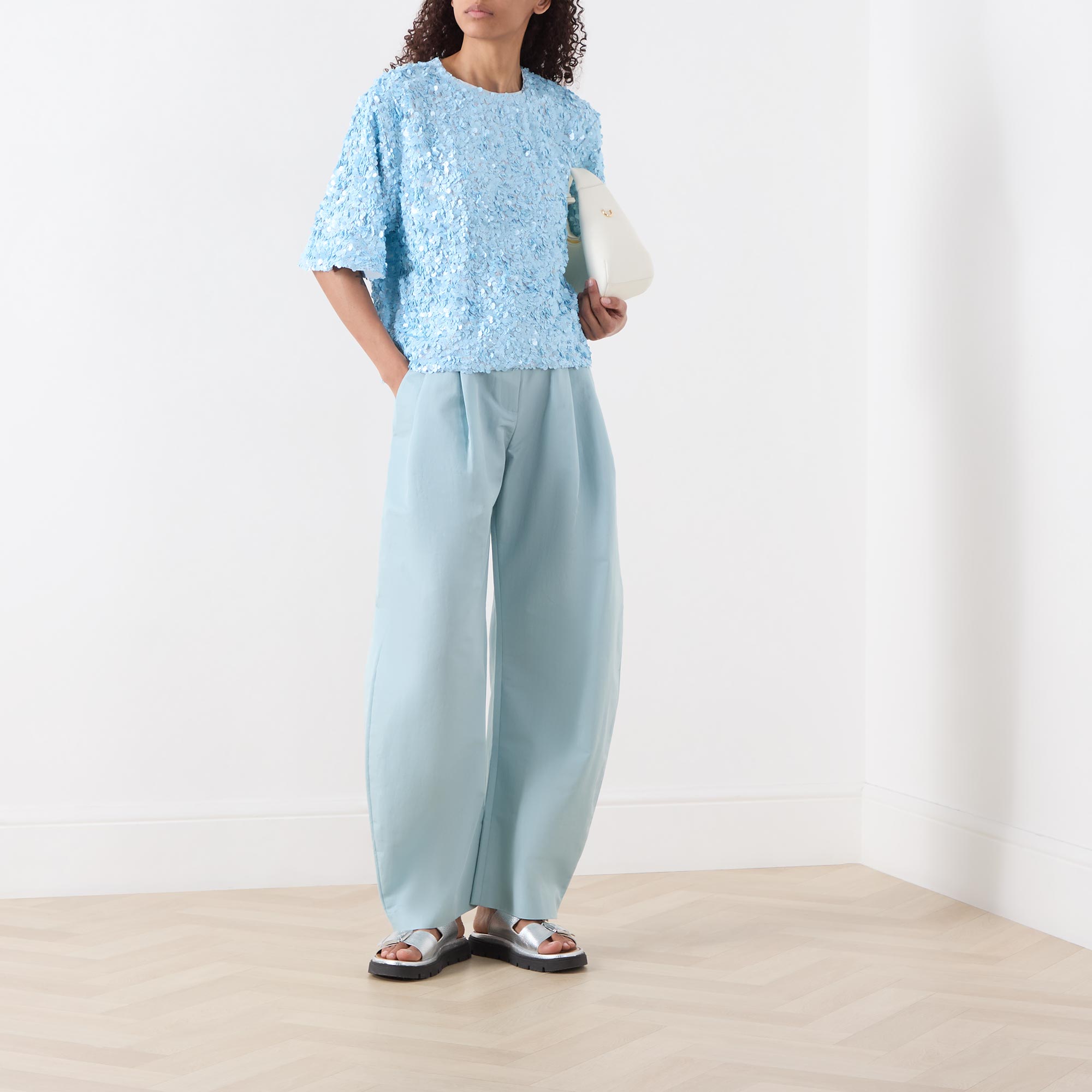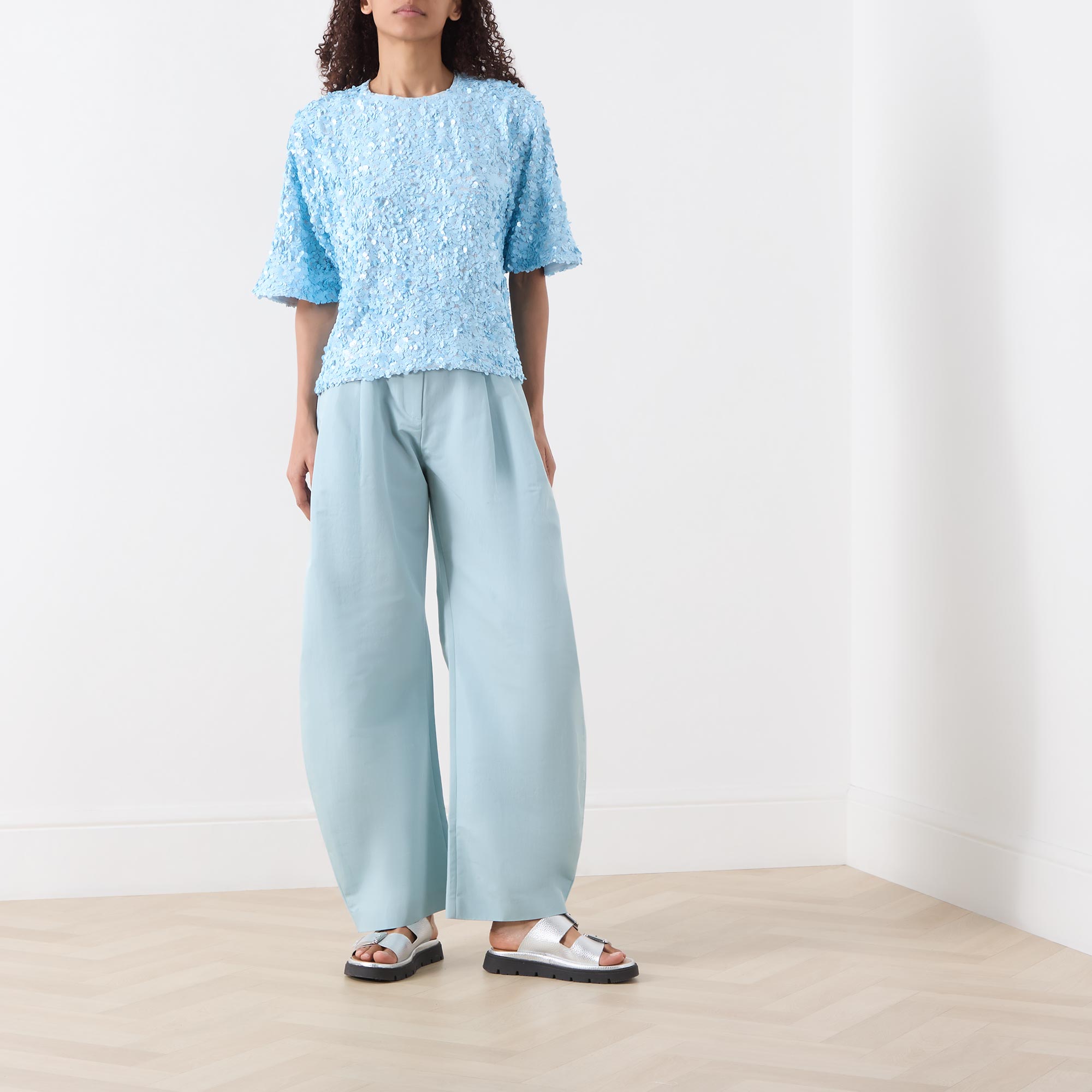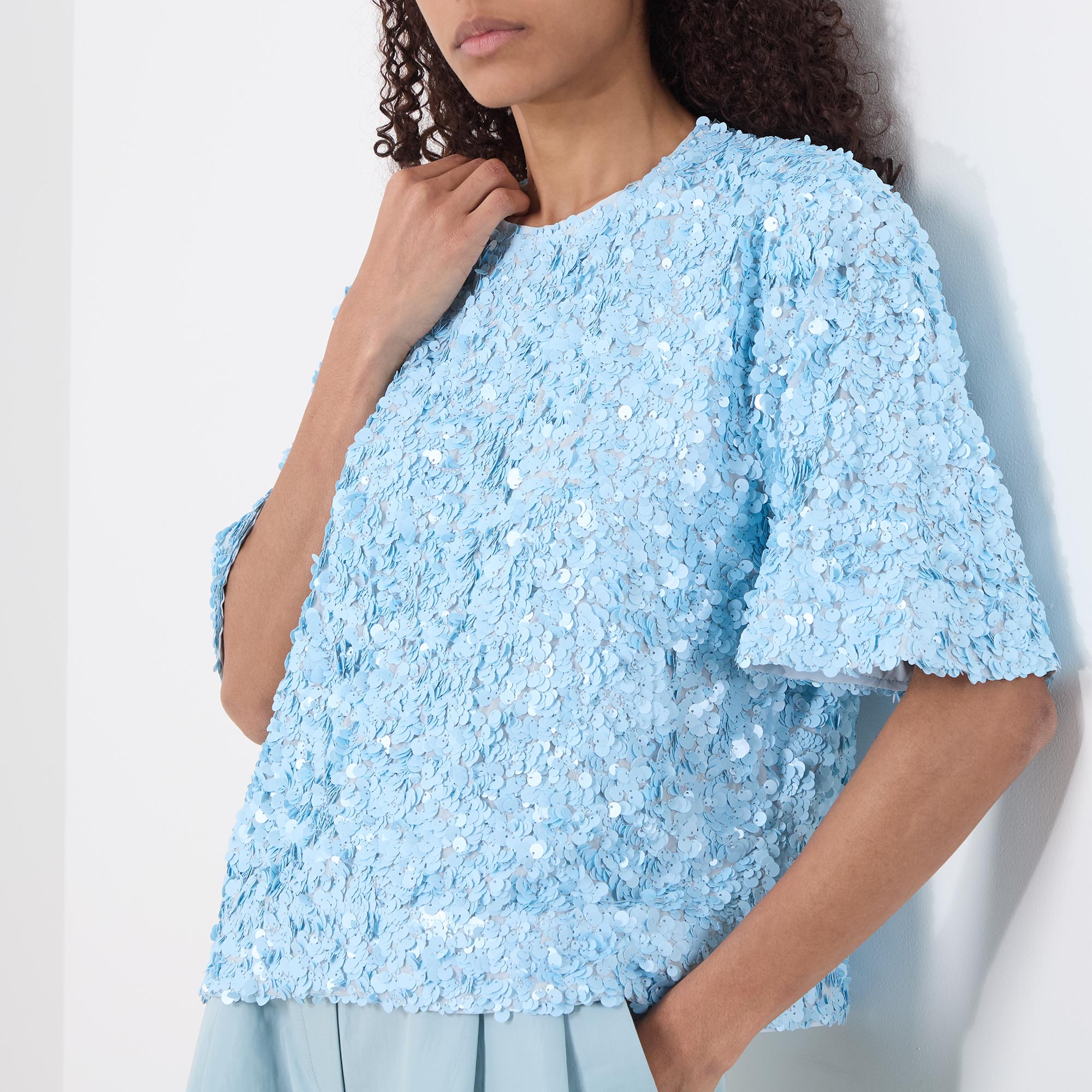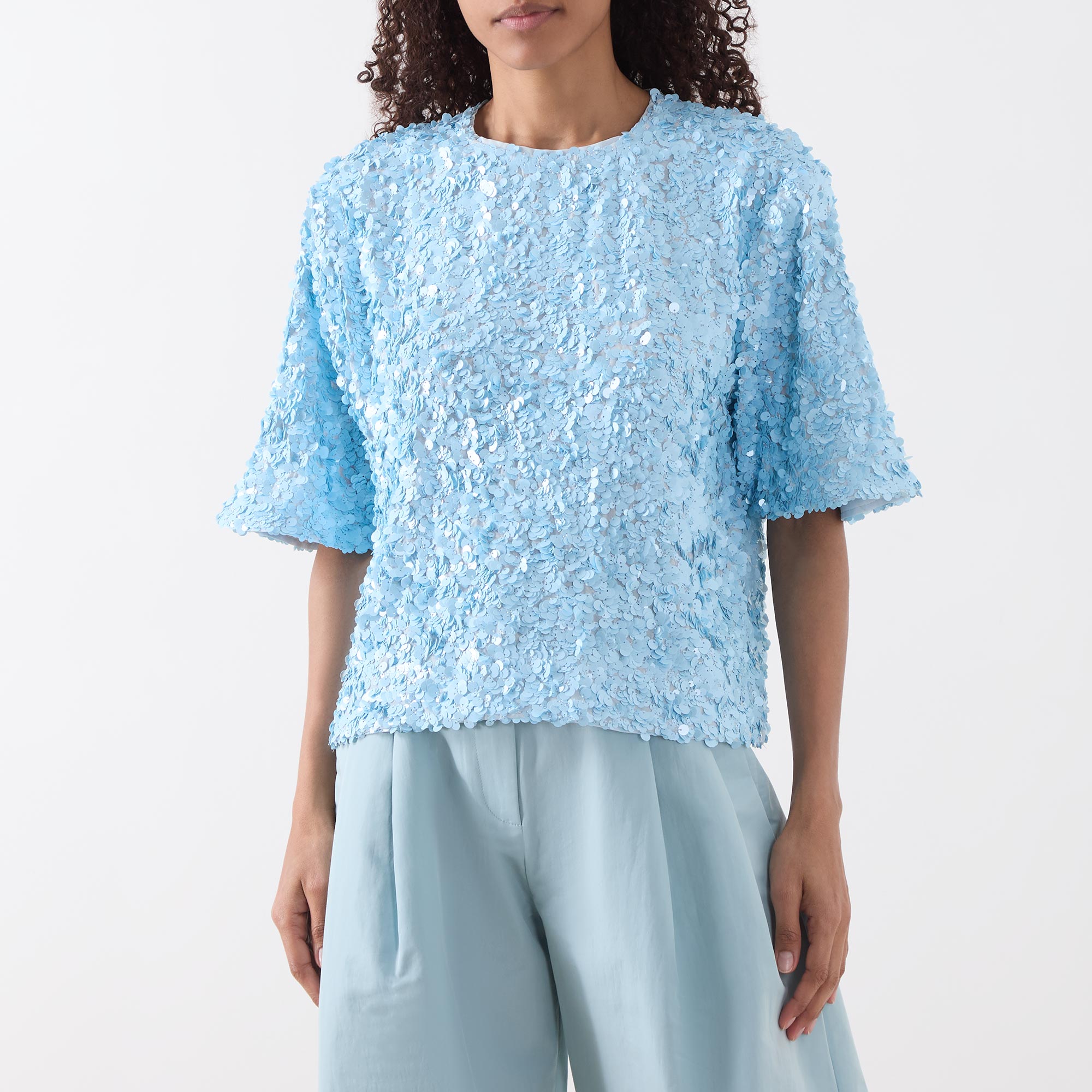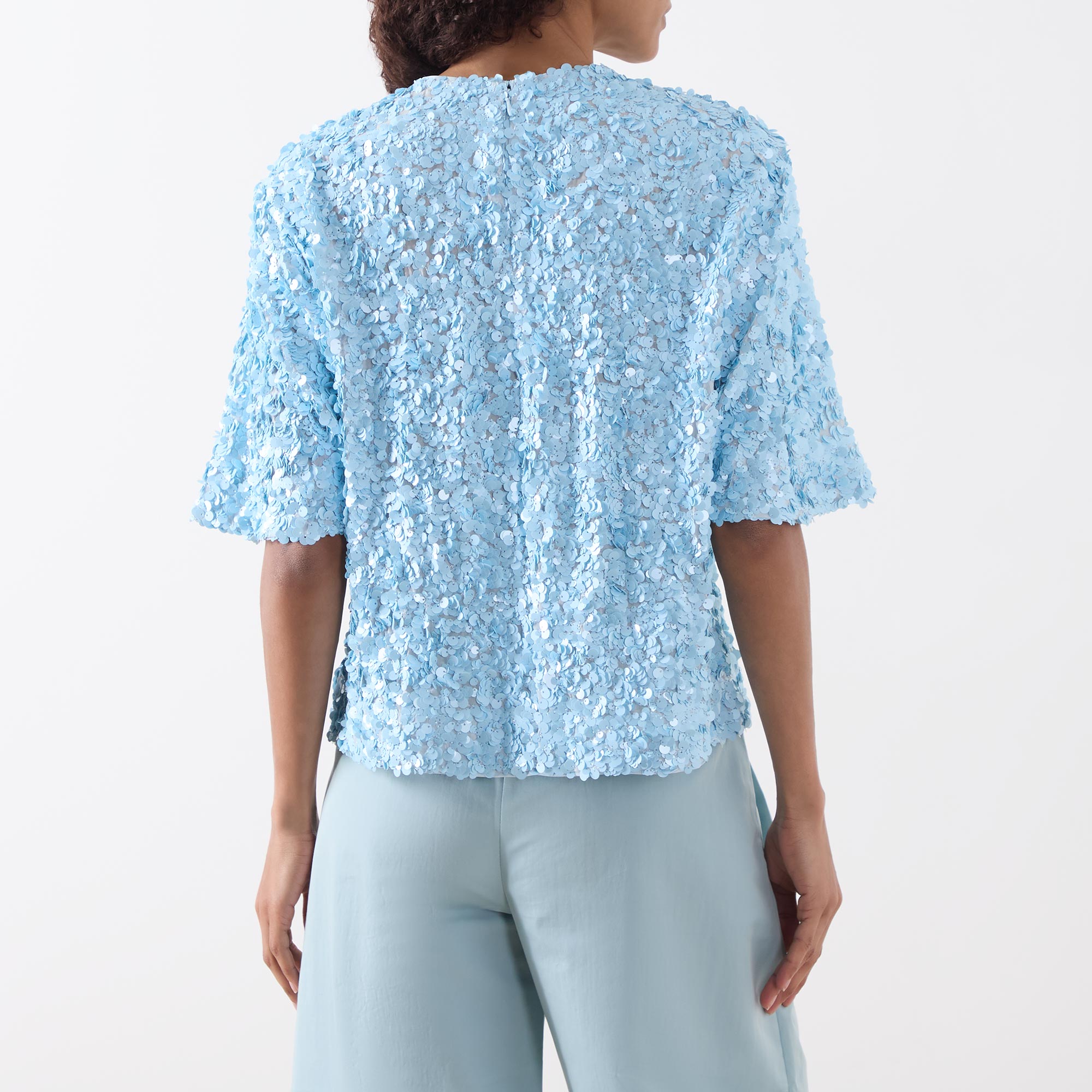 • Round neckline, dropped shoulders, short sleeves, rear zip fastening, straight hem, sequin-embellished detailing throughout, mid weight fabric