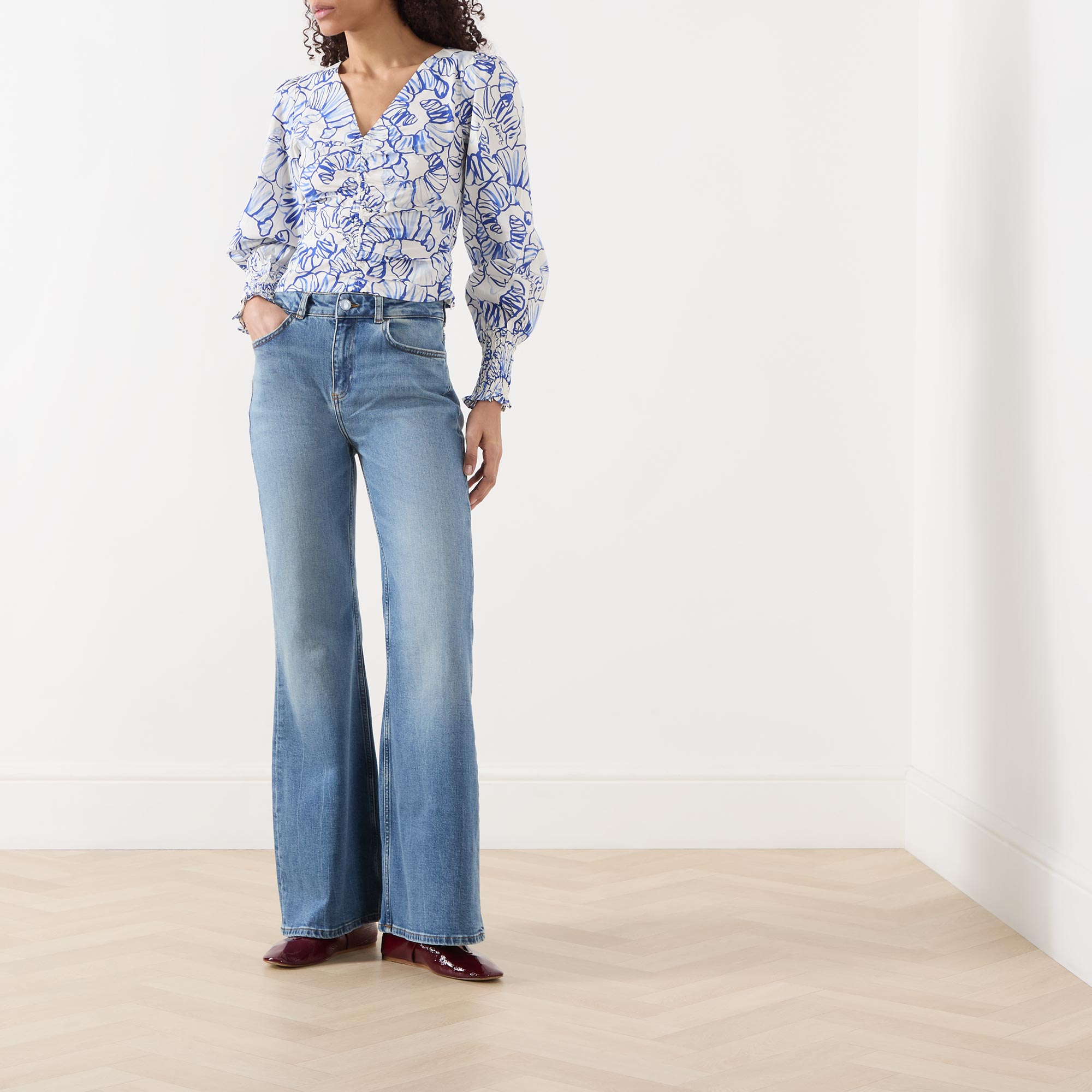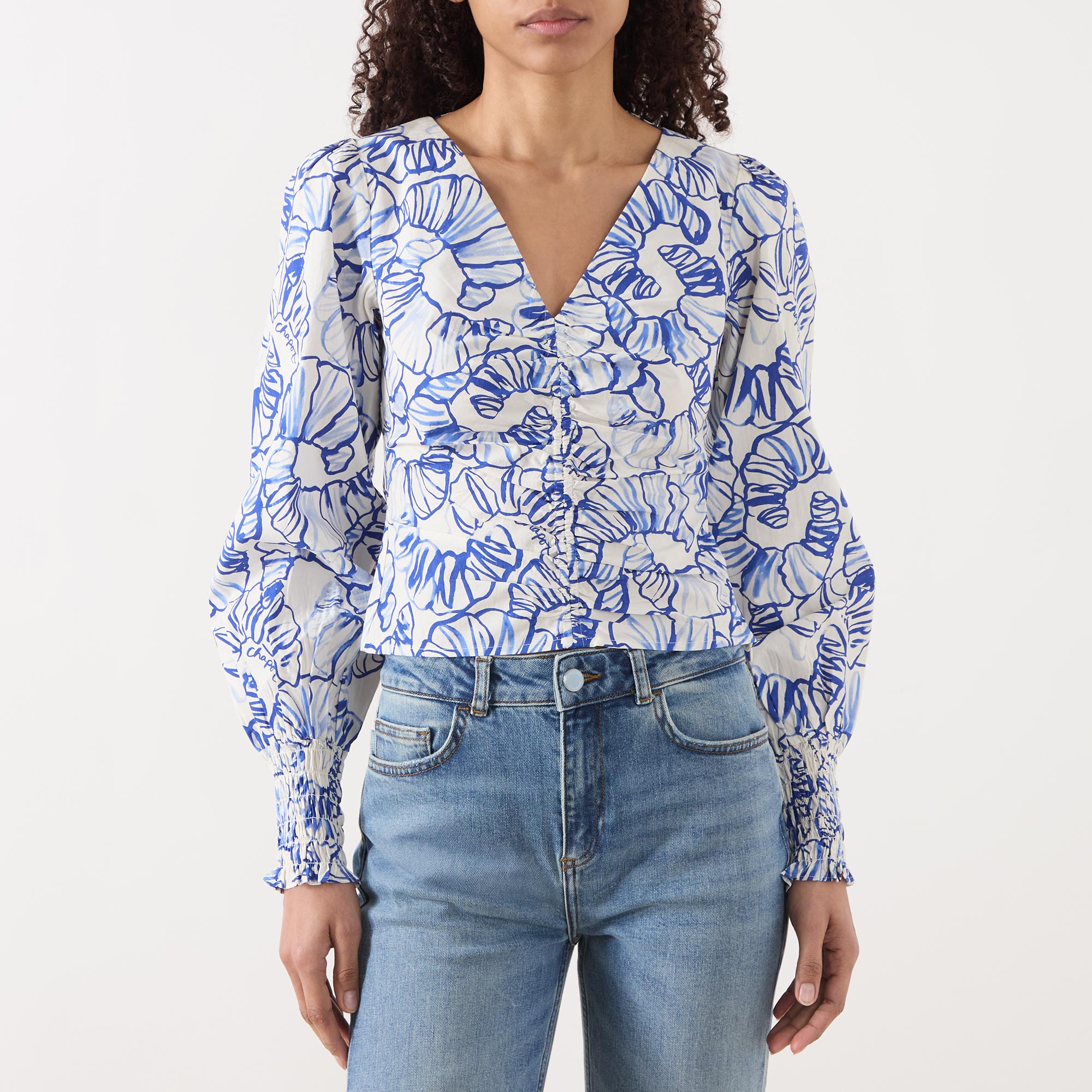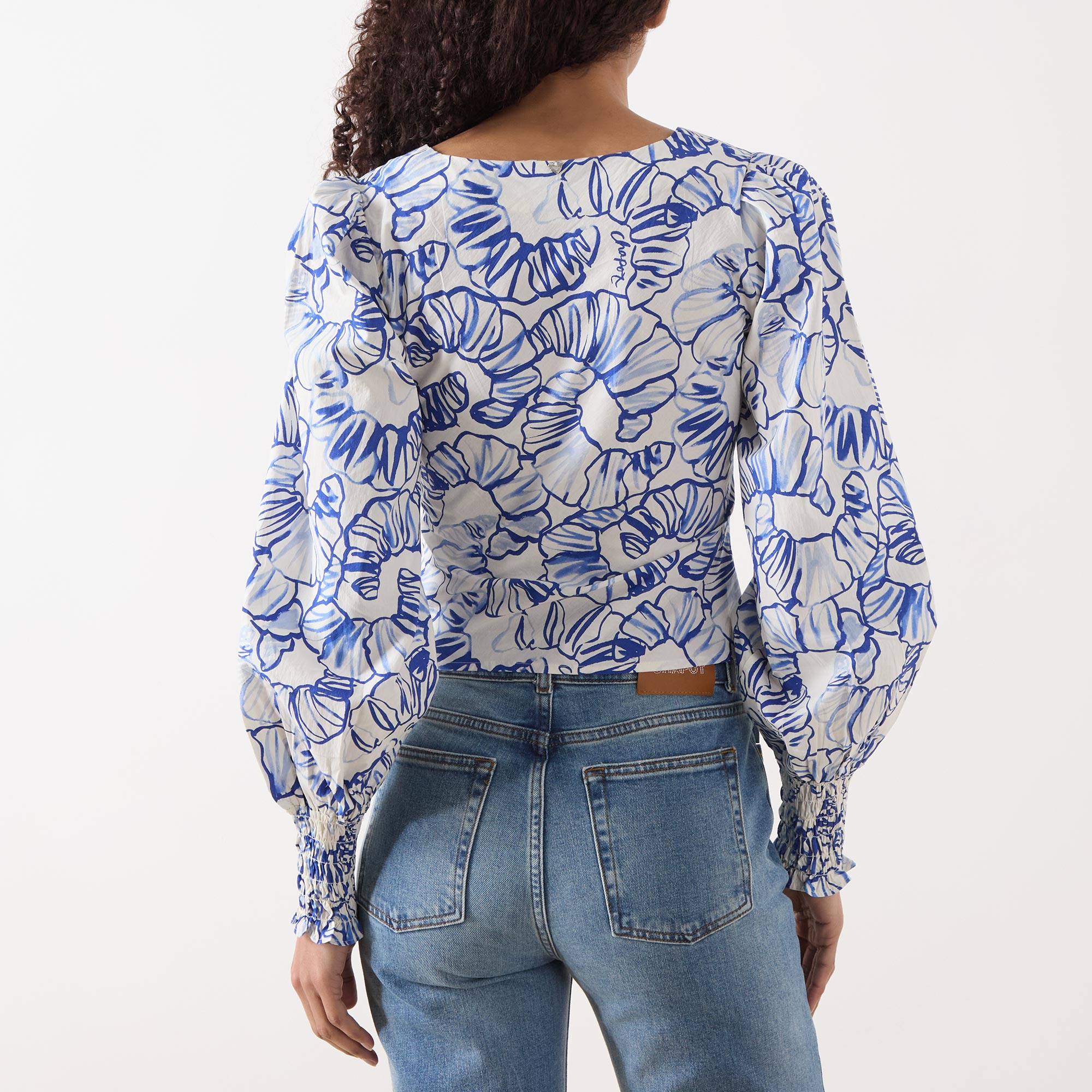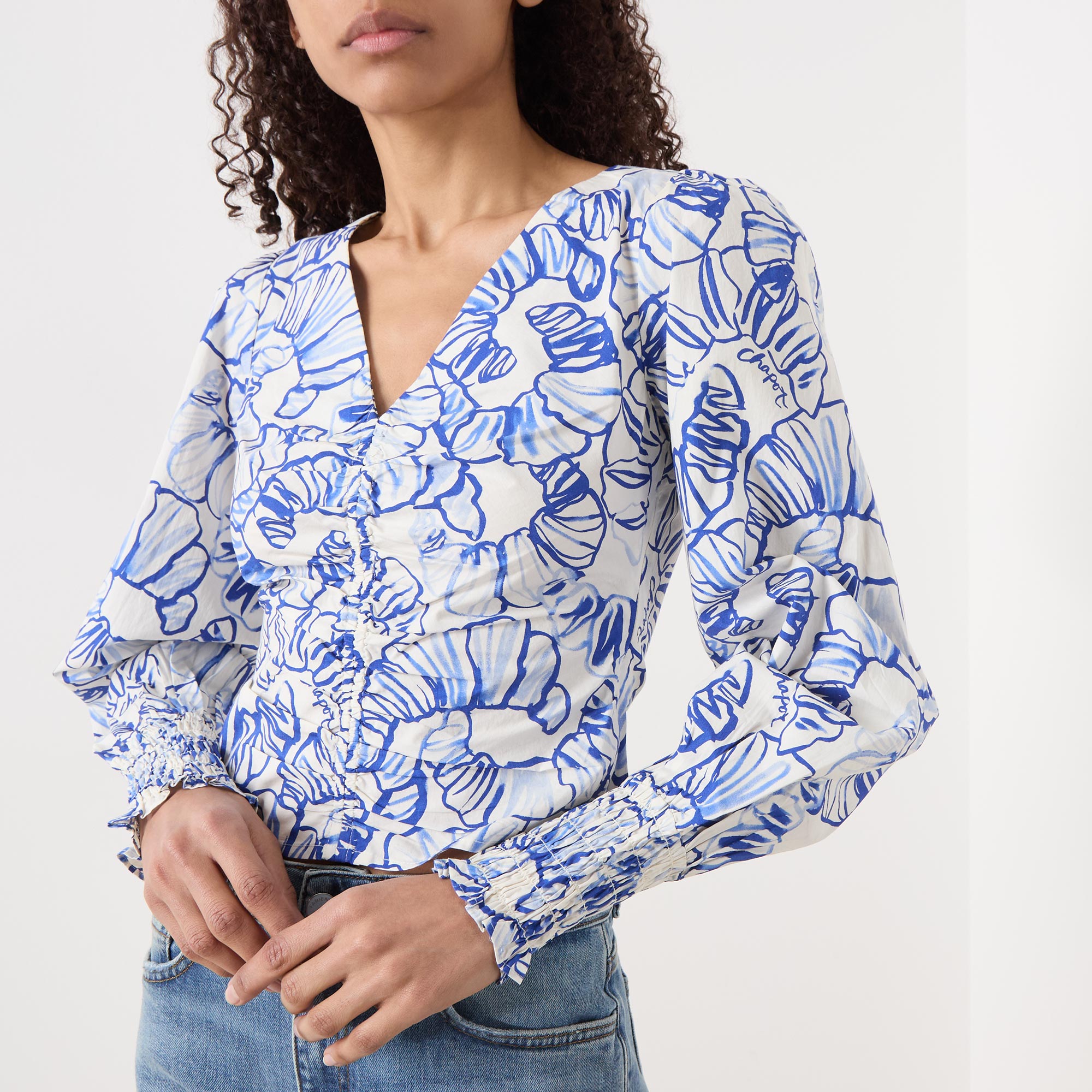 - Long sleeves, printed, V-neckline, blouson sleeves, slightly cropped length