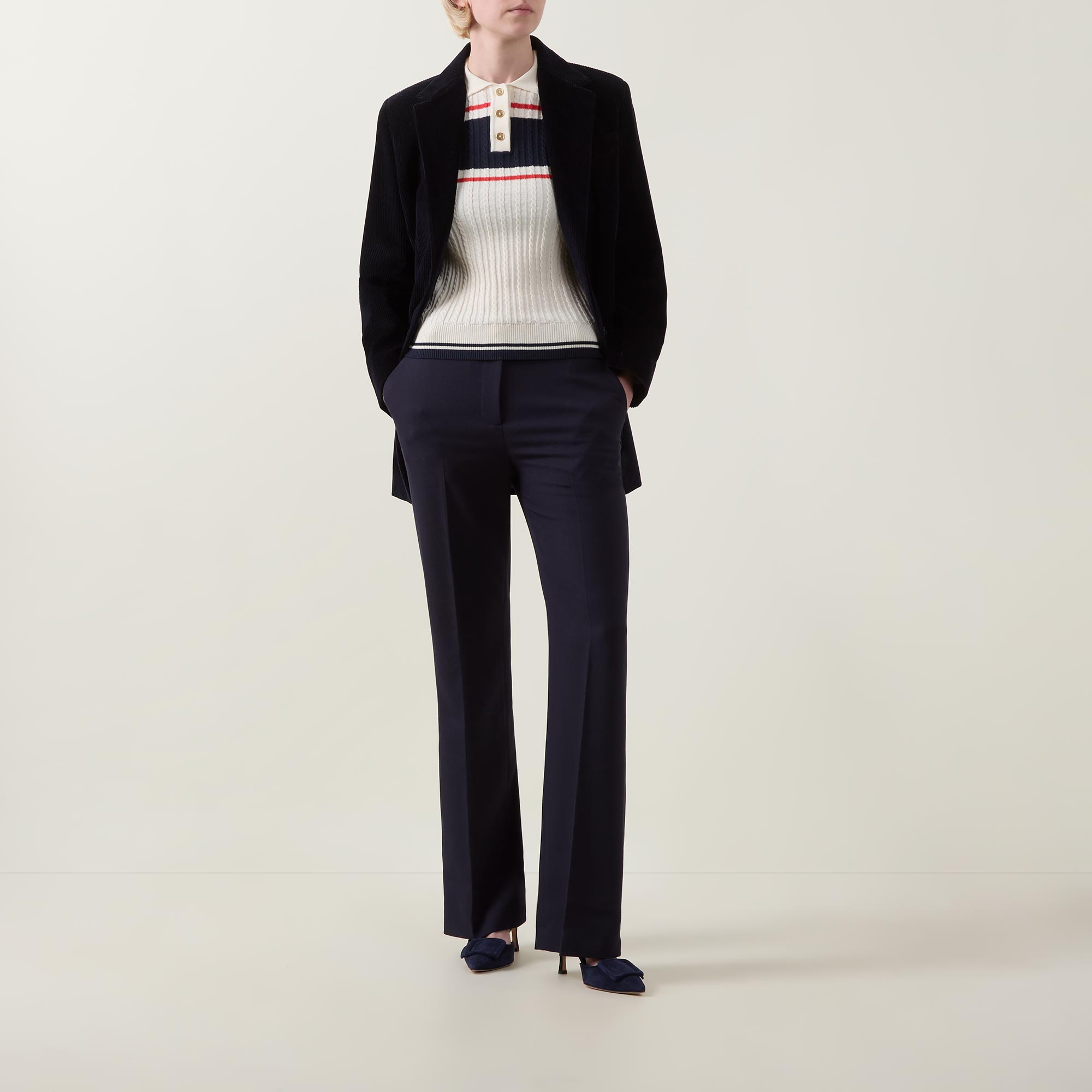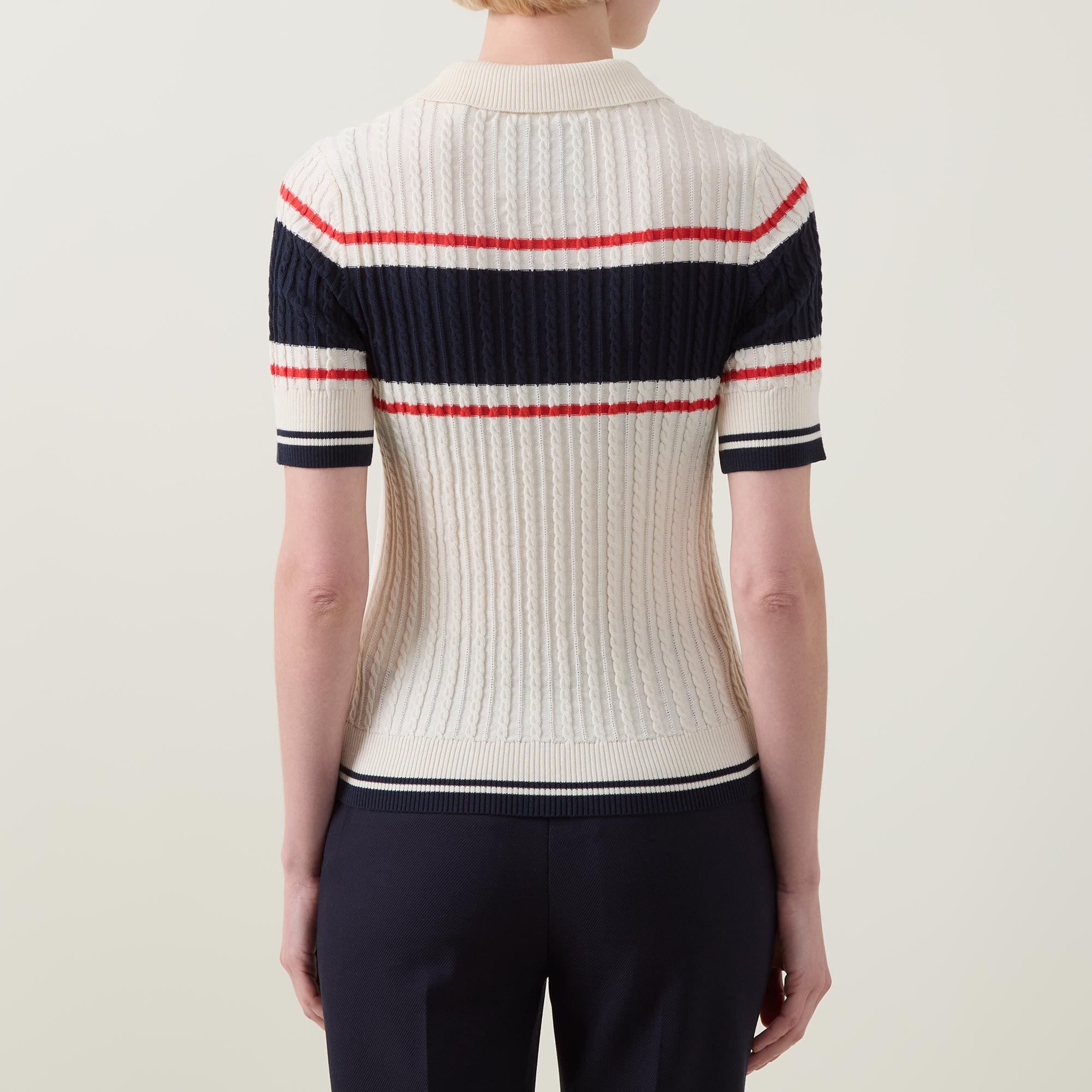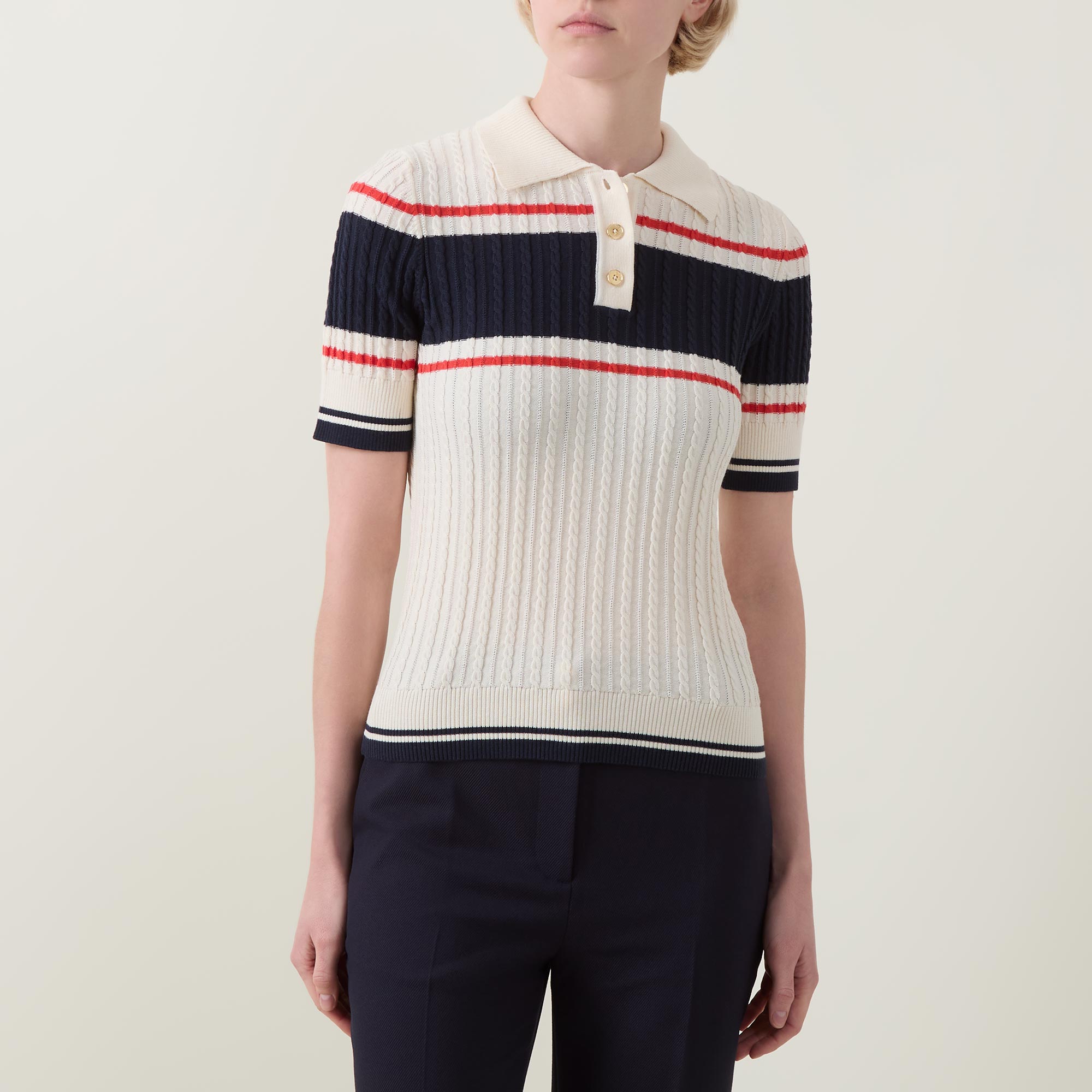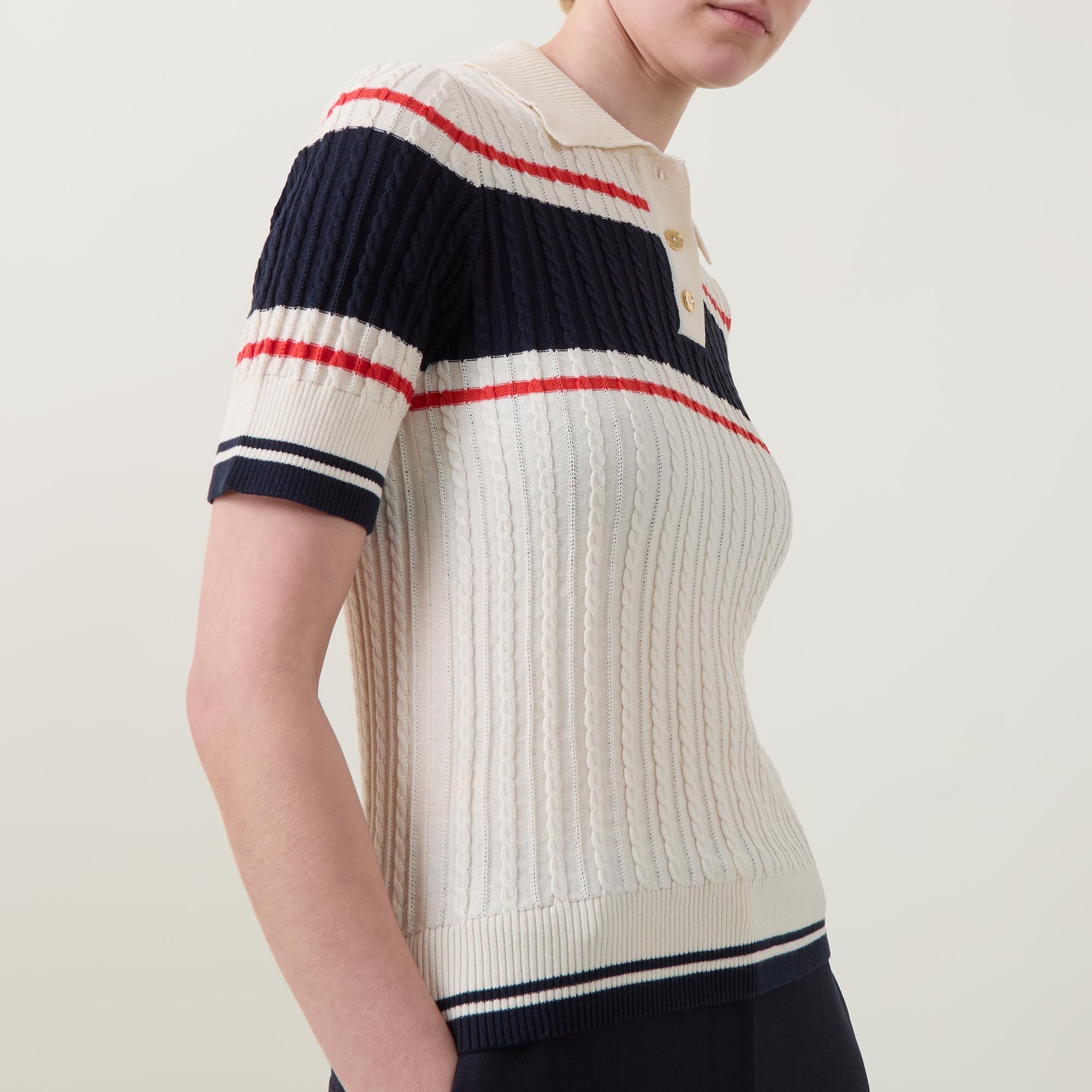 - Polo collar, three button placket, short sleeves, straight hem, ribbed trims, contrast tipping, colour-block striped detailing, cable knit construction, soft finish