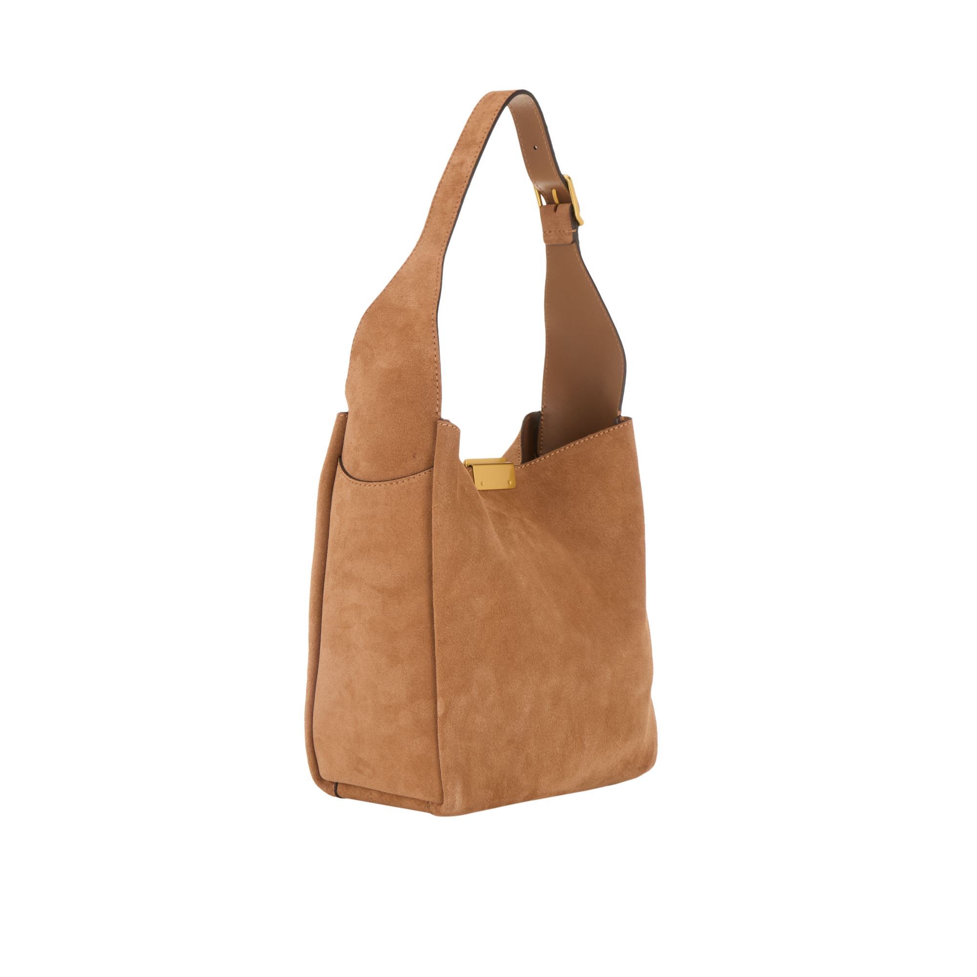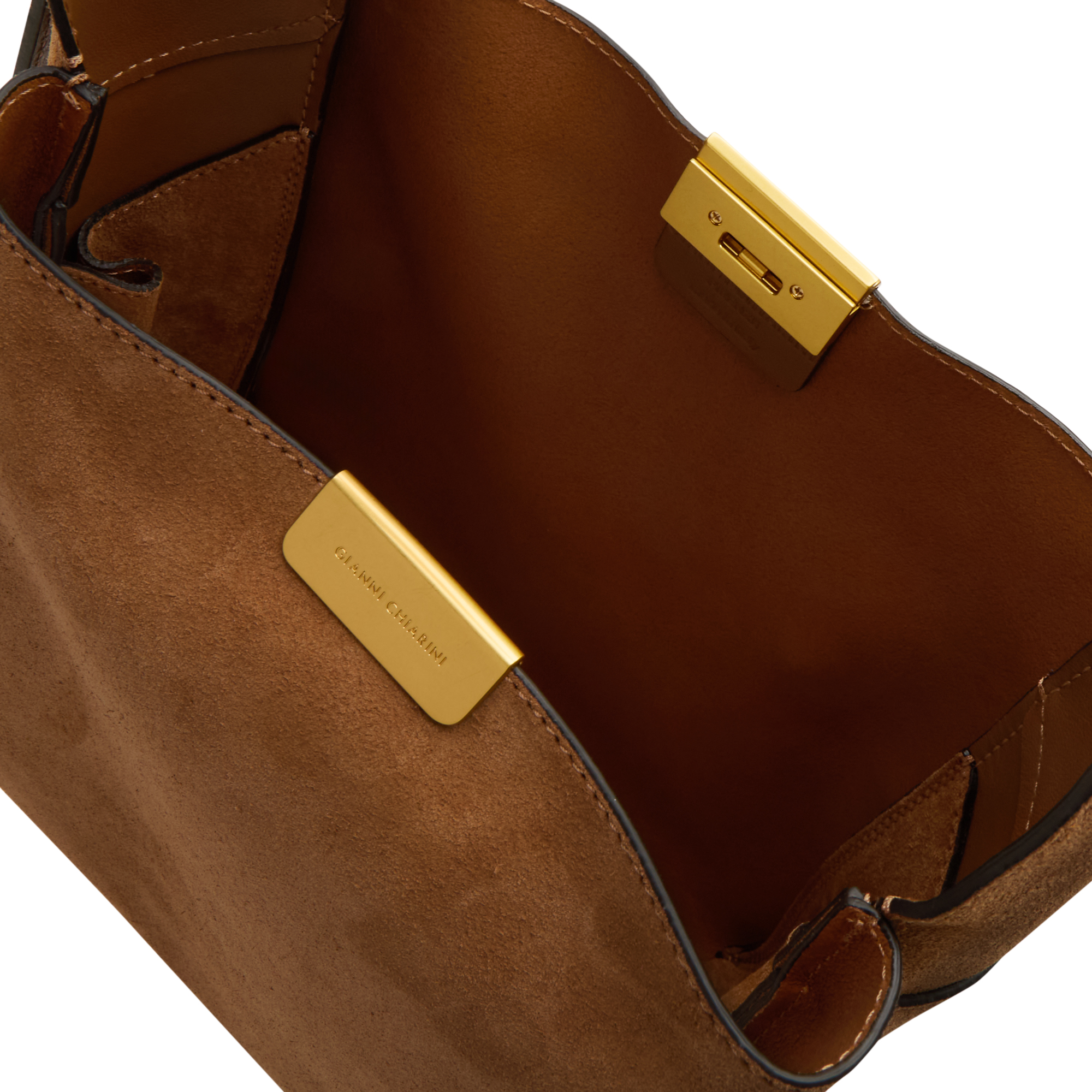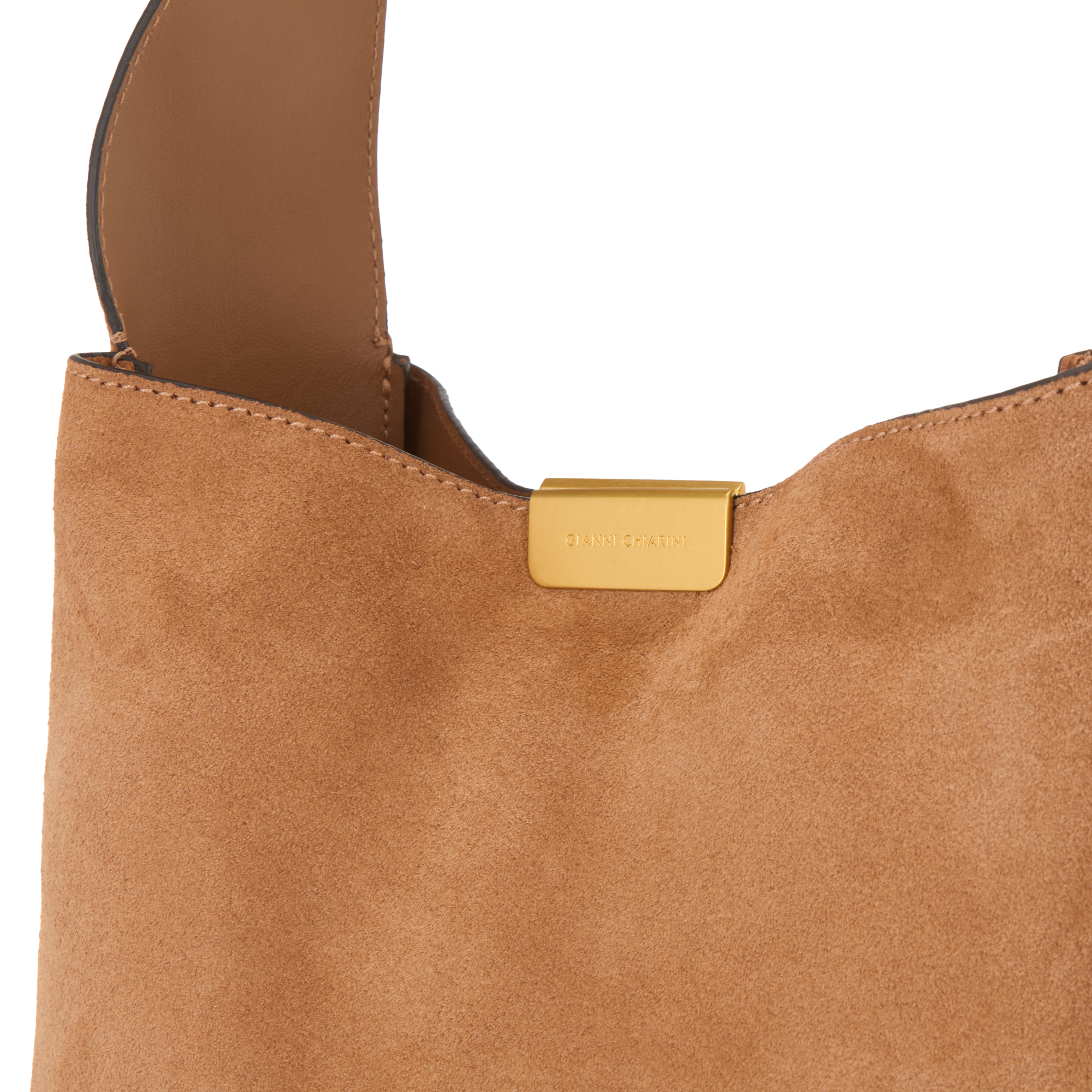 - Adjustable shoulder strap, hardware clasp fastening with engraved logo detailing, gold-tone finishes, suede design, tonal stitching