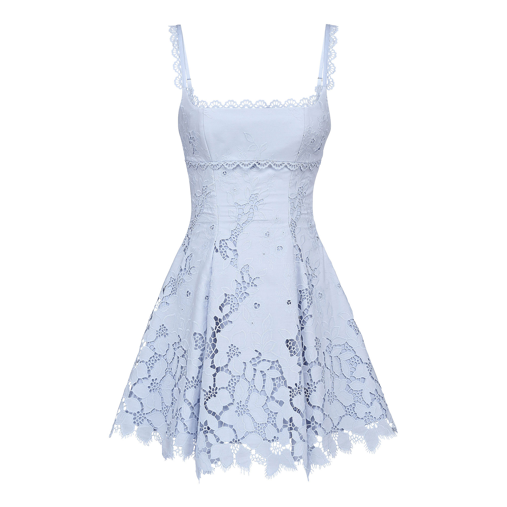 • Cut-out broderie anglais, mini length, square cut neck, fitted bodice, slightly flared hemline, mini length, adjustable straps, zip fastening