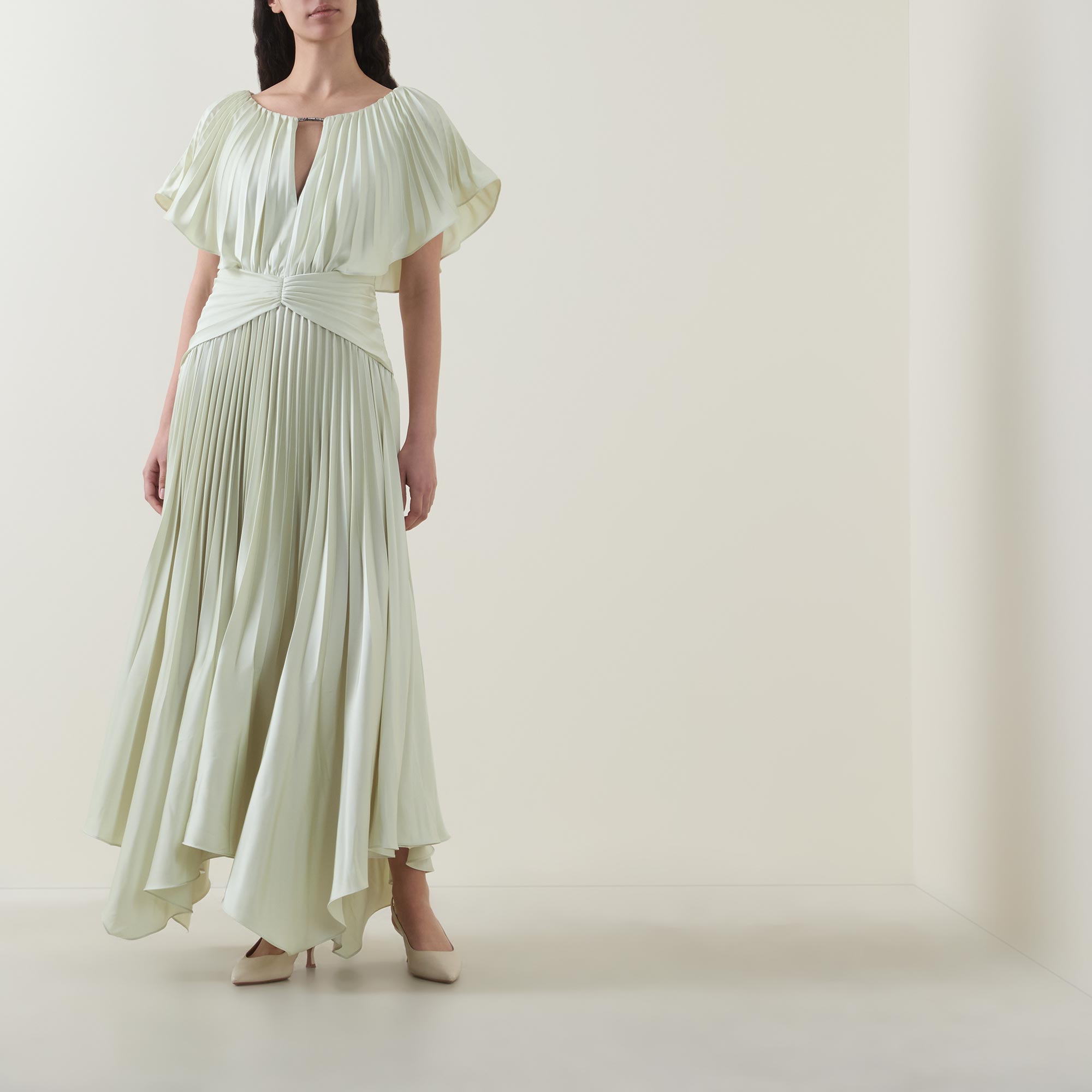 - Round neckline, cut-out detail, pleated cape overlay, layered waistband with gathered design, full pleated skirt, asymmetric hem, satin finish, midi length