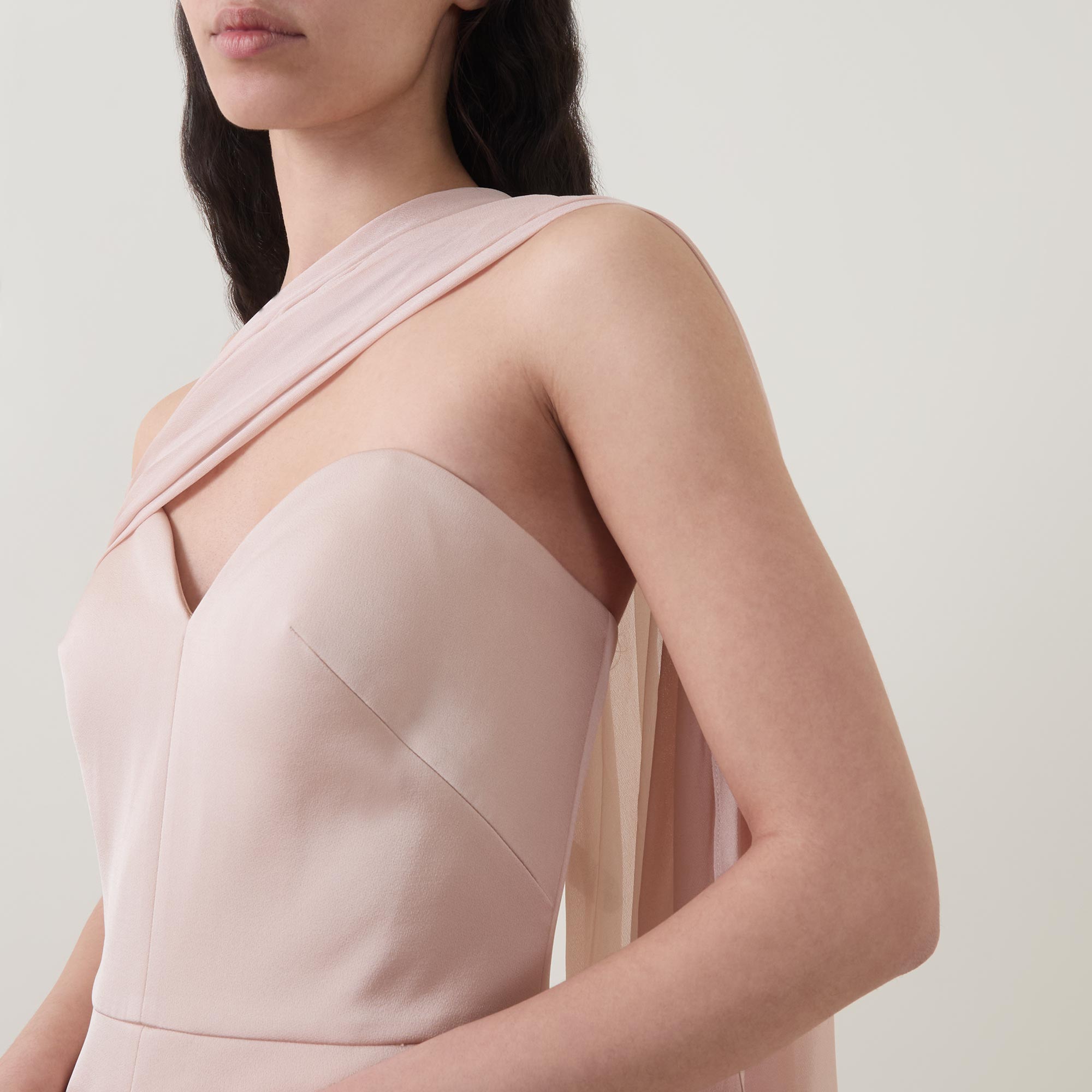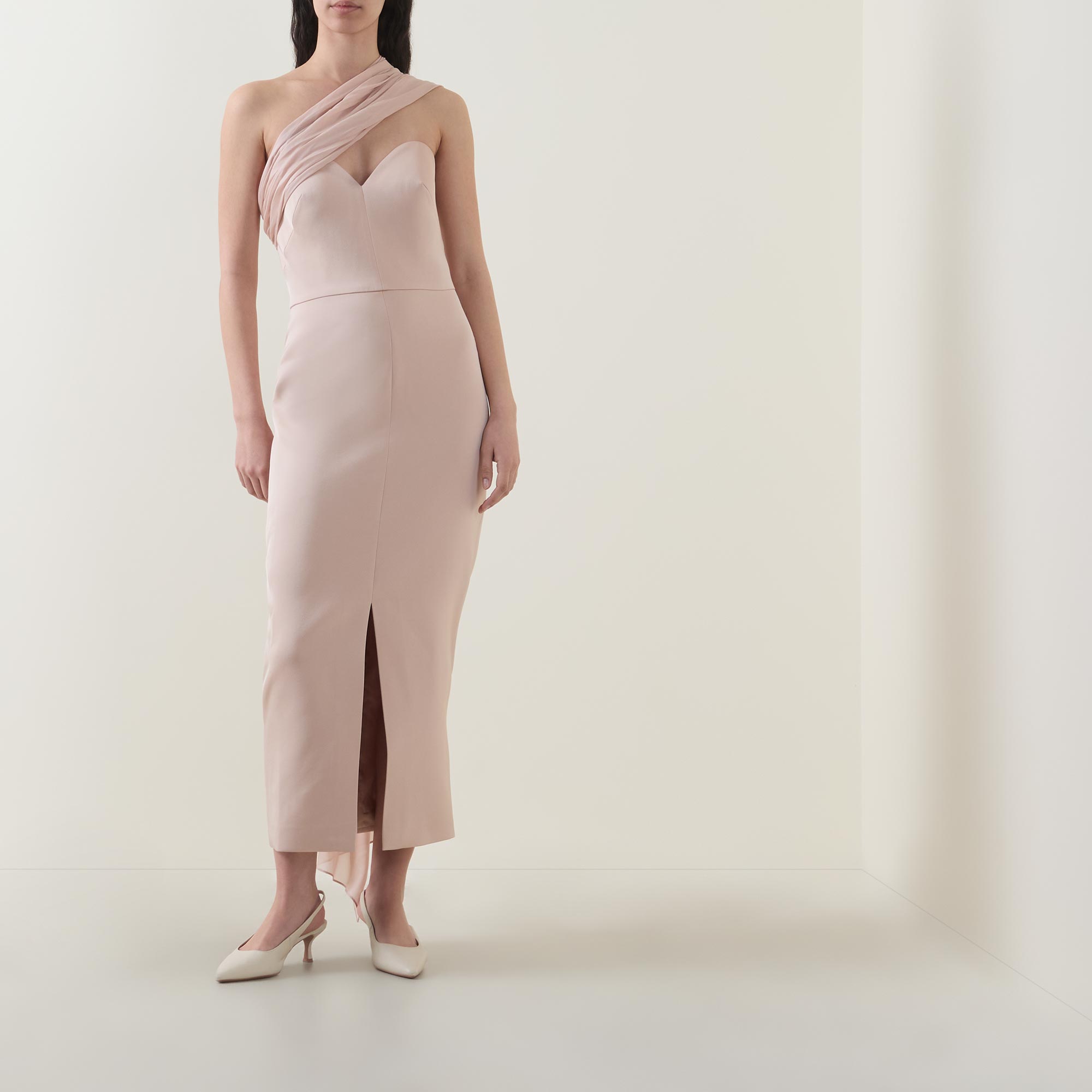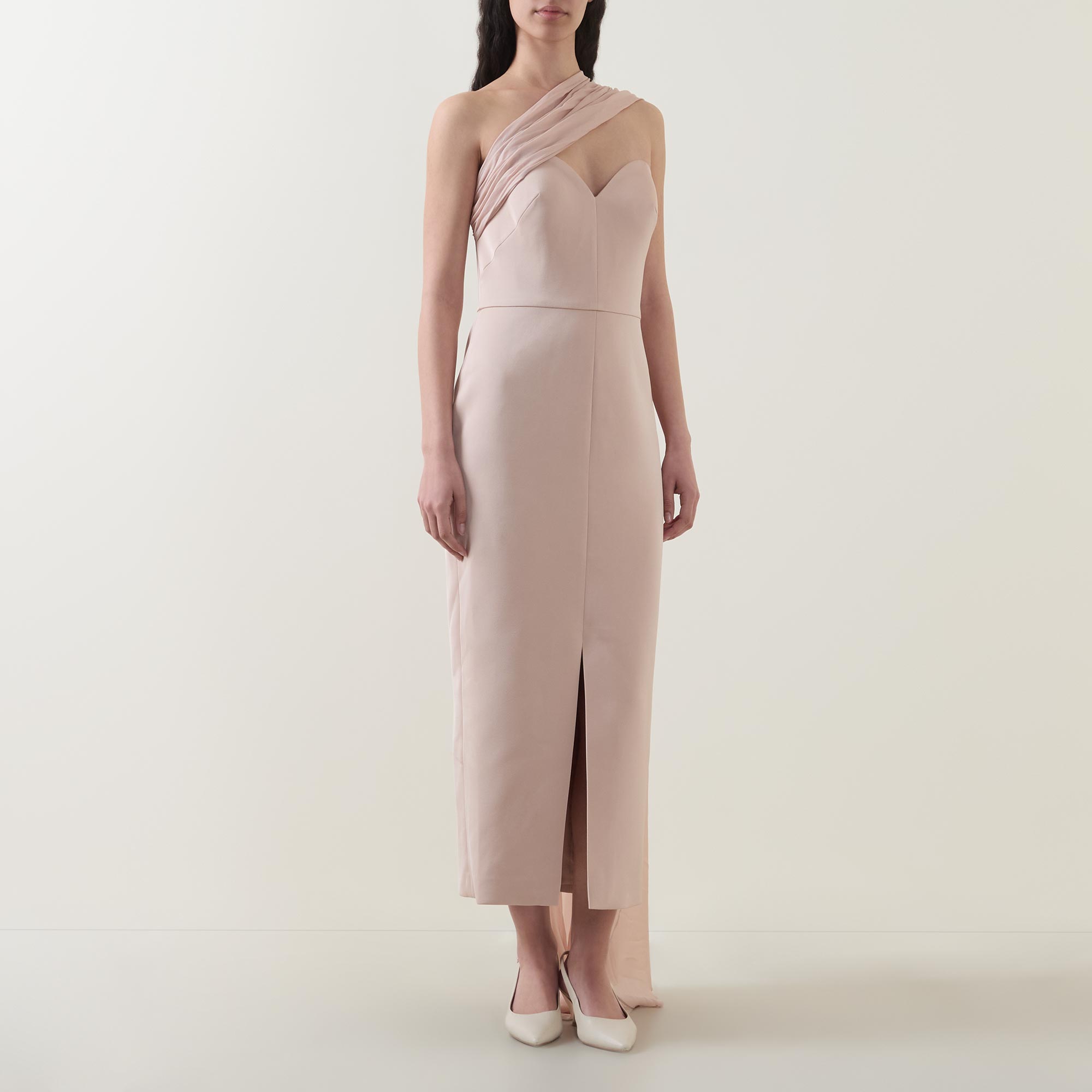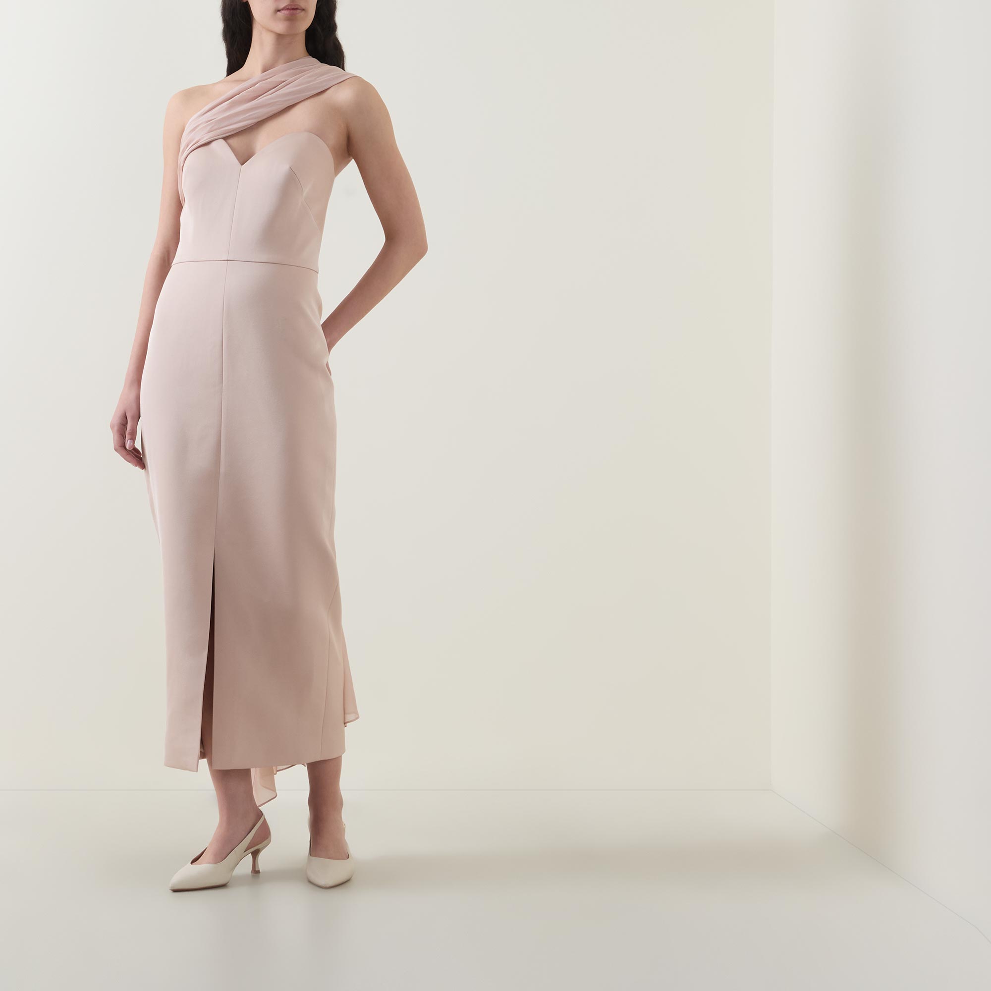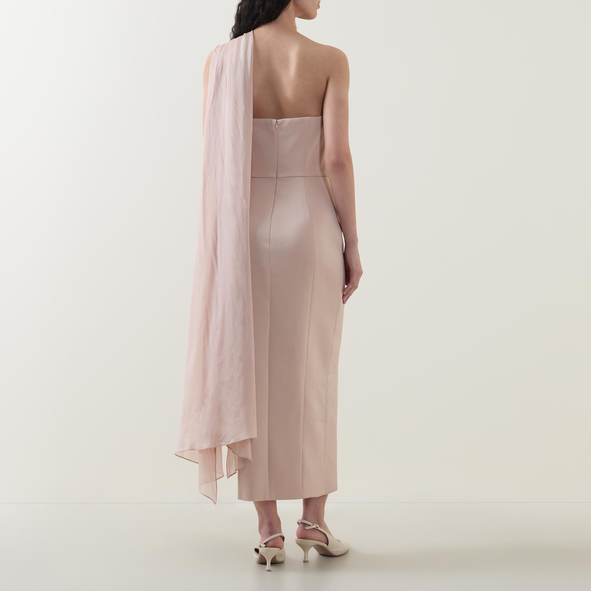 - Off-the-shoulder design, strapless, pleated scarf detail, fitted through the waist and hips, rear zip fastening, straight hem, front split, midi length