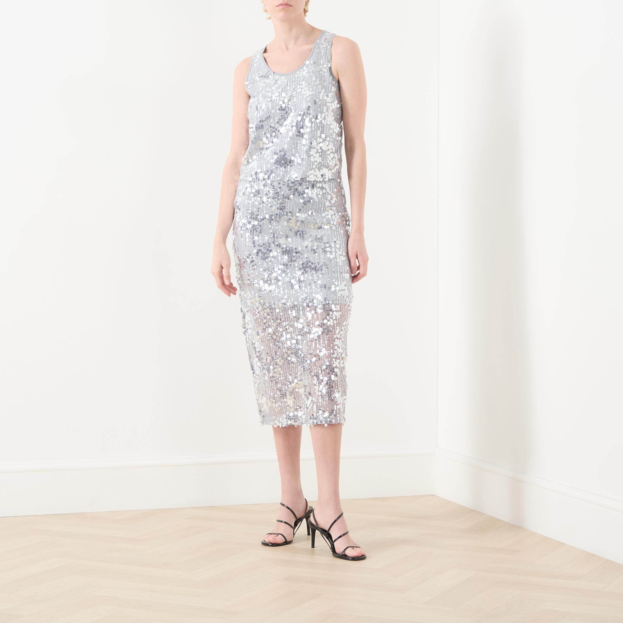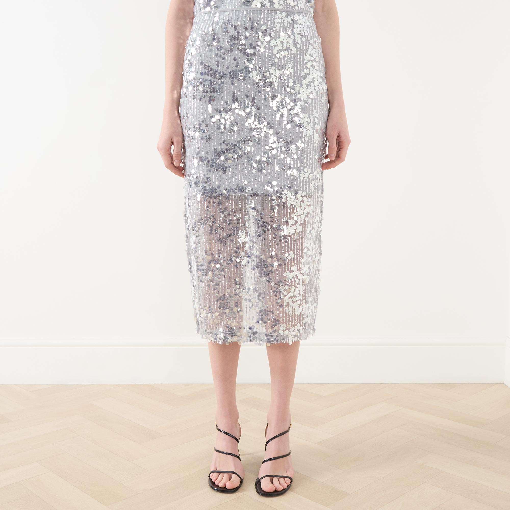 - High-rise, concealed closure, pencil silhouette, fully lined, all-over sequin embellishment, textured finish