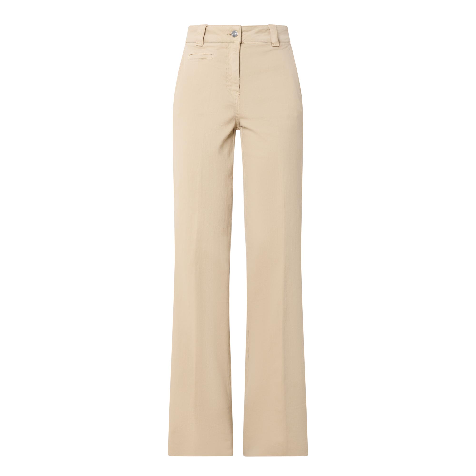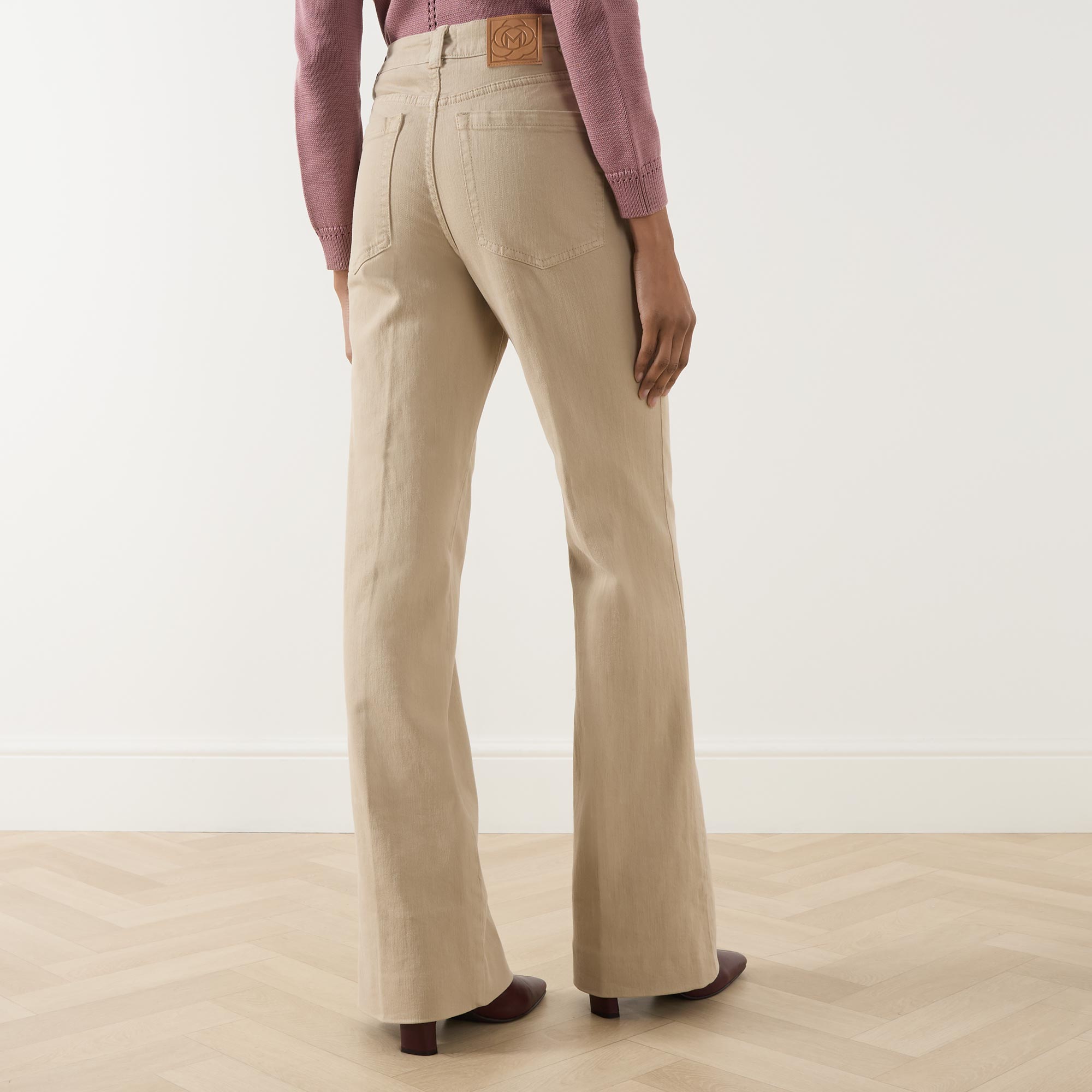 - Zip-fly and button fastening, belt loops, five-pocket design, tonal stitching, rear logo patch, high-rise, boot-cut leg, pressed creases, smooth fabric