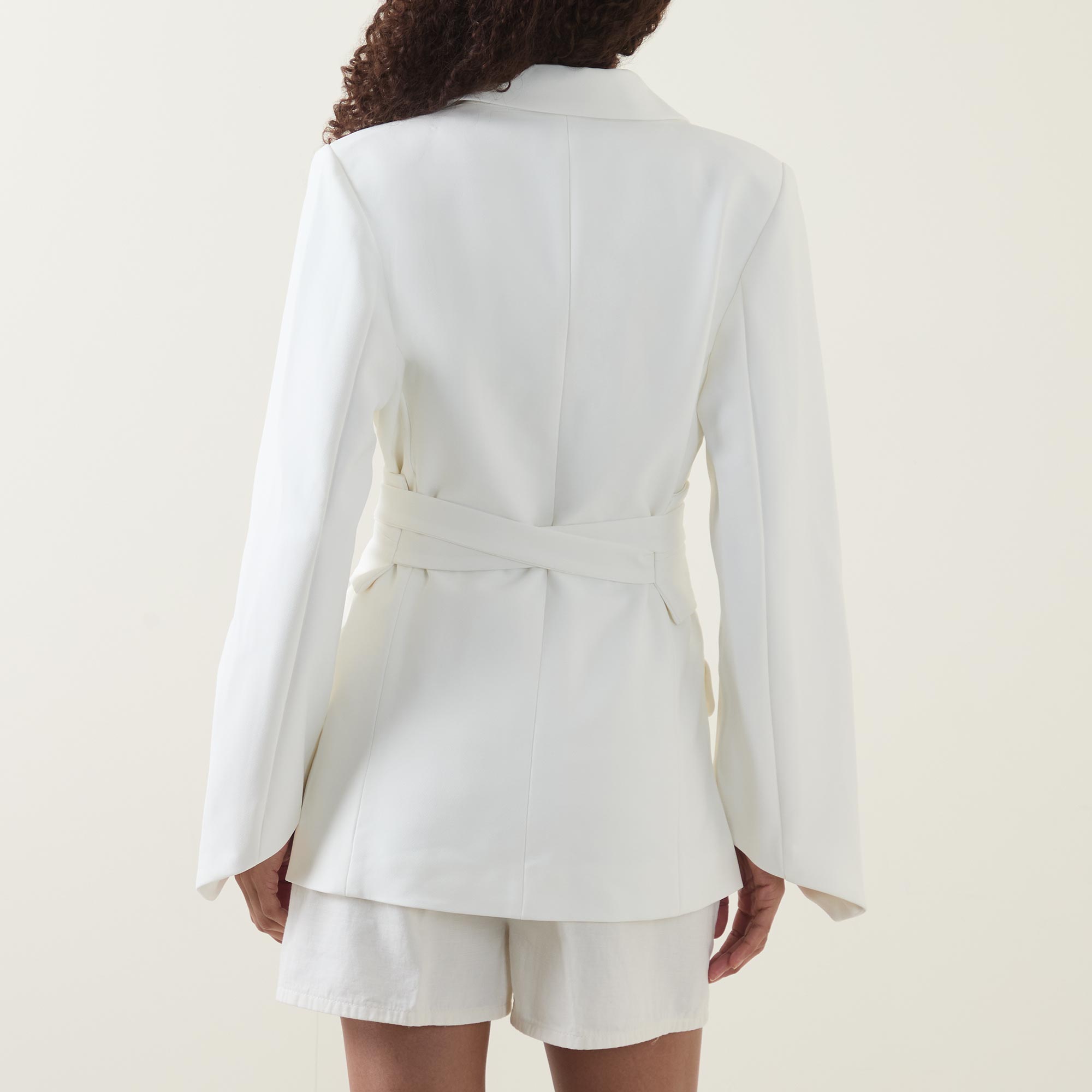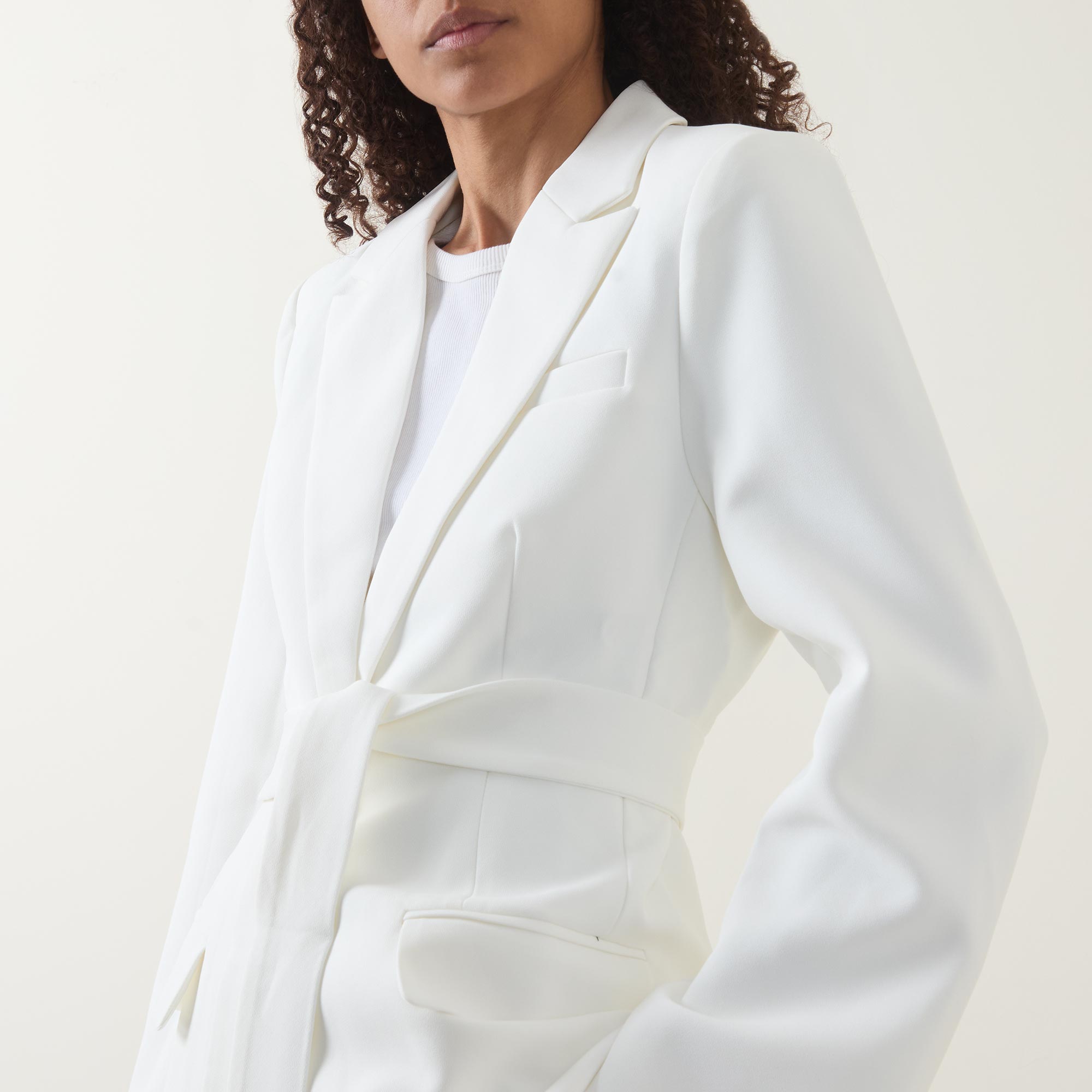 - Peak lapel collar, structured shoulders, long signature pointed sleeves, front button fastening, cinched waist with two additional belts, one chest welt pocket, two front flap pockets, straight hem, dart detailing throughout, lined