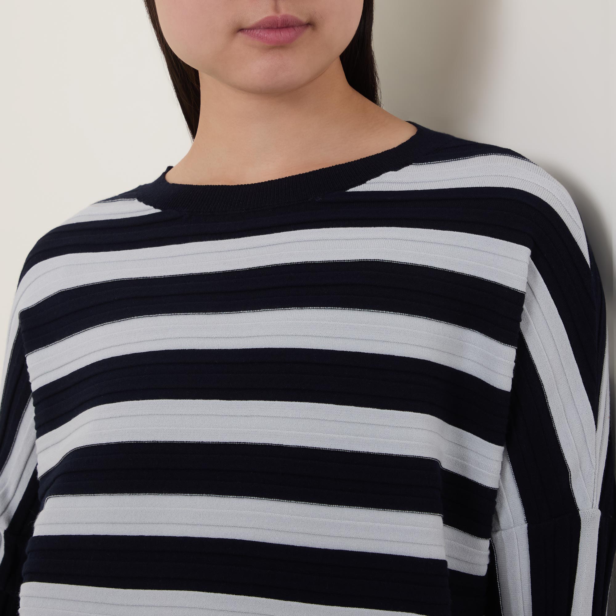 - Round neck, dropped shoulders, long sleeves, straight hem, striped pattern, rib knit design
