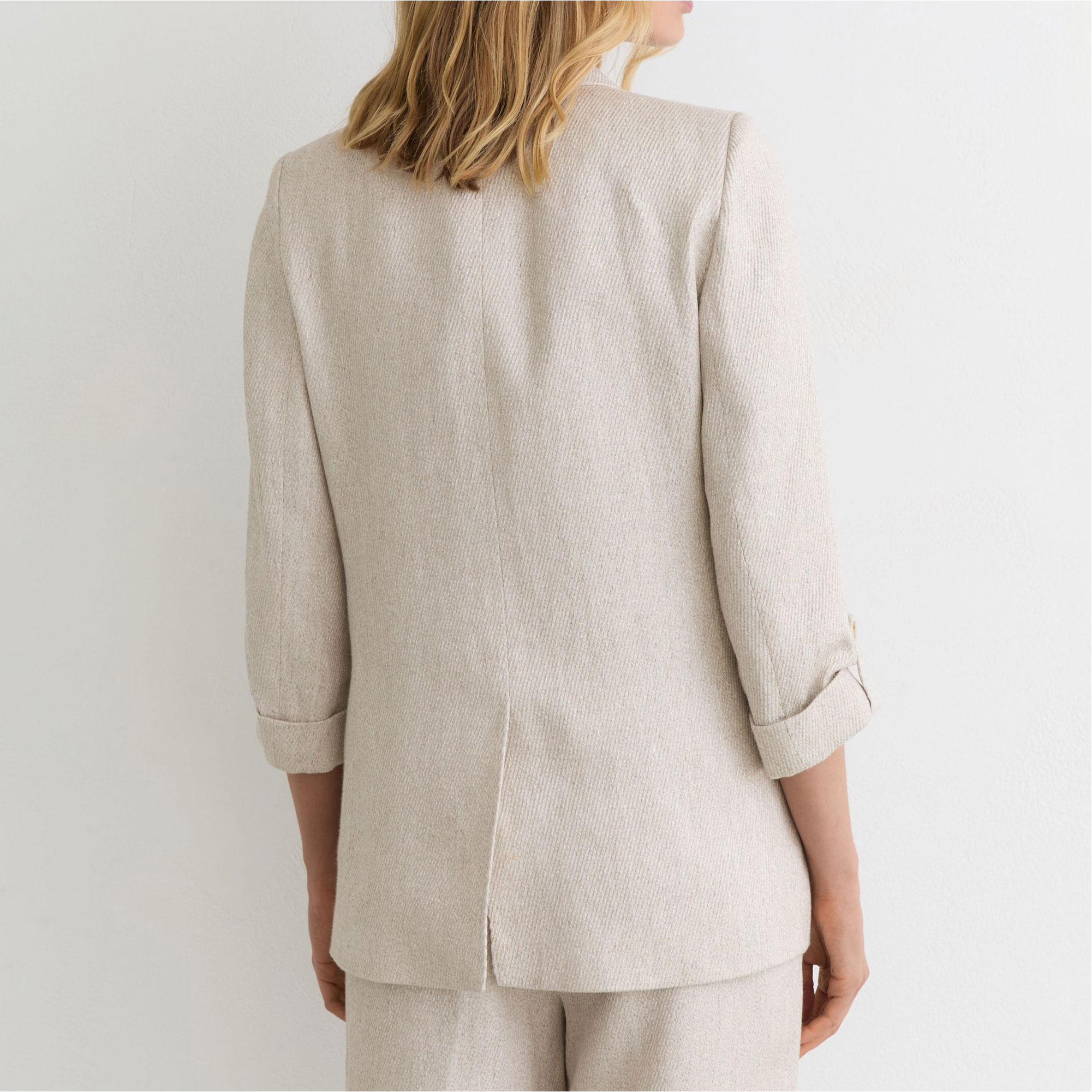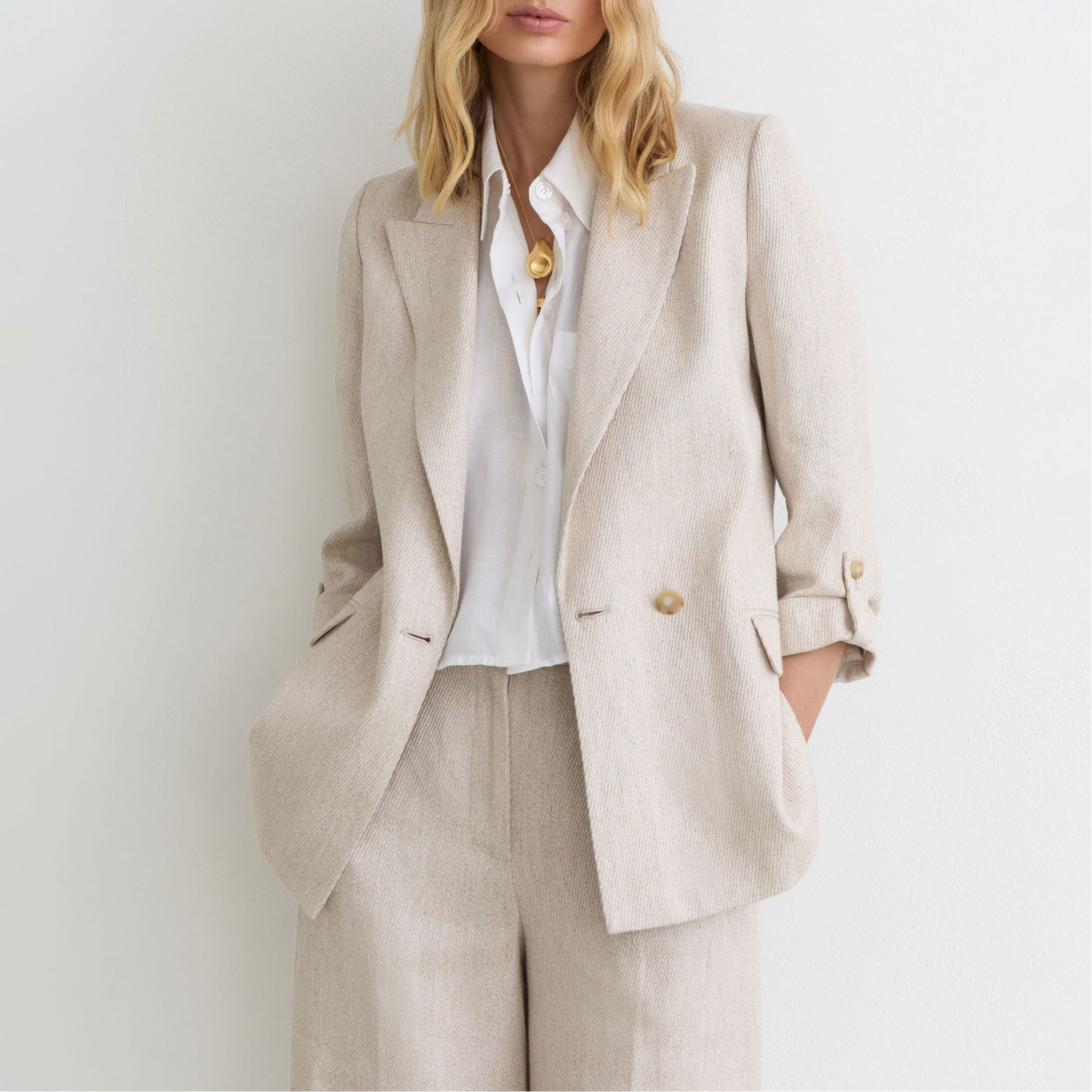- Double-breasted, subtle textured weave, peak lapels, three-quarter sleeves, buttoned turn-up cuffs, lightly padded shoulders , flap pockets , two-button closure