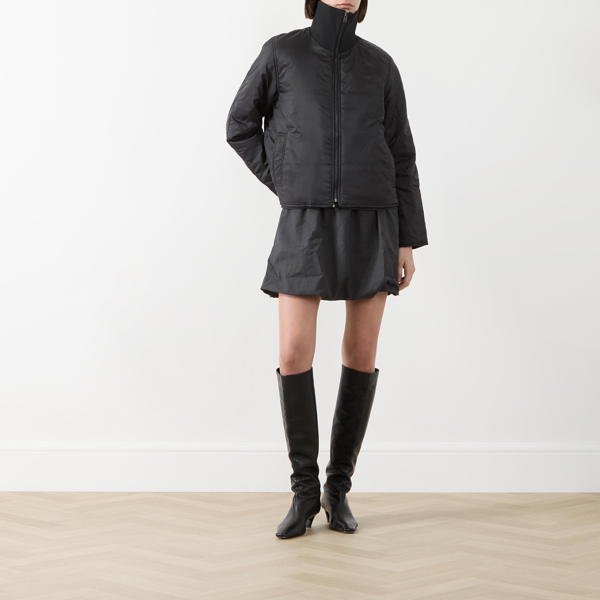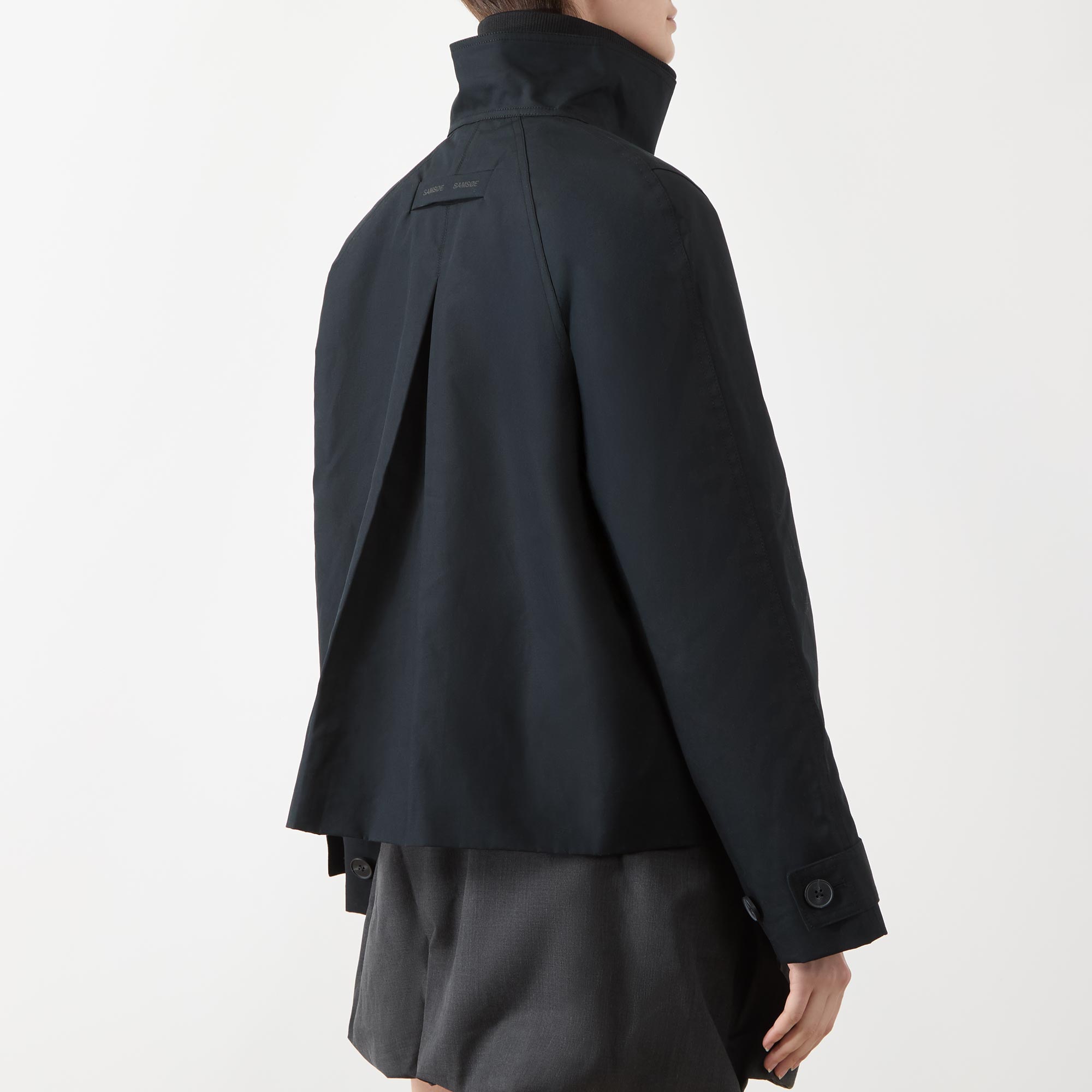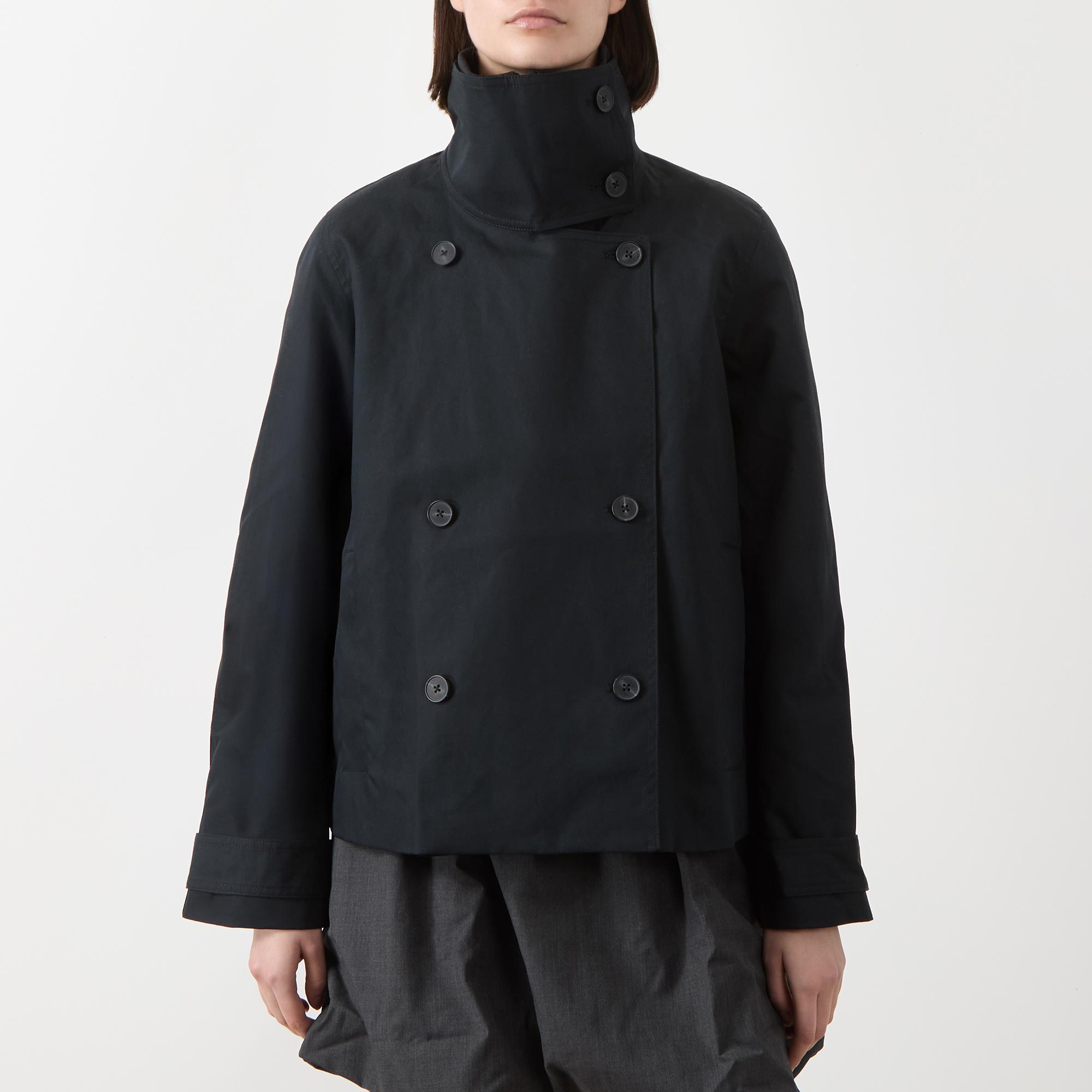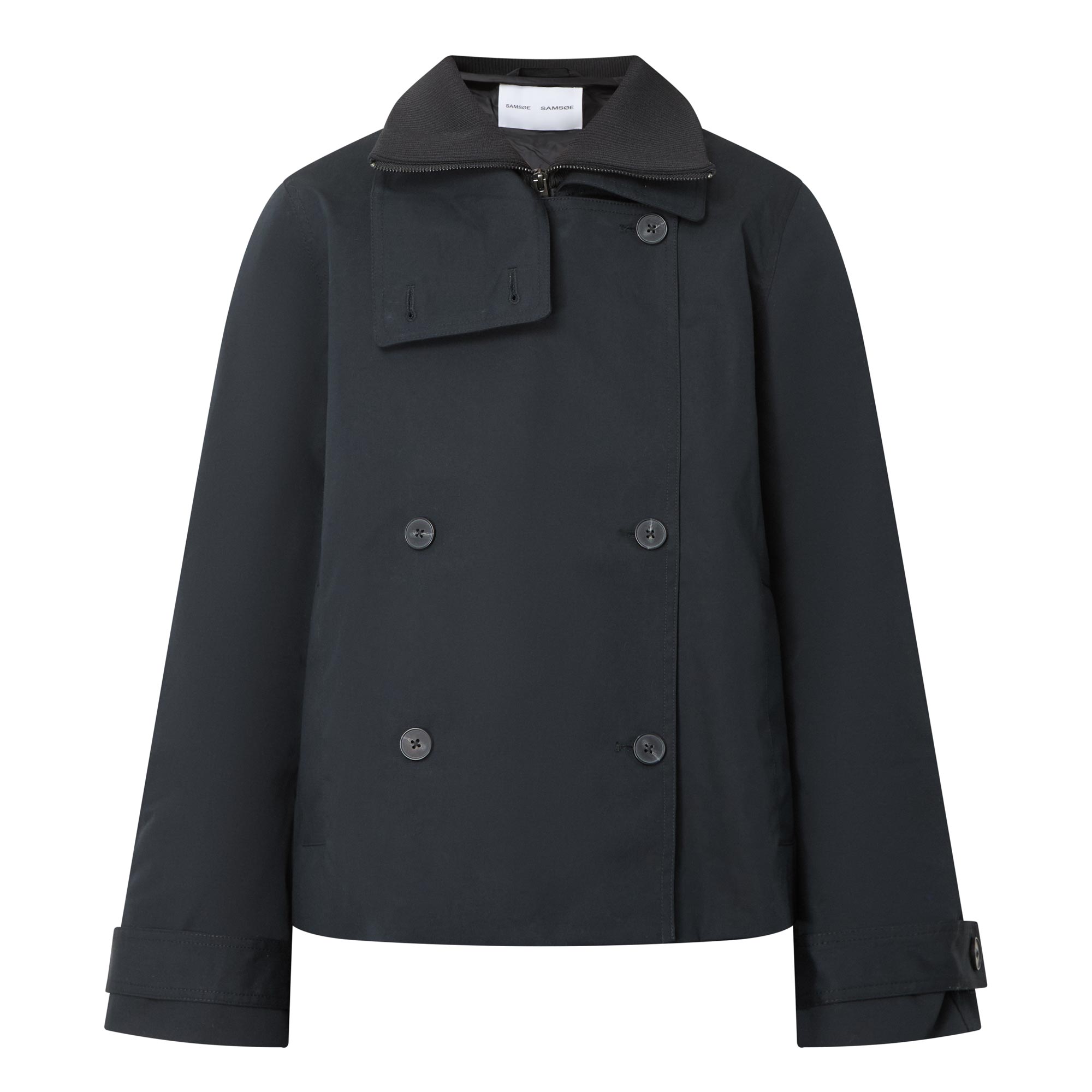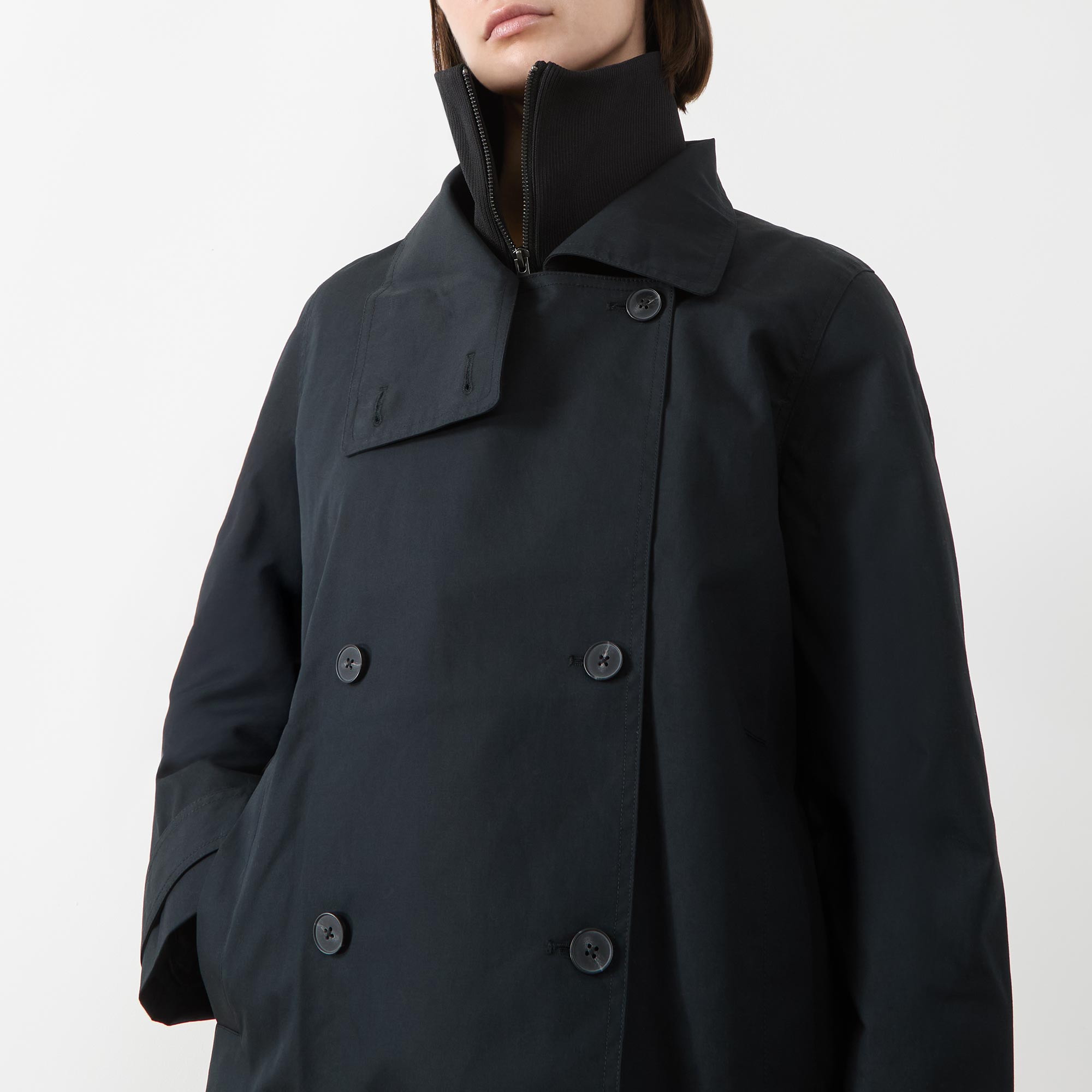 - Double-breasted front, long sleeves, high neckline, straight hemline, adjustable cuffs, zip fastening