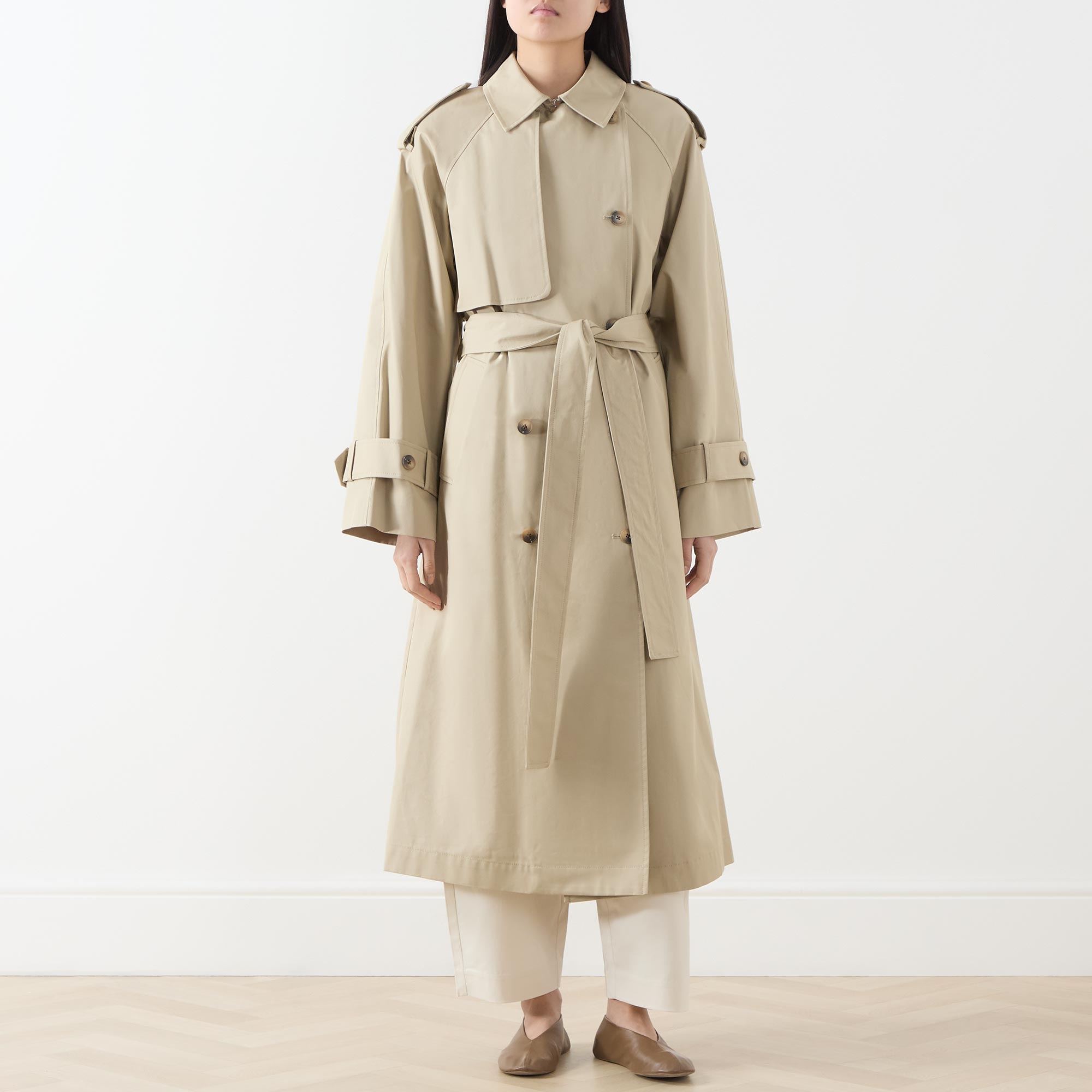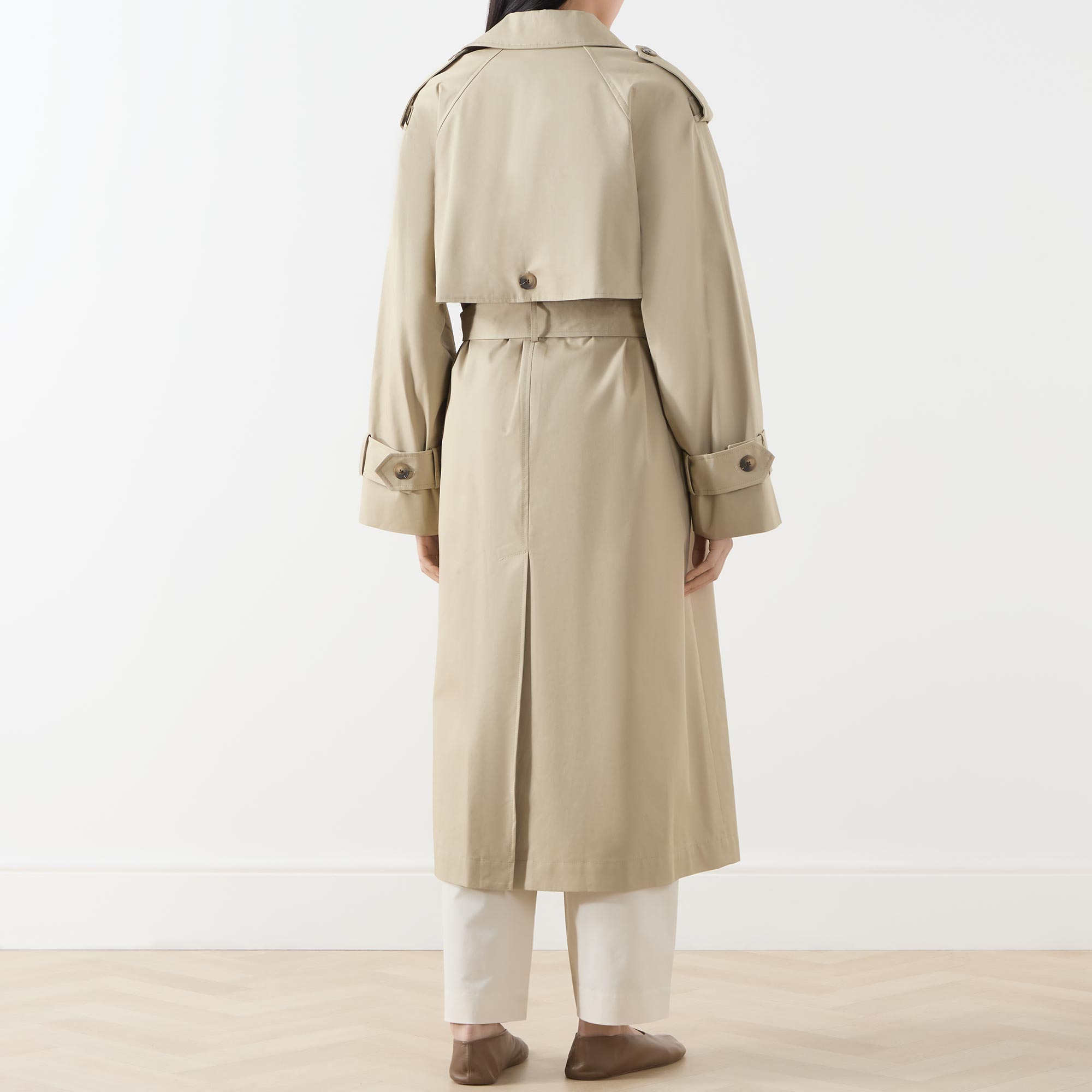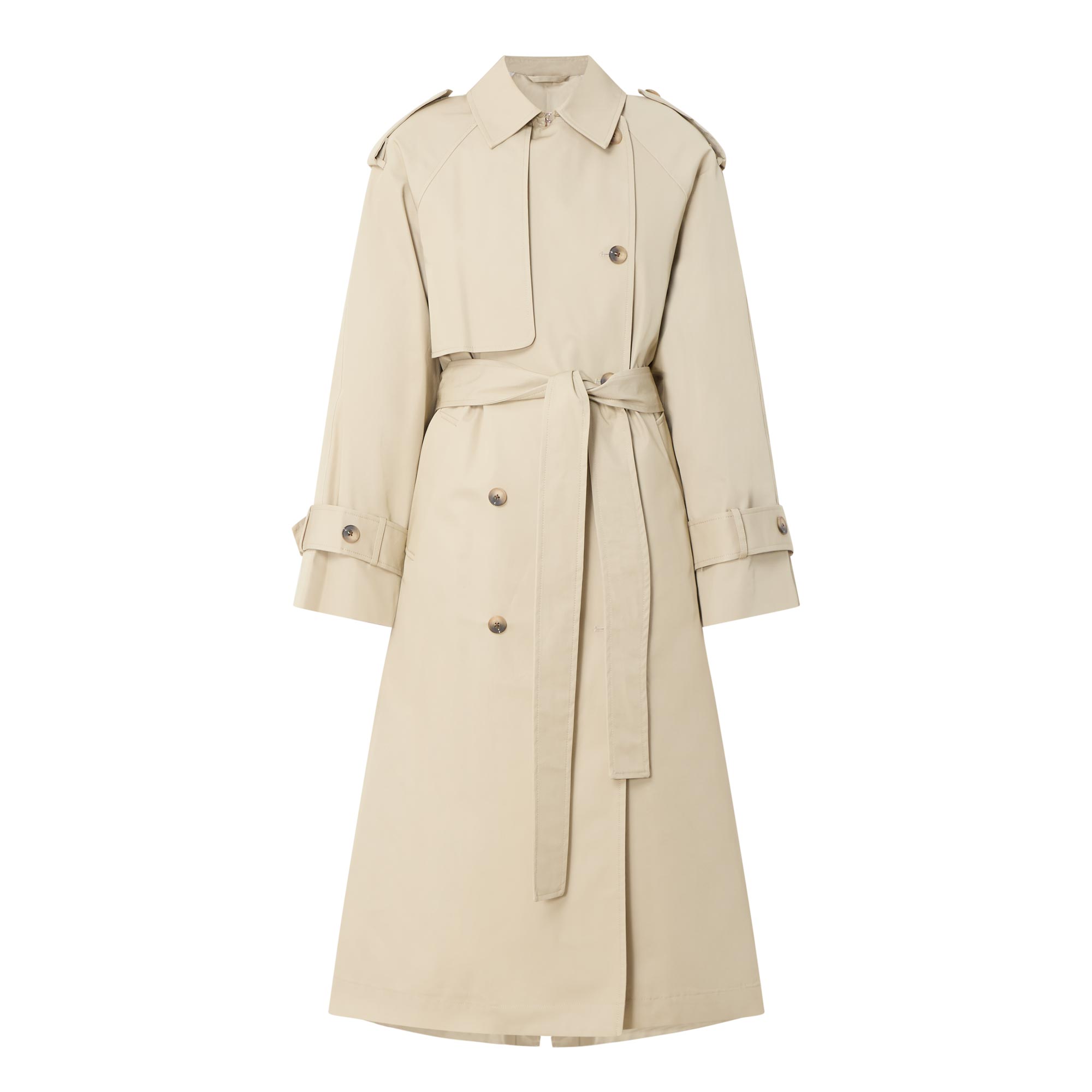 • Double breasted design, point collar, shoulder epaulettes, long sleeves, tabbed button cuffs, storm flap, matching self-tie waist belt, two angled welt pockets, straight hem, rear vent, longline design