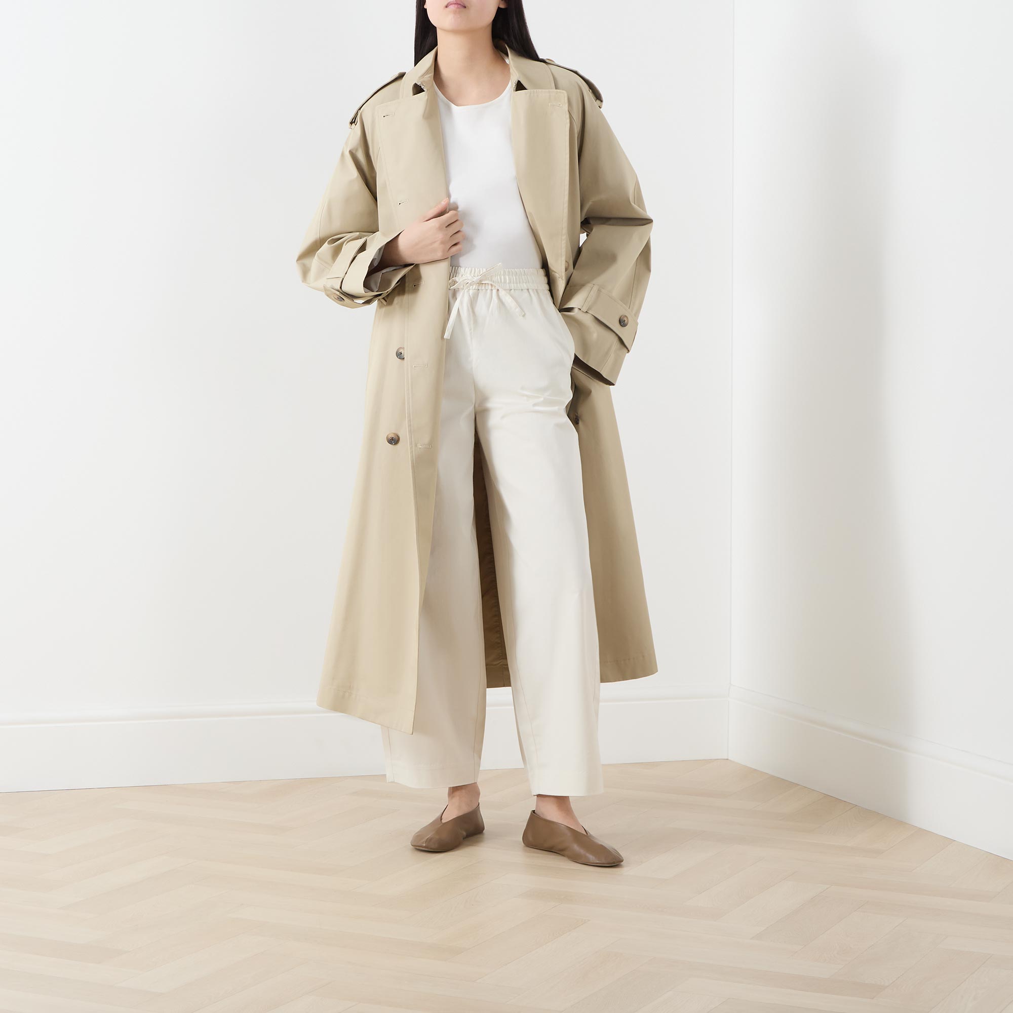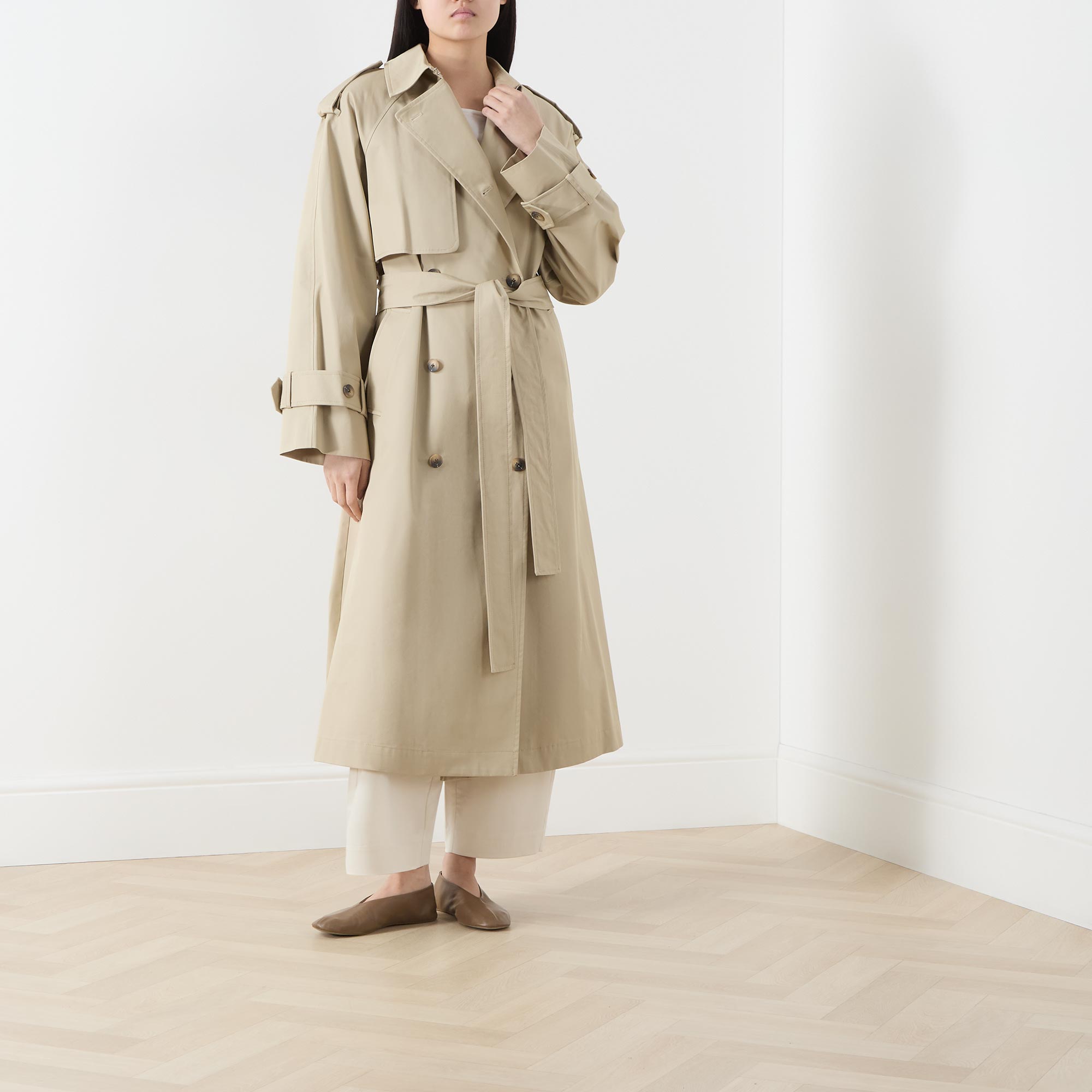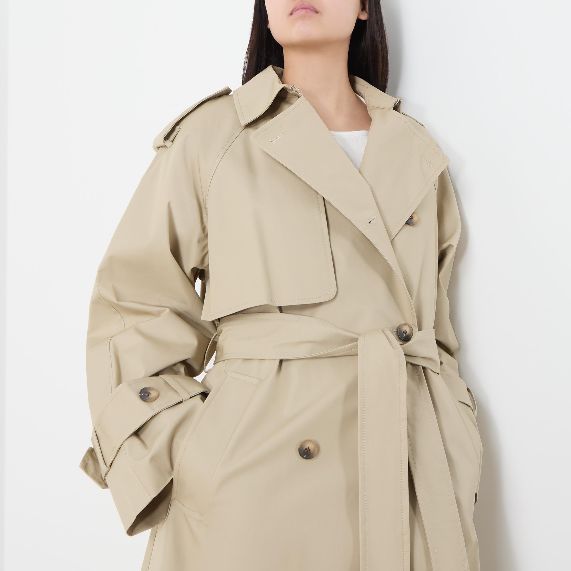 • Double breasted design, point collar, shoulder epaulettes, long sleeves, tabbed button cuffs, storm flap, matching self-tie waist belt, two angled welt pockets, straight hem, rear vent, longline design