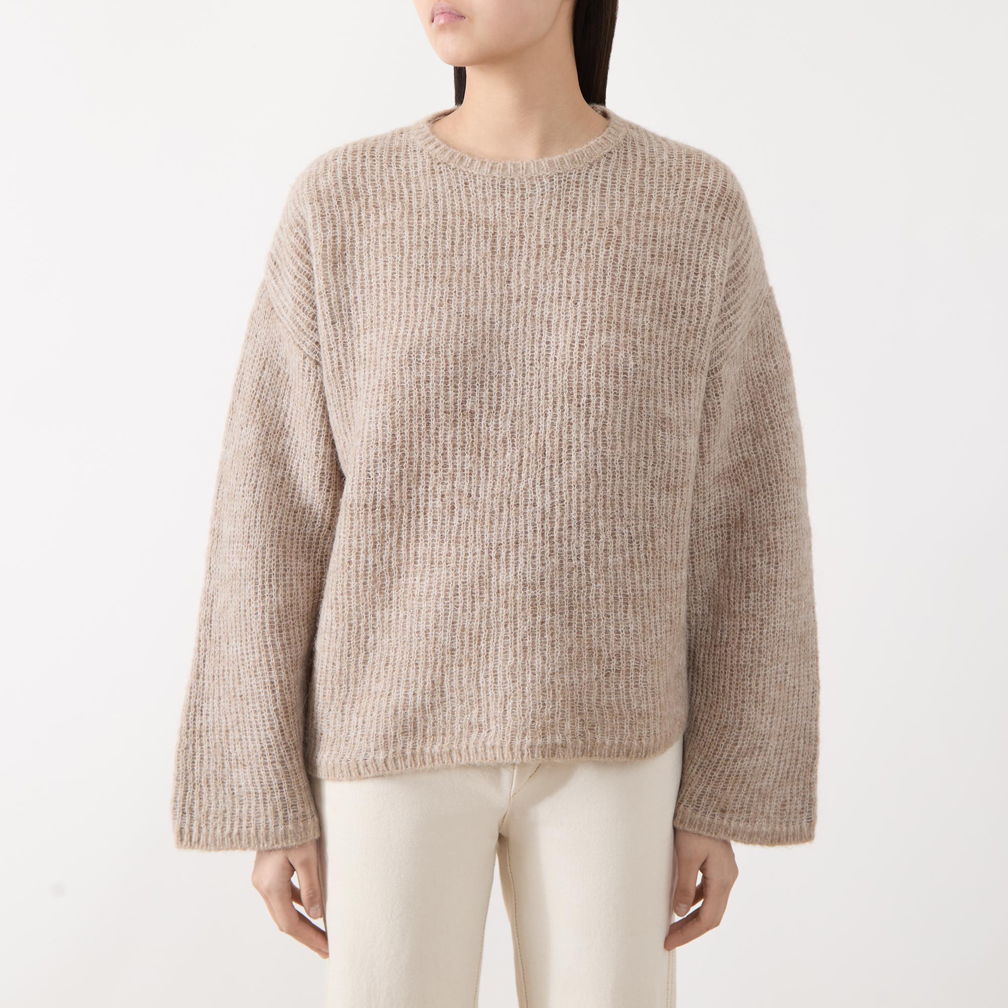 - Crew neckline, dropped shoulders, long wide sleeves, straight hem, roll-edge trims, knit construction, soft finish