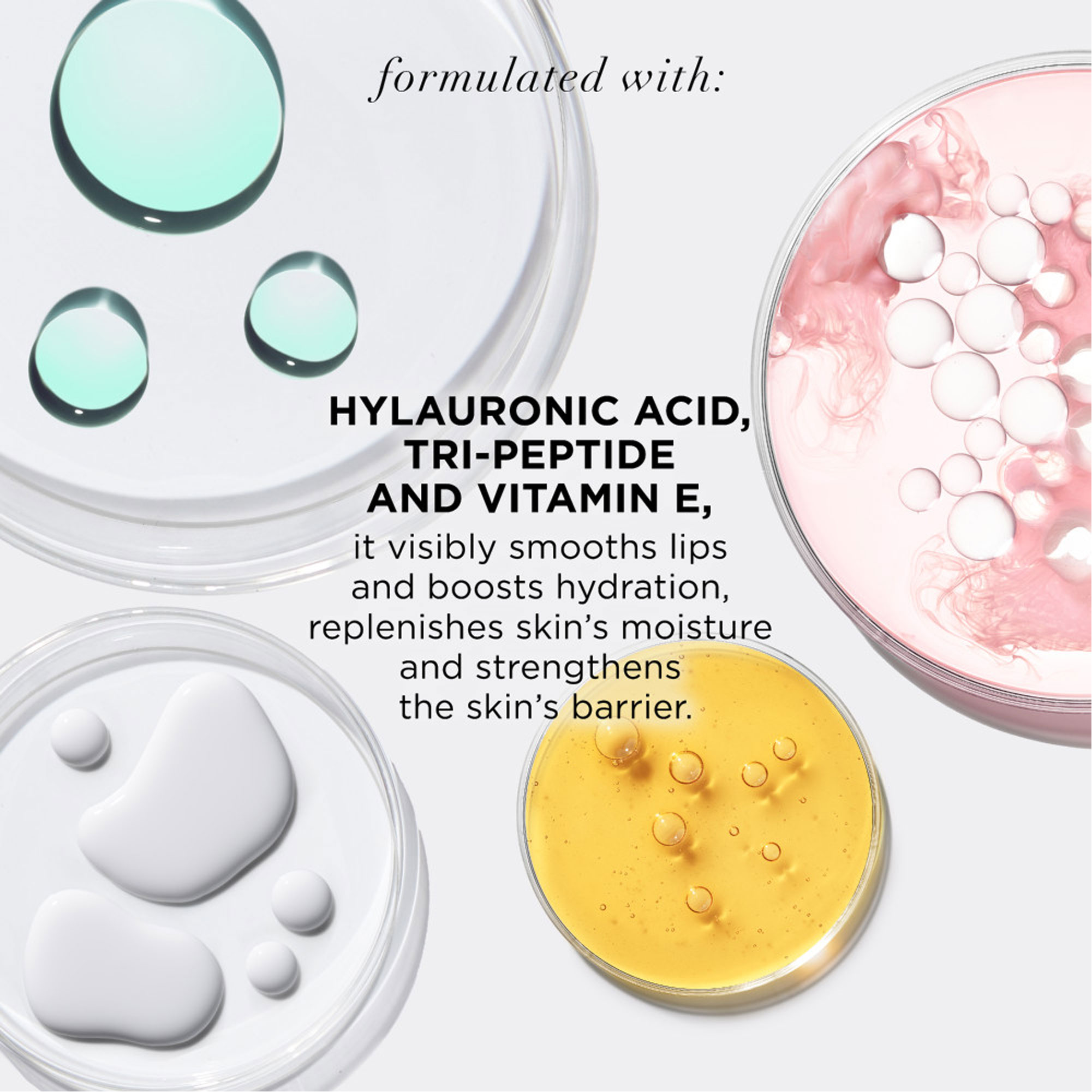- 90% hydration base formulated with hyaluronic acid, tri-peptide, vitamin E & ceramide