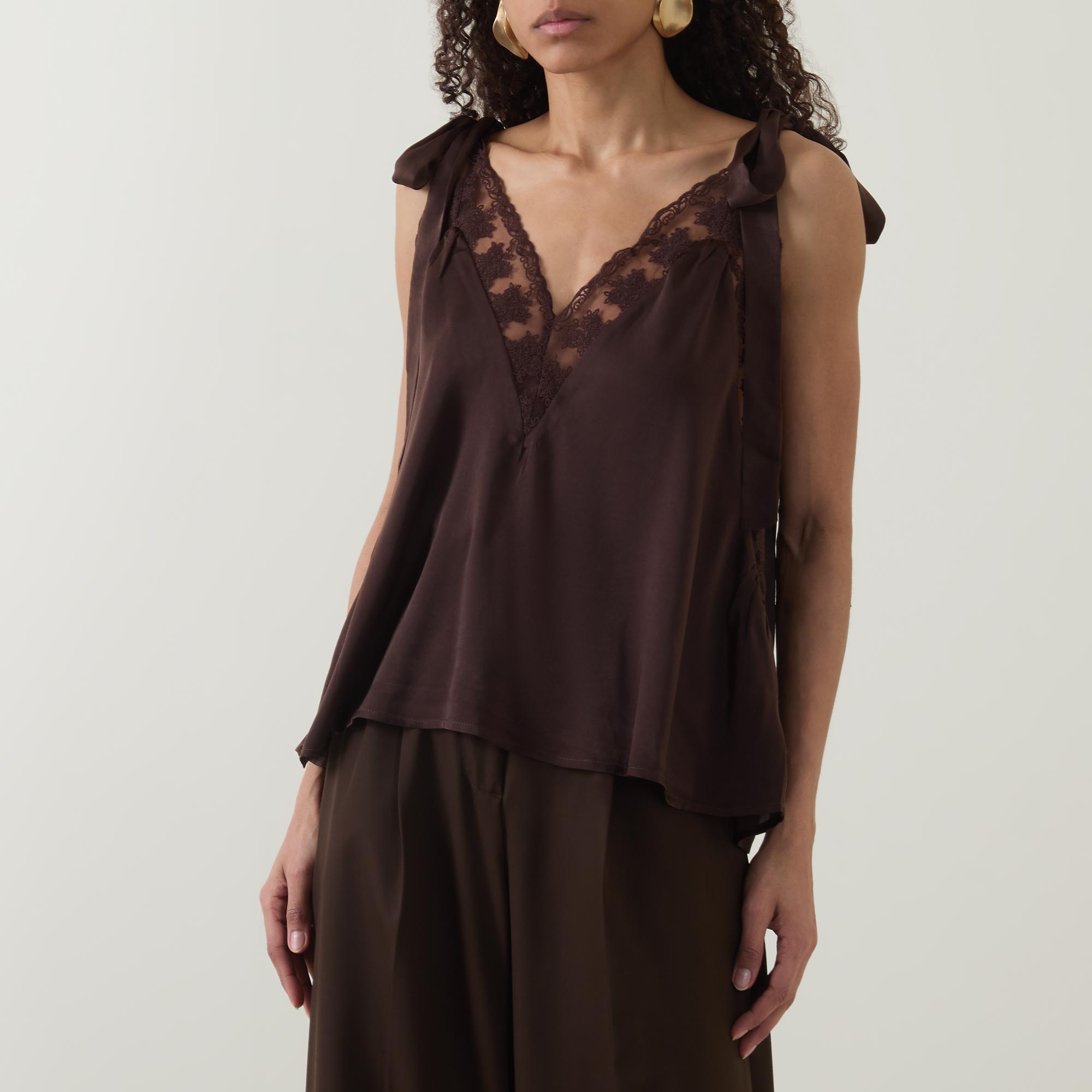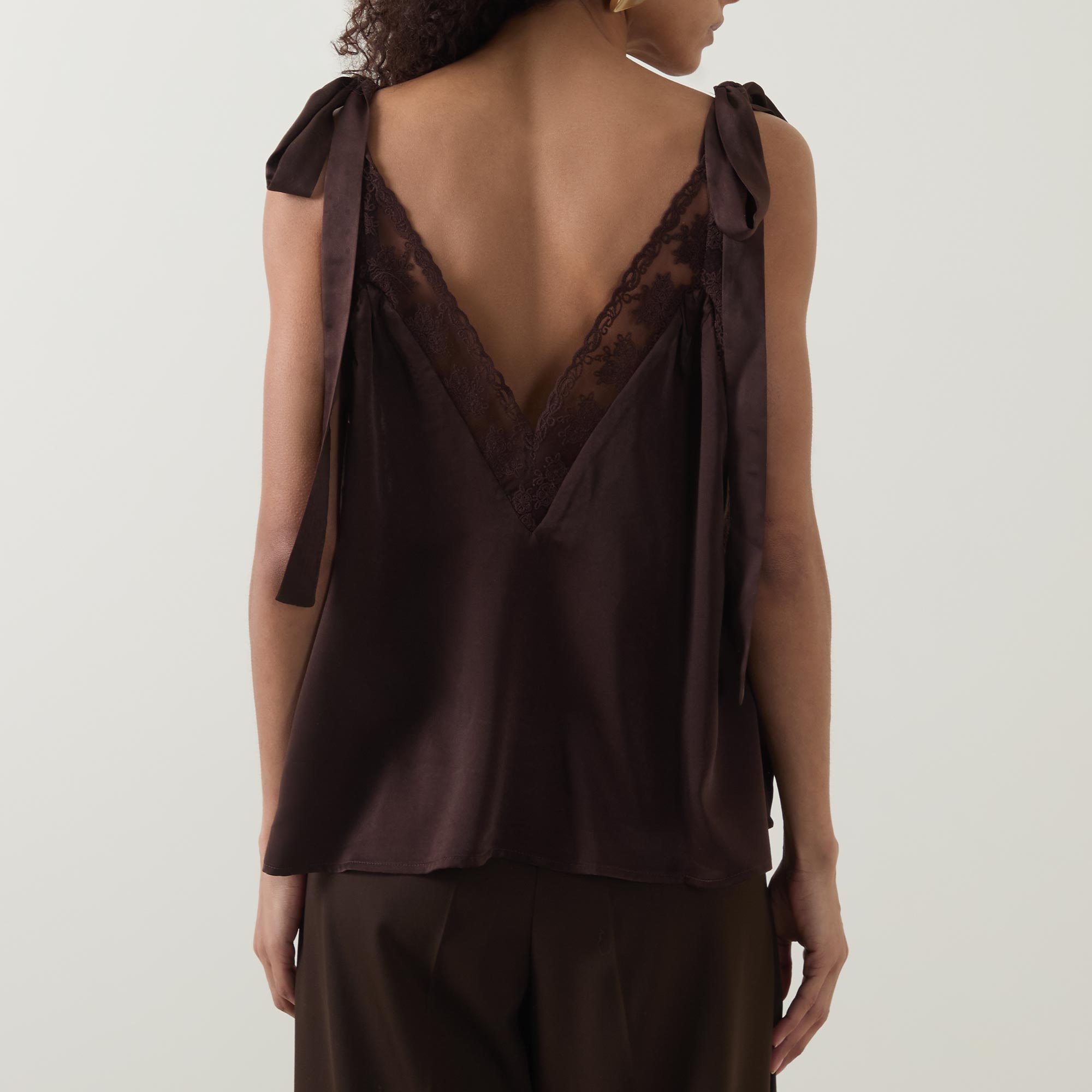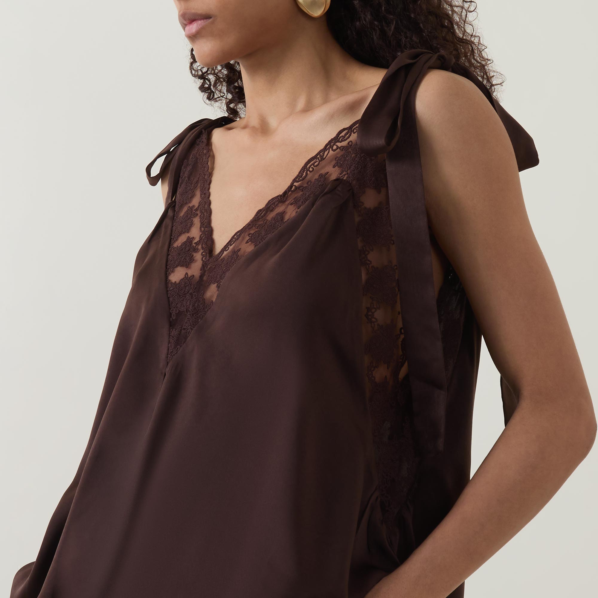 • V-neckline and back, lace embellished trim, self-tie adjustable straps, unlined