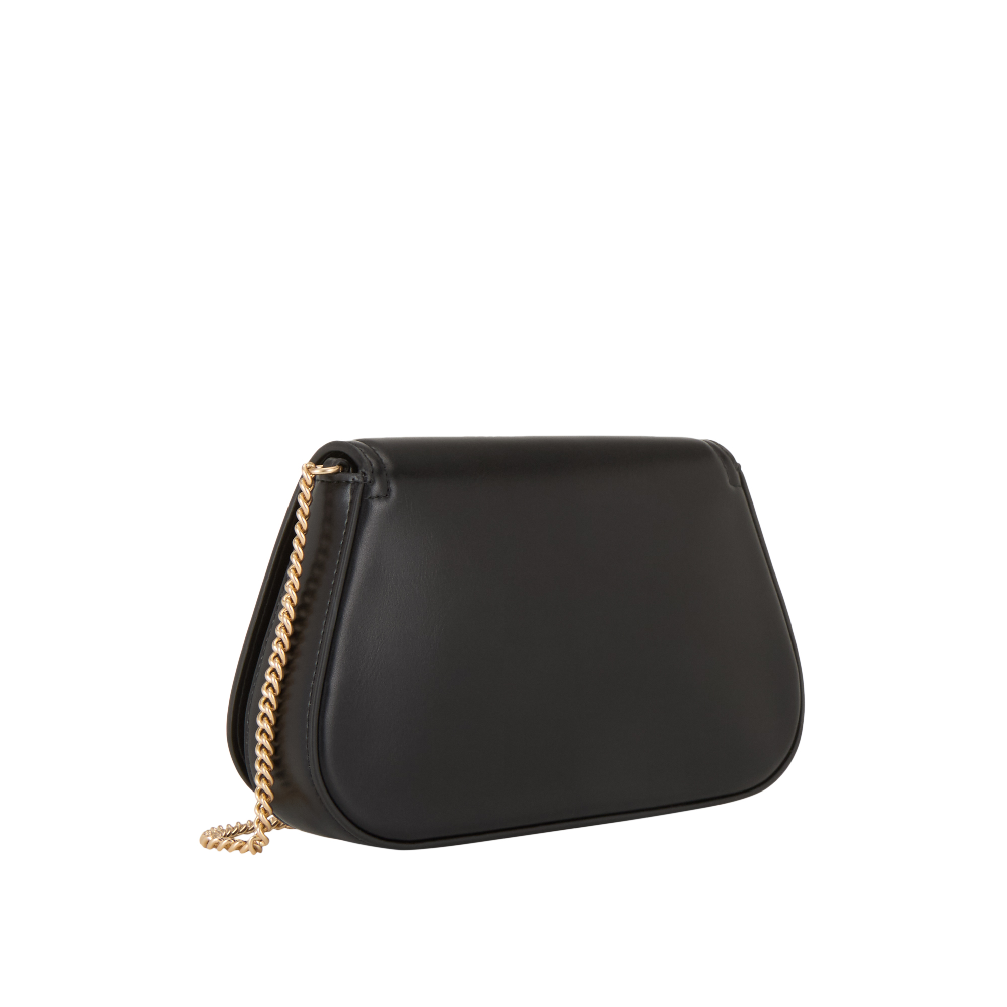 - Flap and magnetic button fastening, curved shape, detachable chain strap, gold-tone hardware, logo details