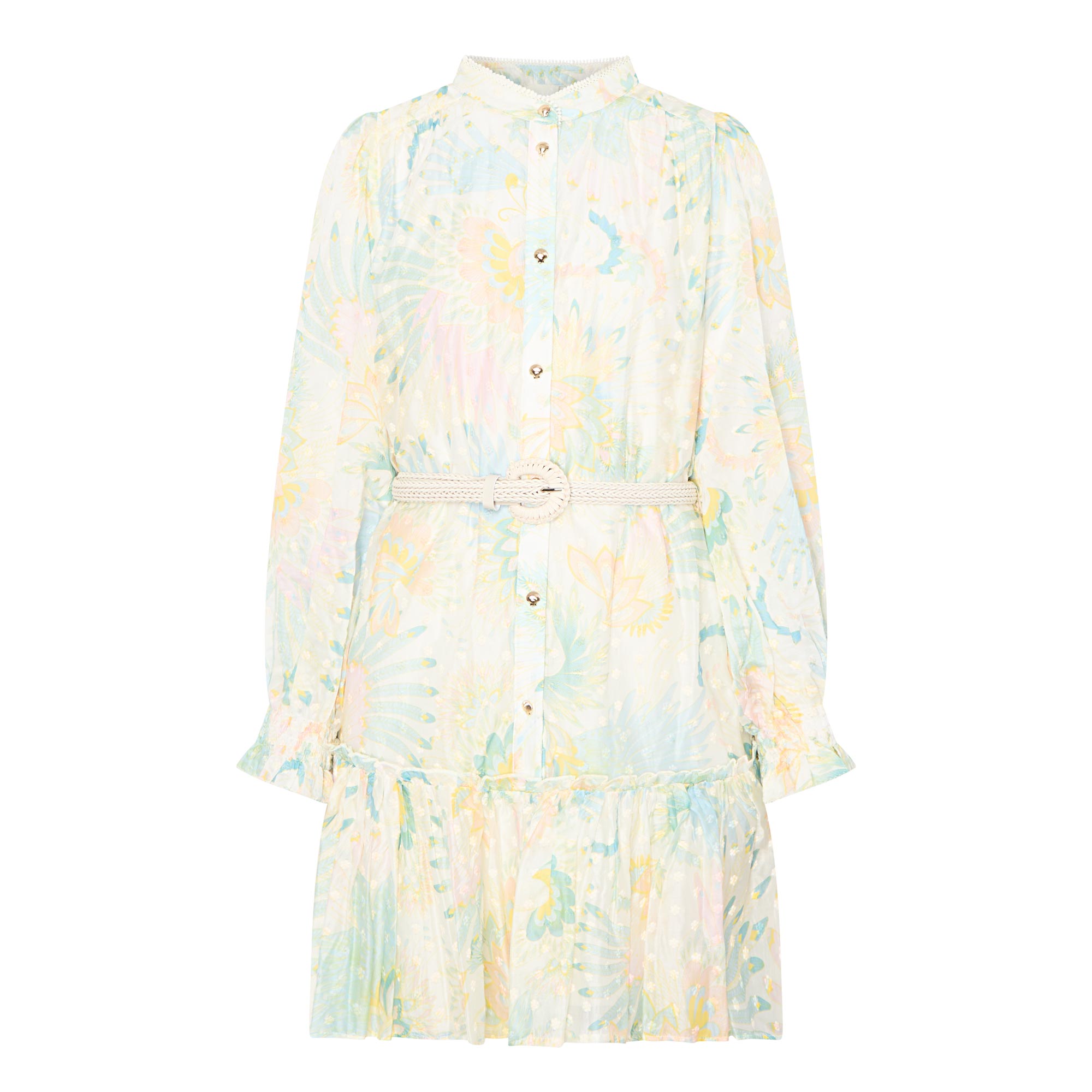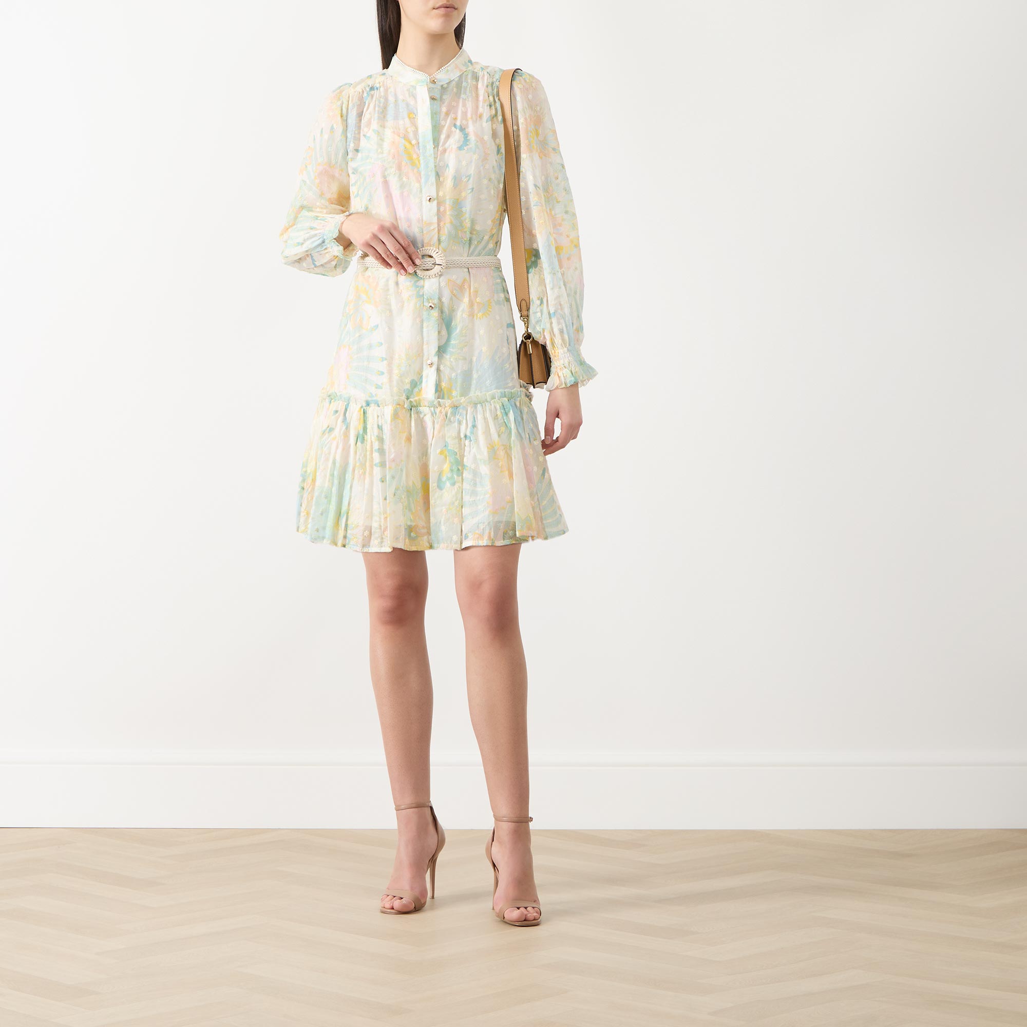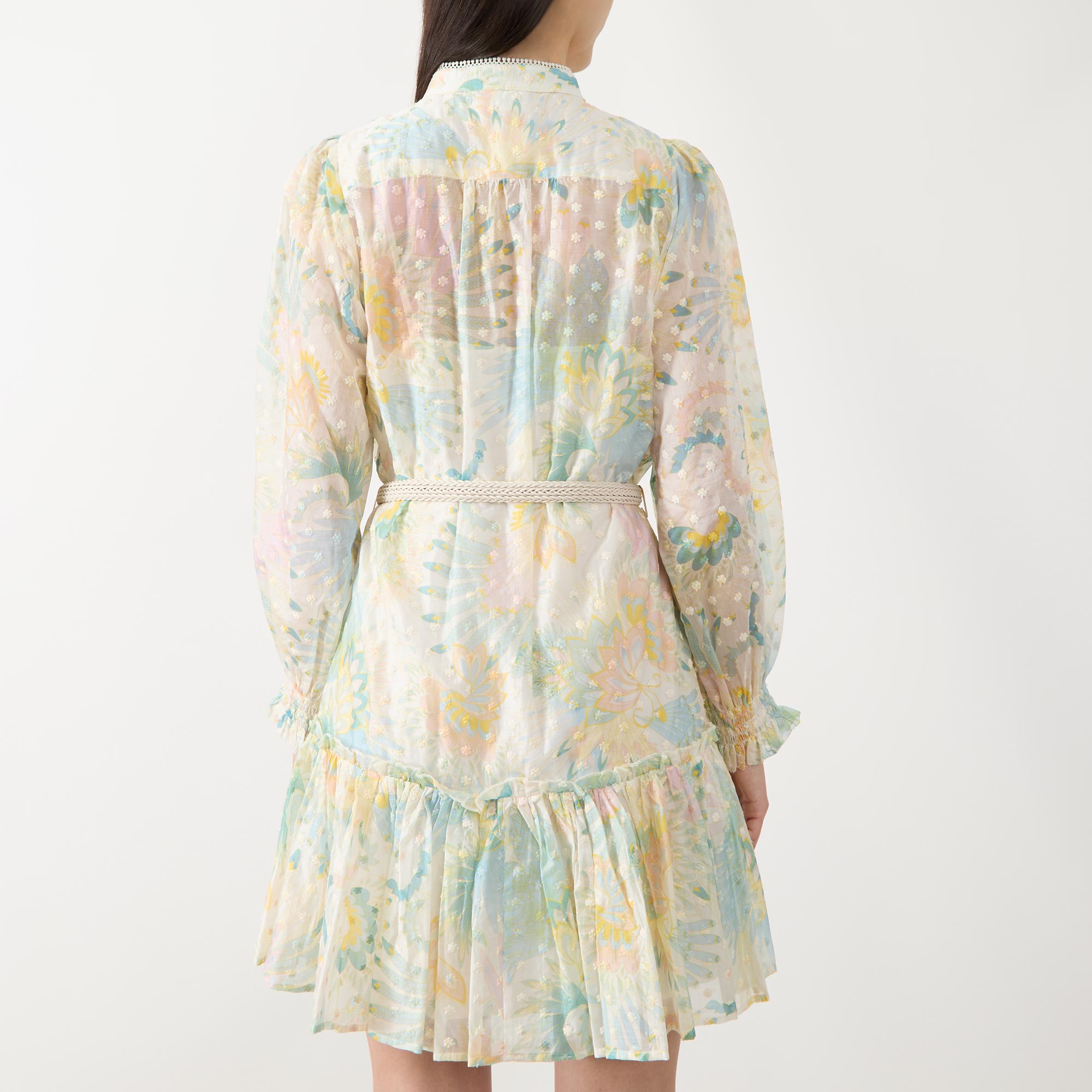 • Mini length, all-over floral print, long sleeves, elasticated cuffs, loose fit, gold-toned button fastenings, woven belt, pleated hem