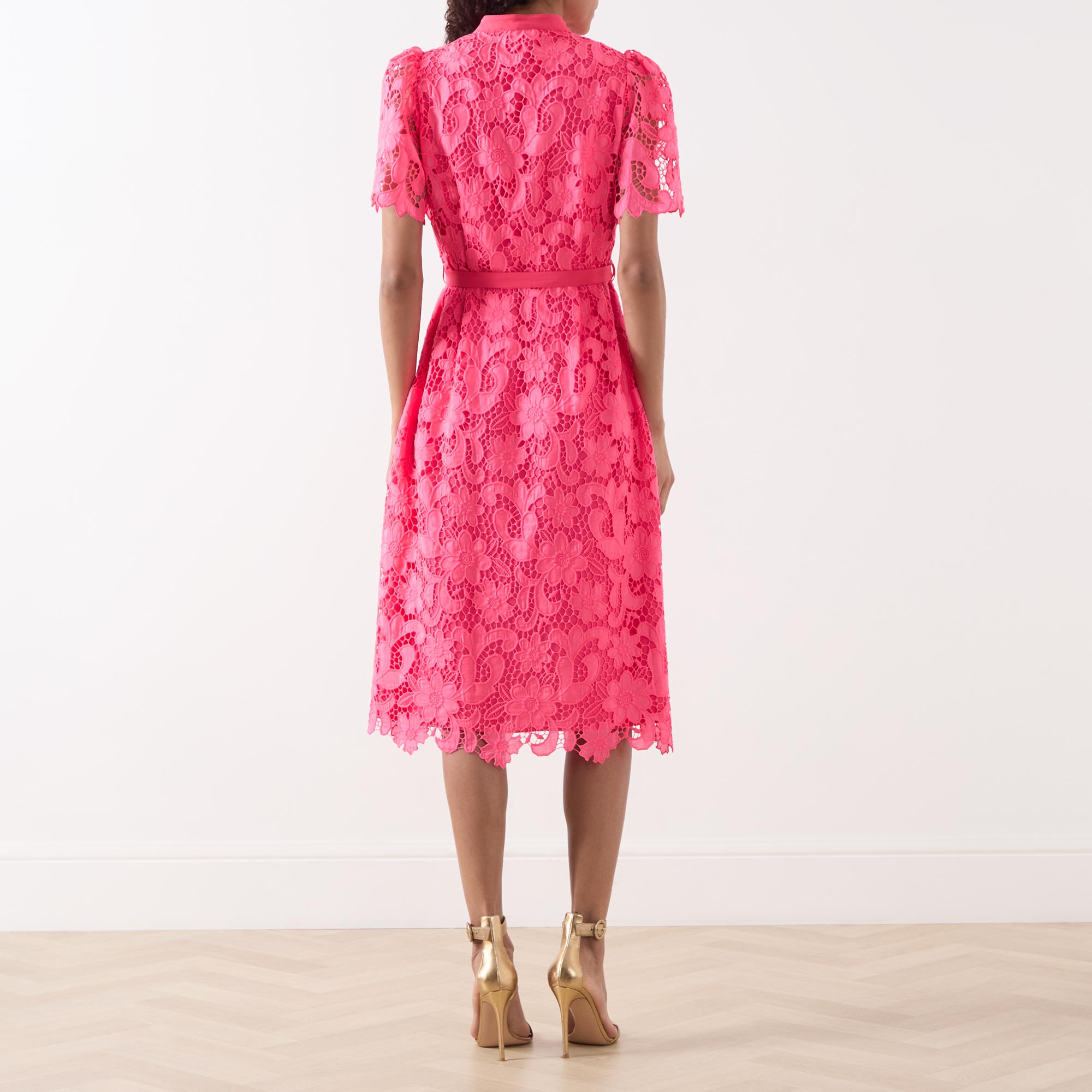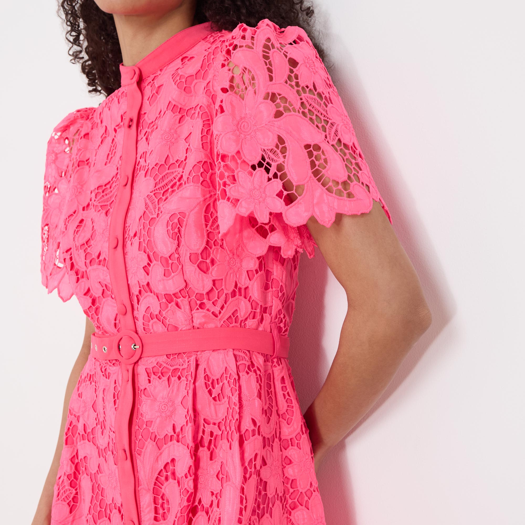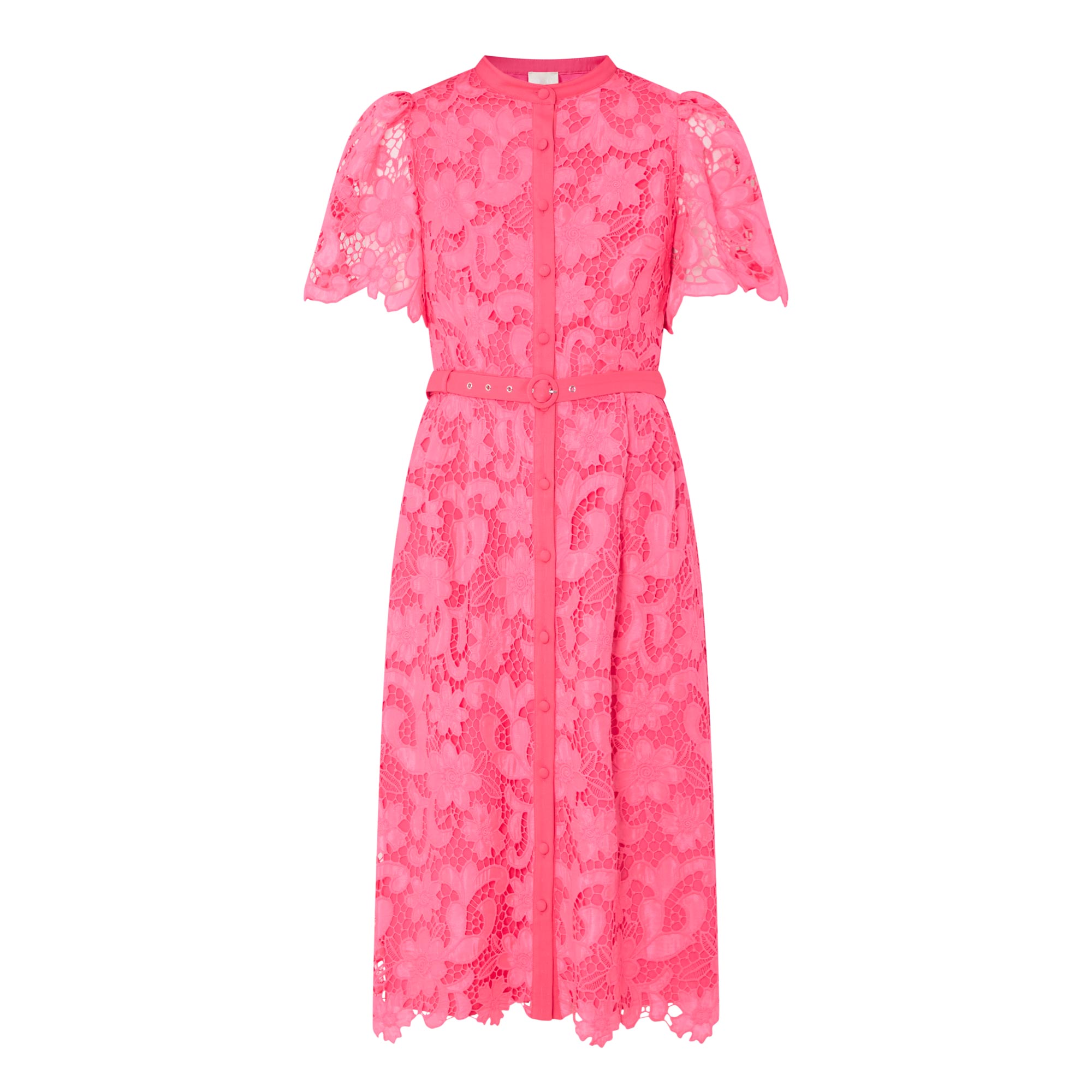 - Belted waist, round neck, button fastenings, midi length, short sleeves, lace design