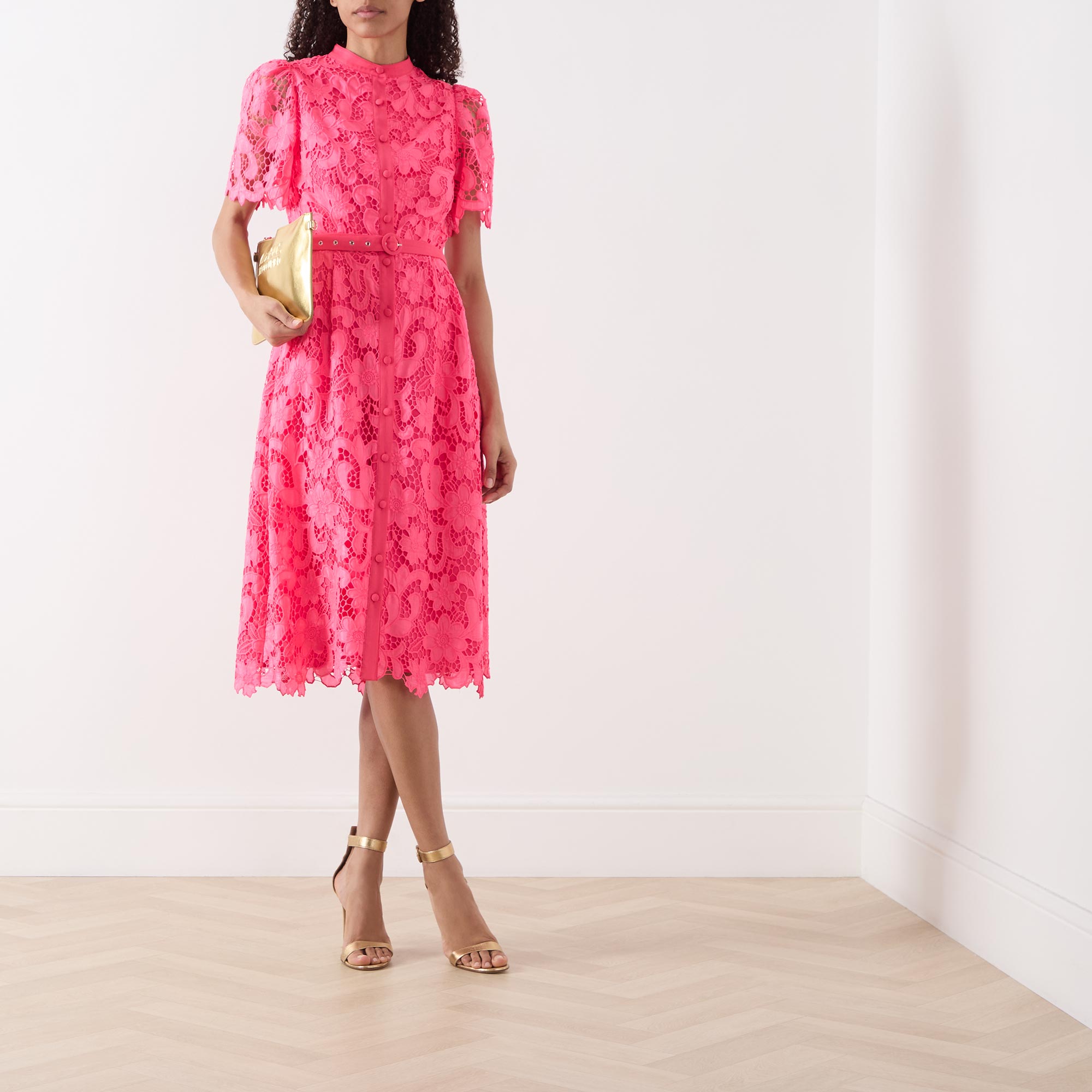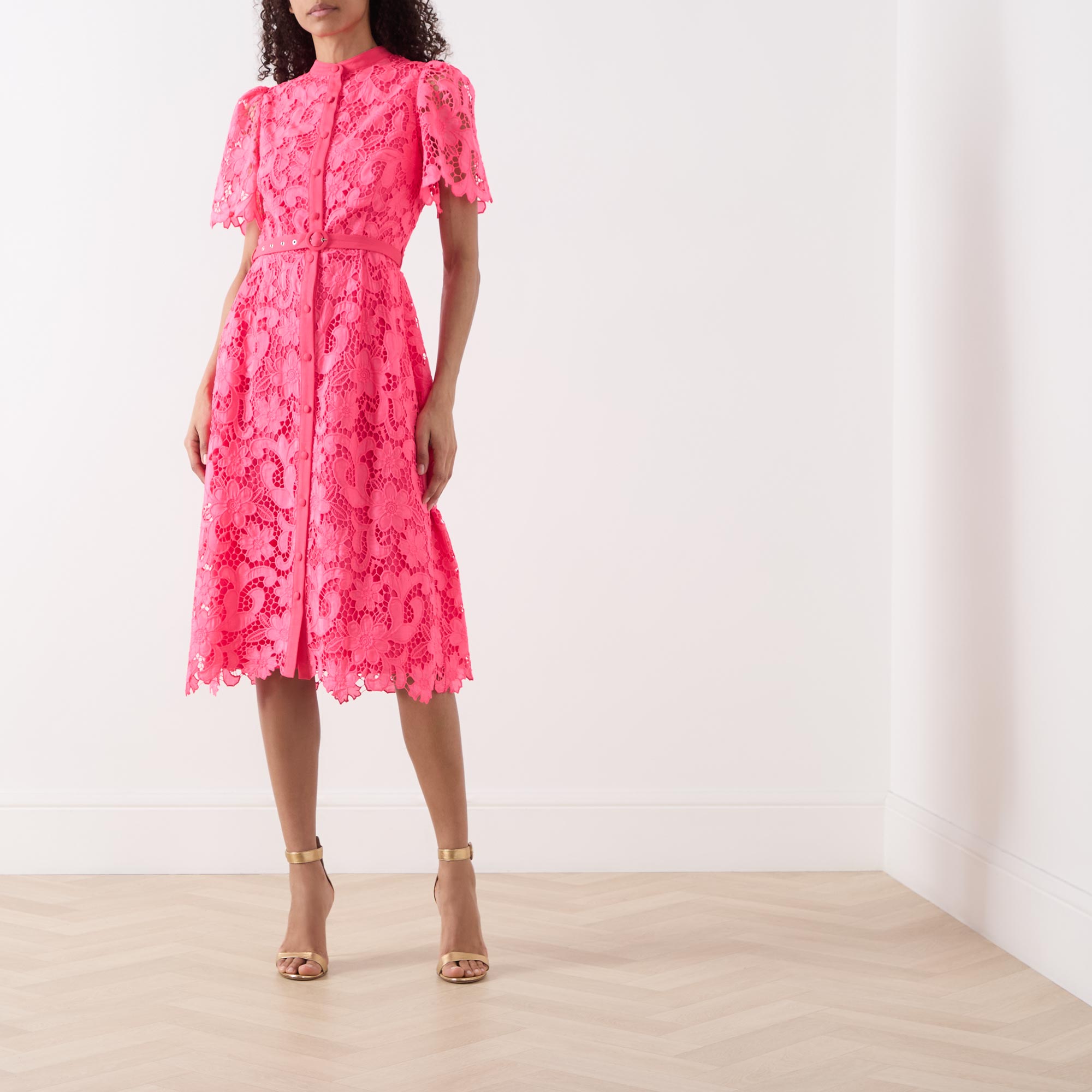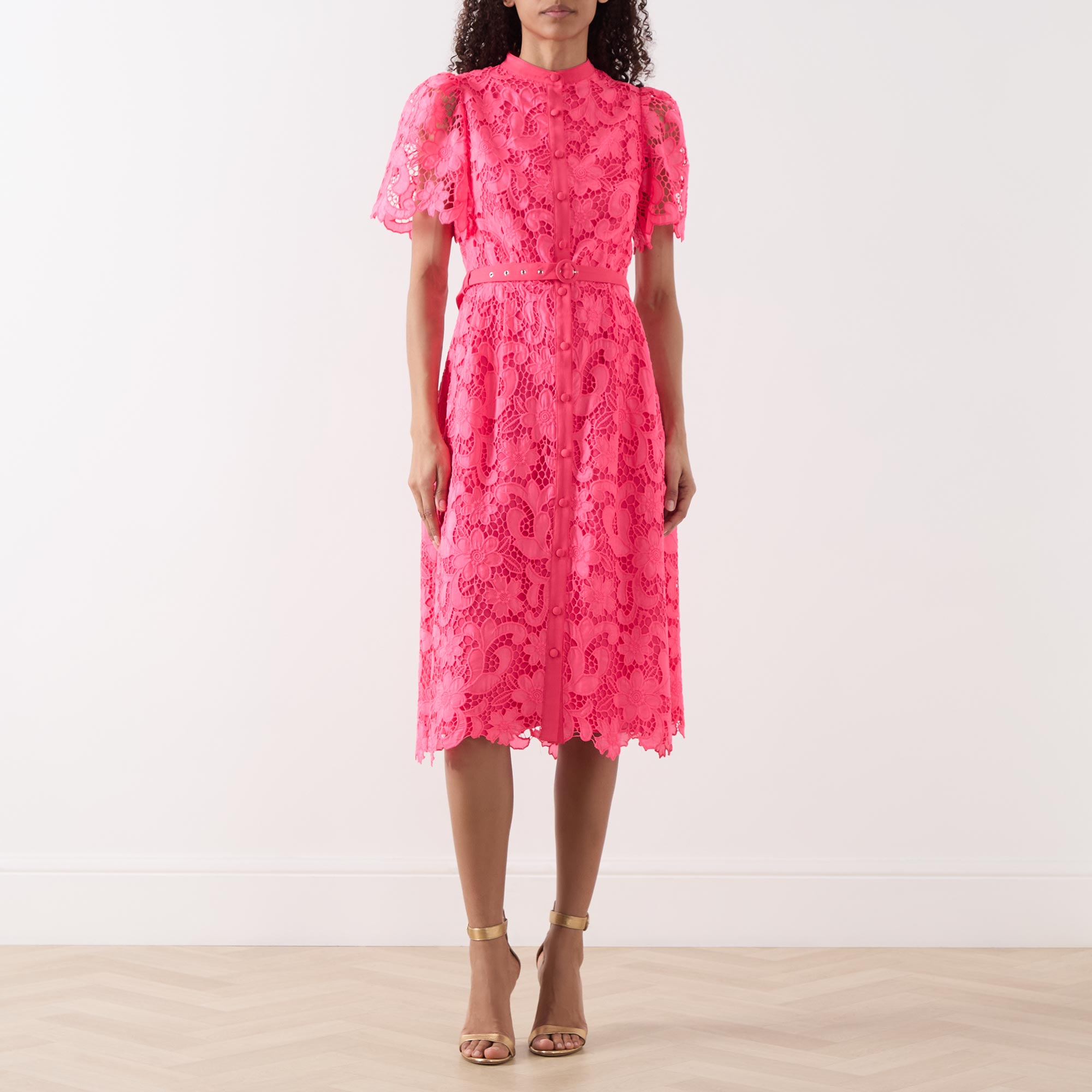 - Belted waist, round neck, button fastenings, midi length, short sleeves, lace design