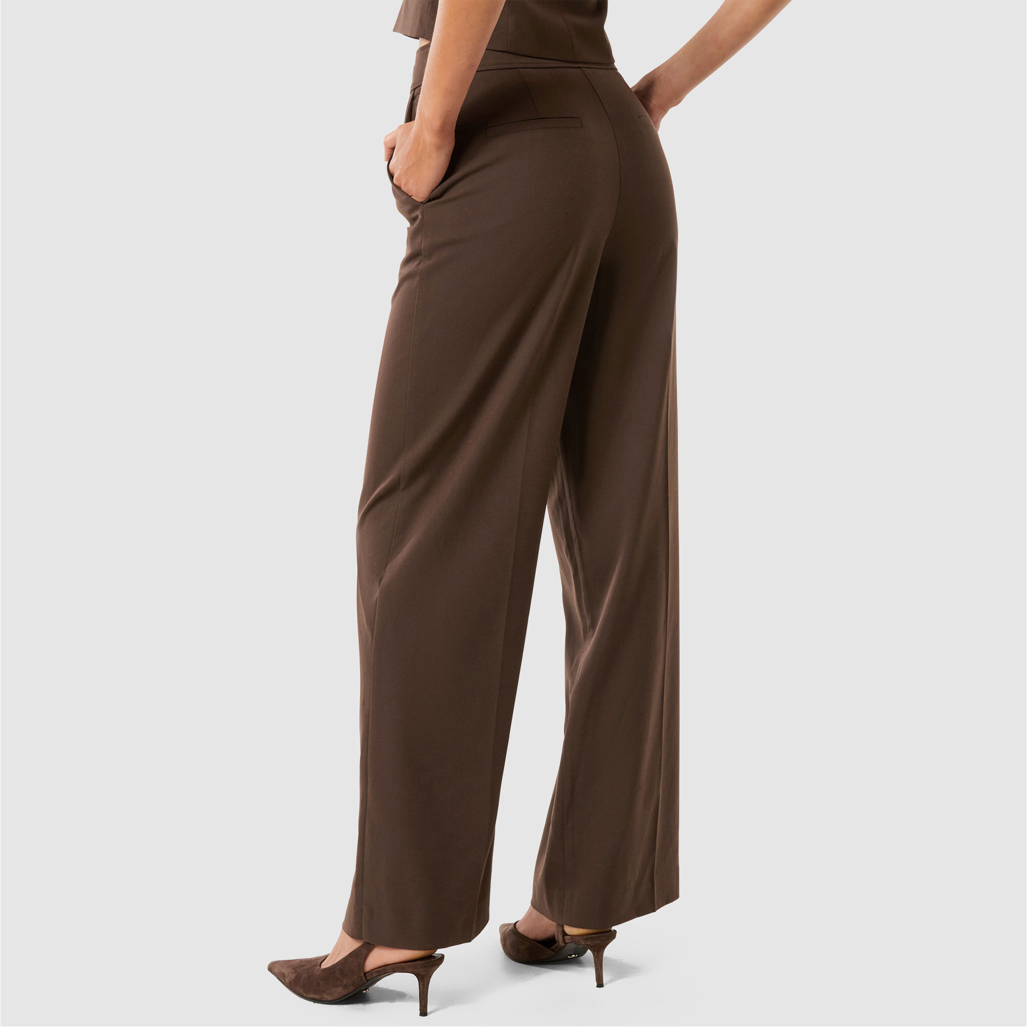 - Tailored style, wide-leg silhouette, woven fabrication, functional front pockets, centre pleats, back welts, asymmetrical button fastening