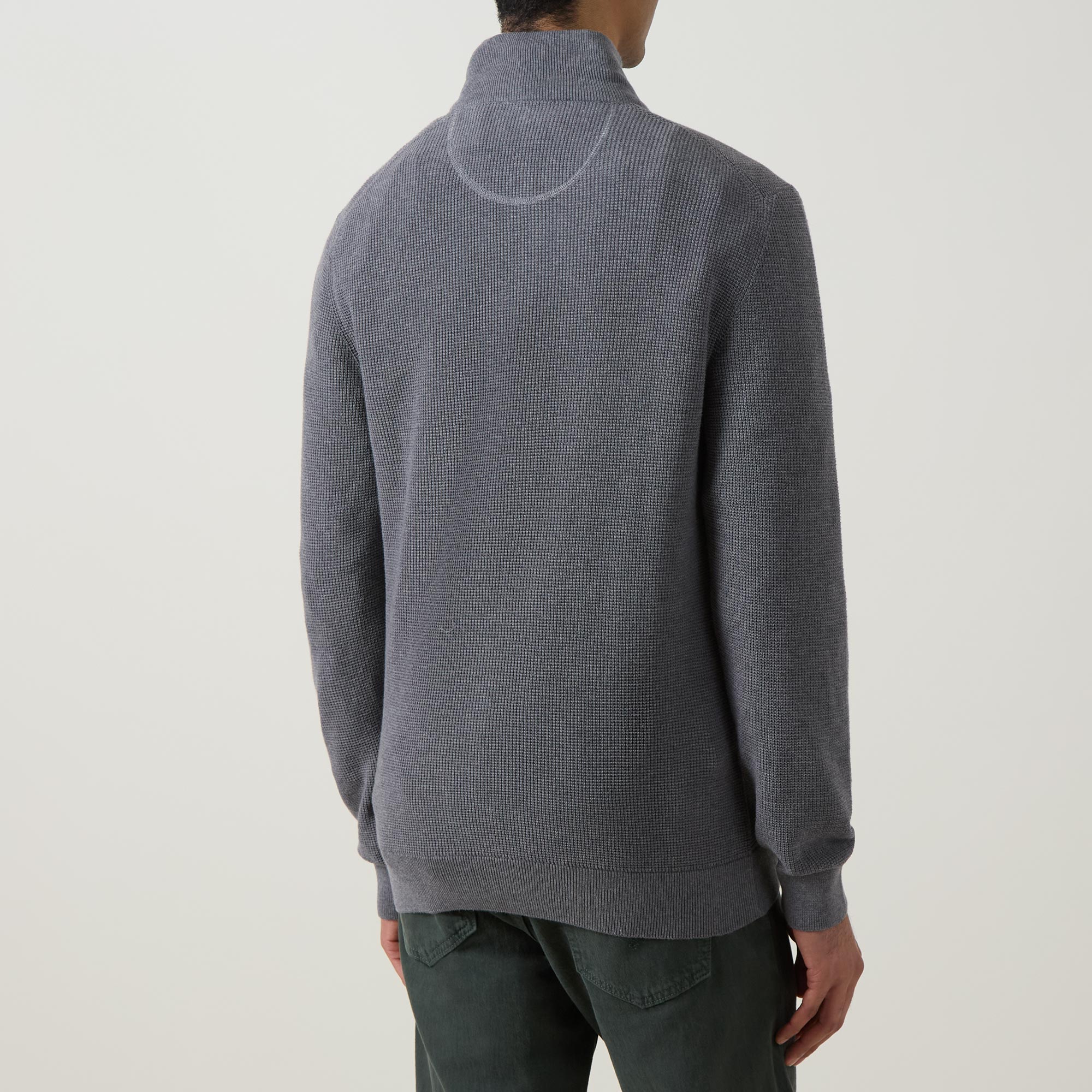 - Micro textured knit, long sleeves, stand collar, embroidered logo, ribbed cuffs, regular fit