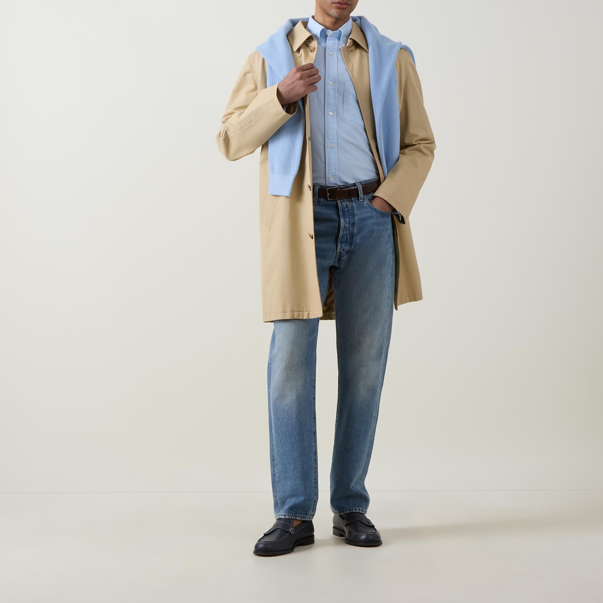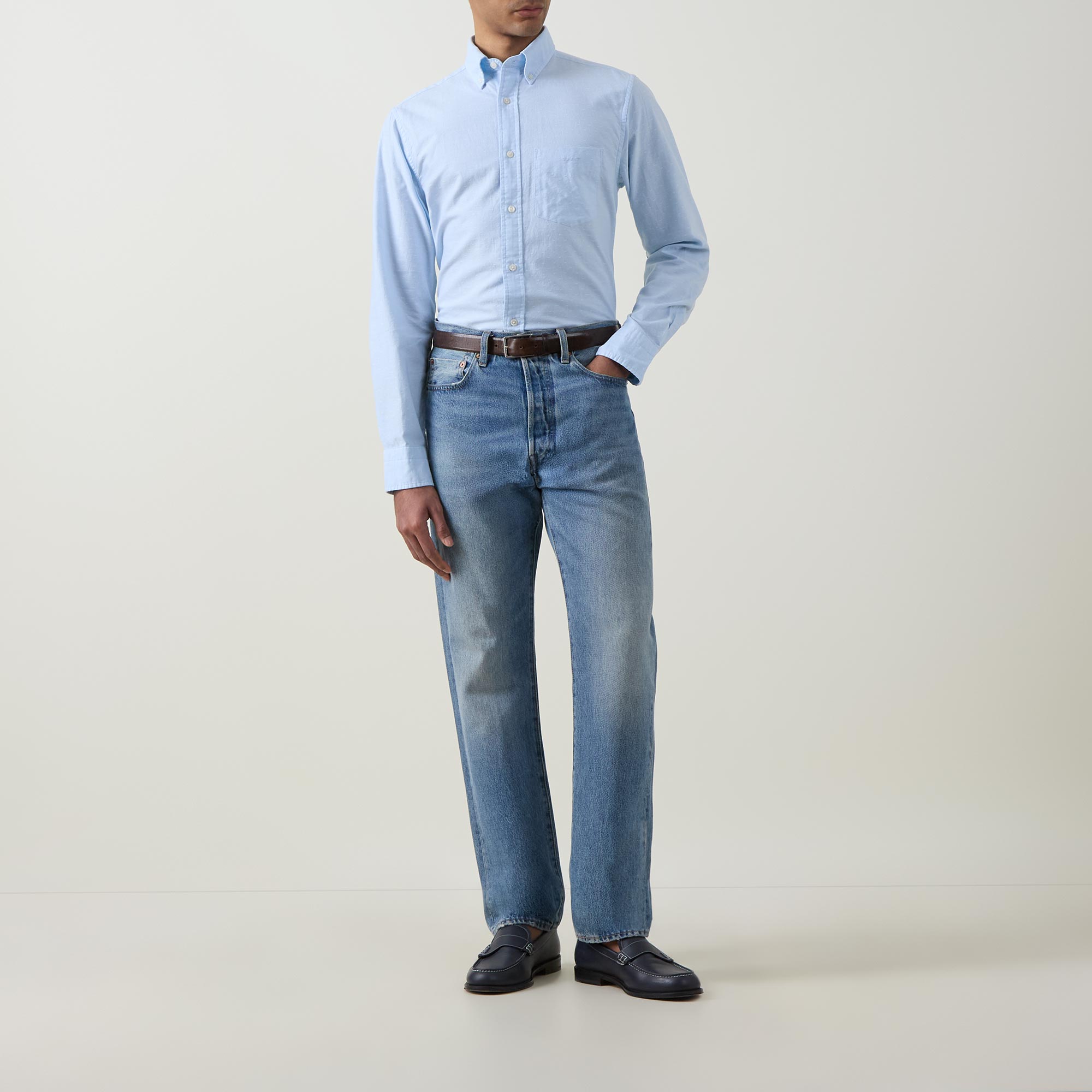 - Long sleeves, pointed collar, button fastenings, chest pocket, curved hem, buttoned cuffs, regular fit